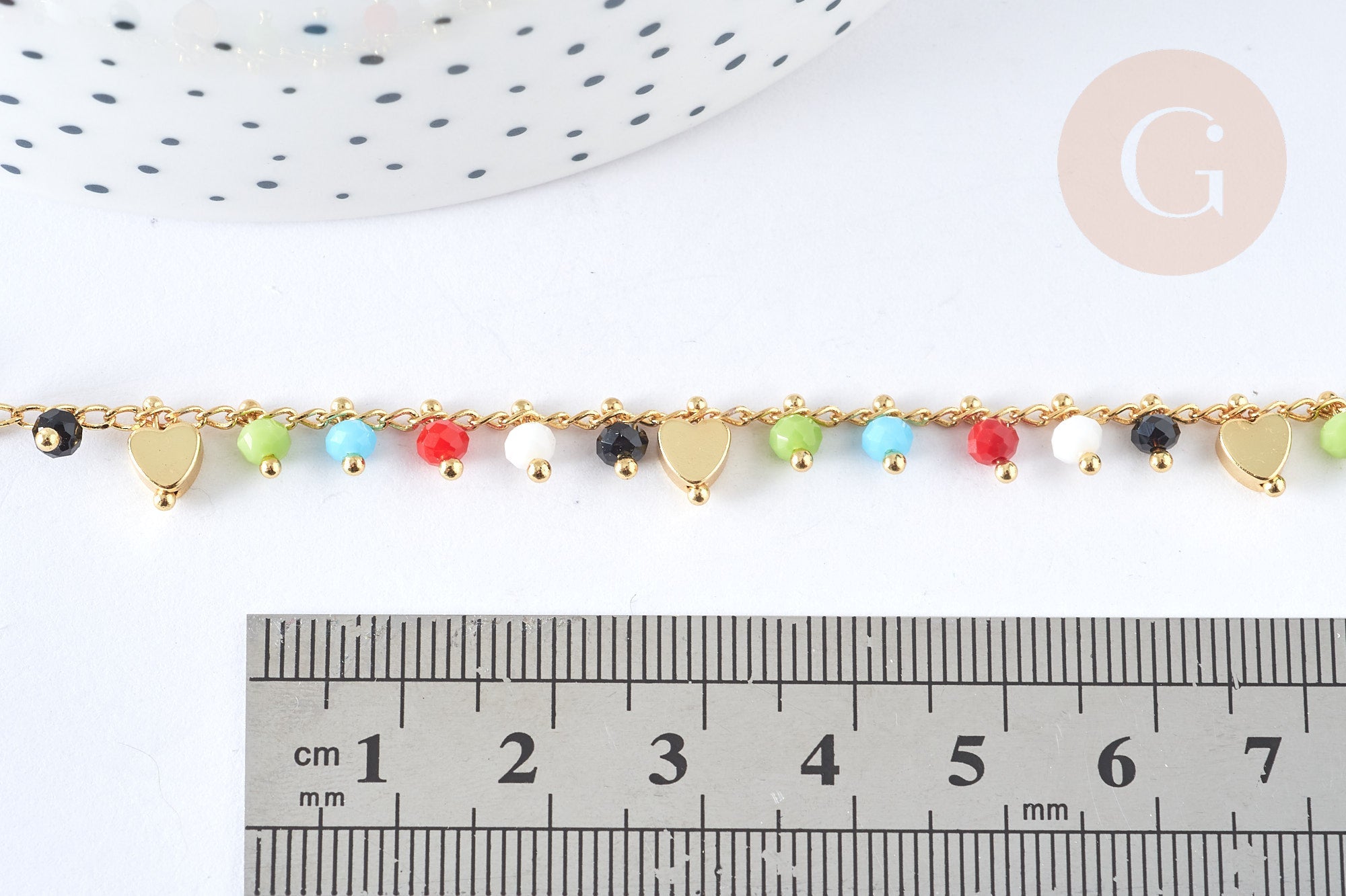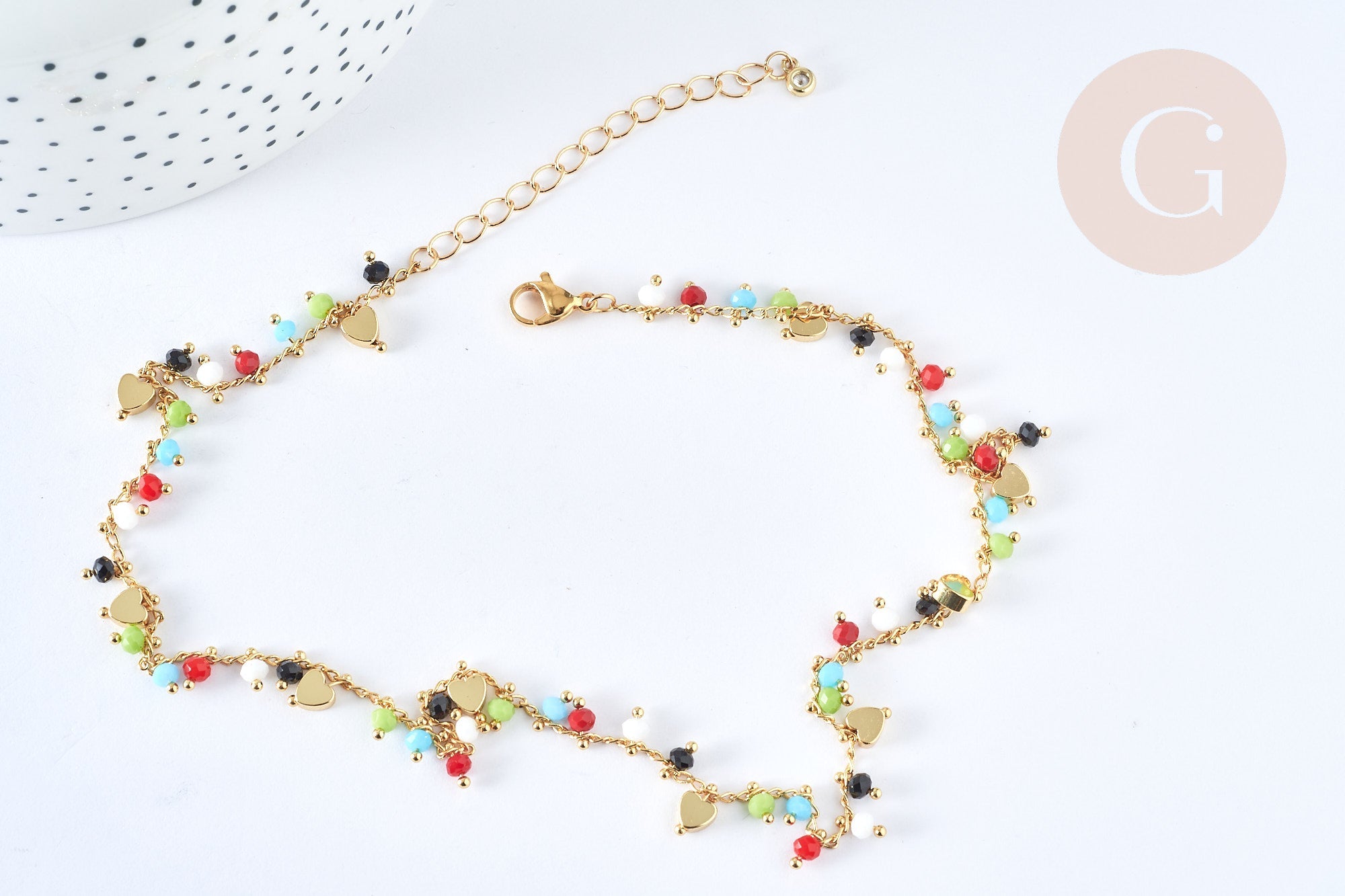 Déjate seducir por este collar de dijes ajustable con cuentas de vidrio y pequeños dijes de corazón sobre una cadena de latón dorado , que ya está equipado con un mosquetón para facilitar la fijación, en acero inoxidable 304. ¡Llévalo alrededor del cuello sin miedo a perderlo!