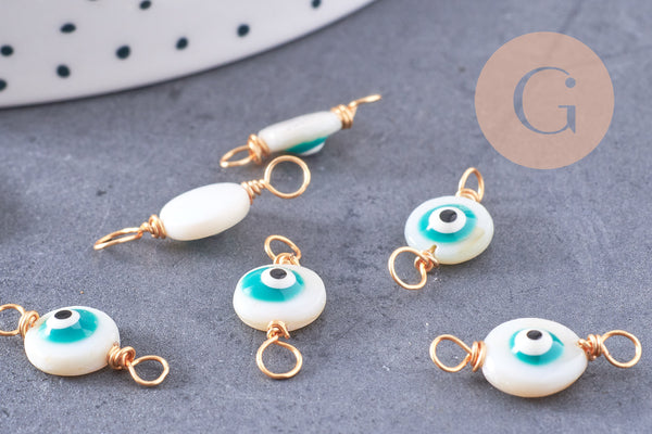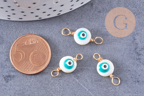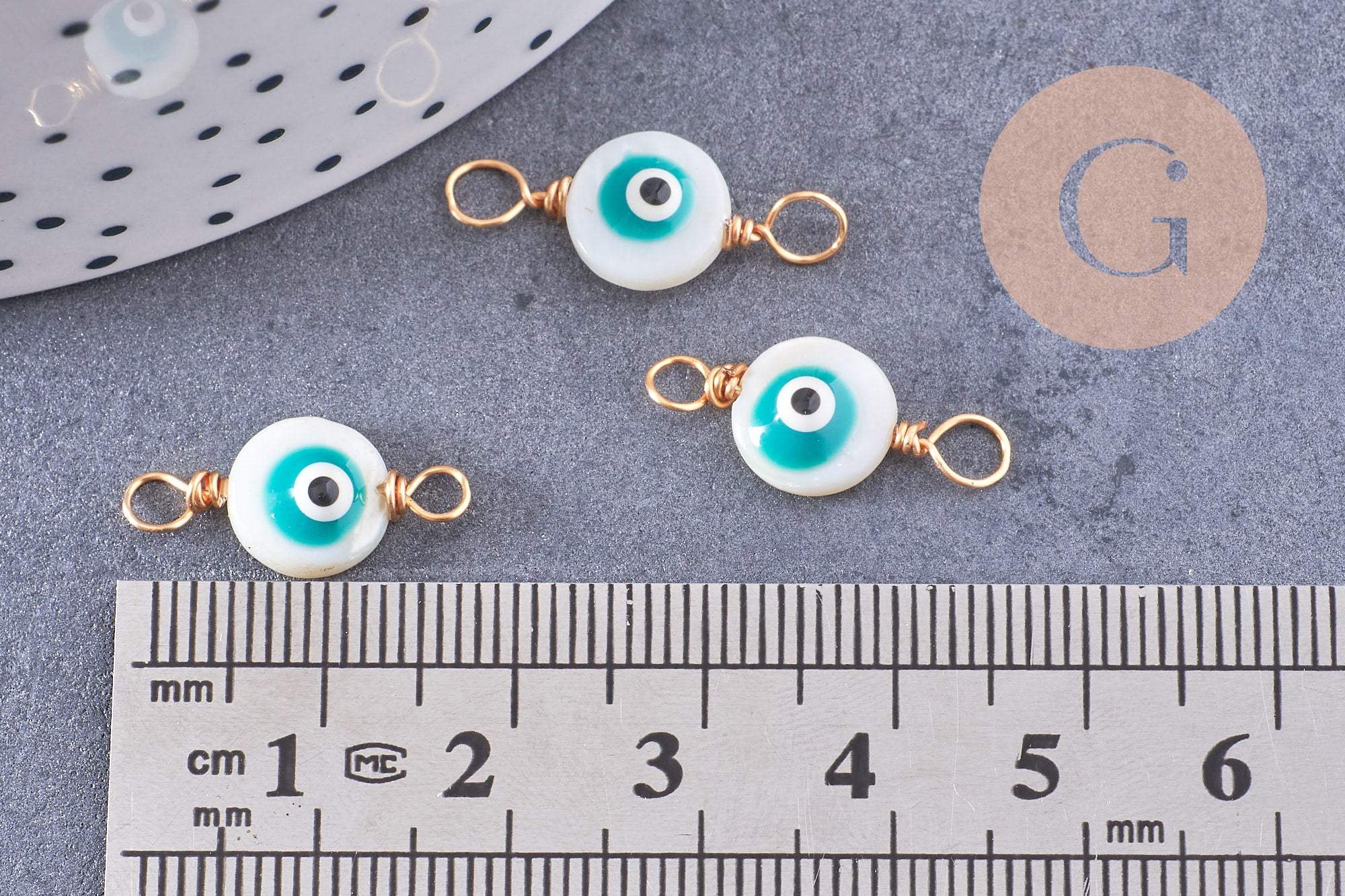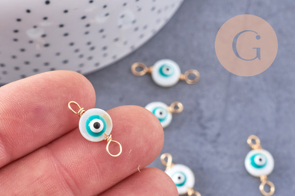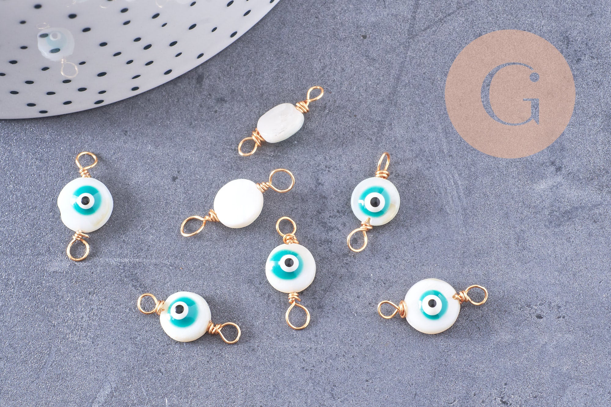 Déjate seducir por este conector de zamac de nácar blanco y baño de oro , que representa el ojo de la suerte . Ideal para añadir un toque místico y protector a tus creaciones.
