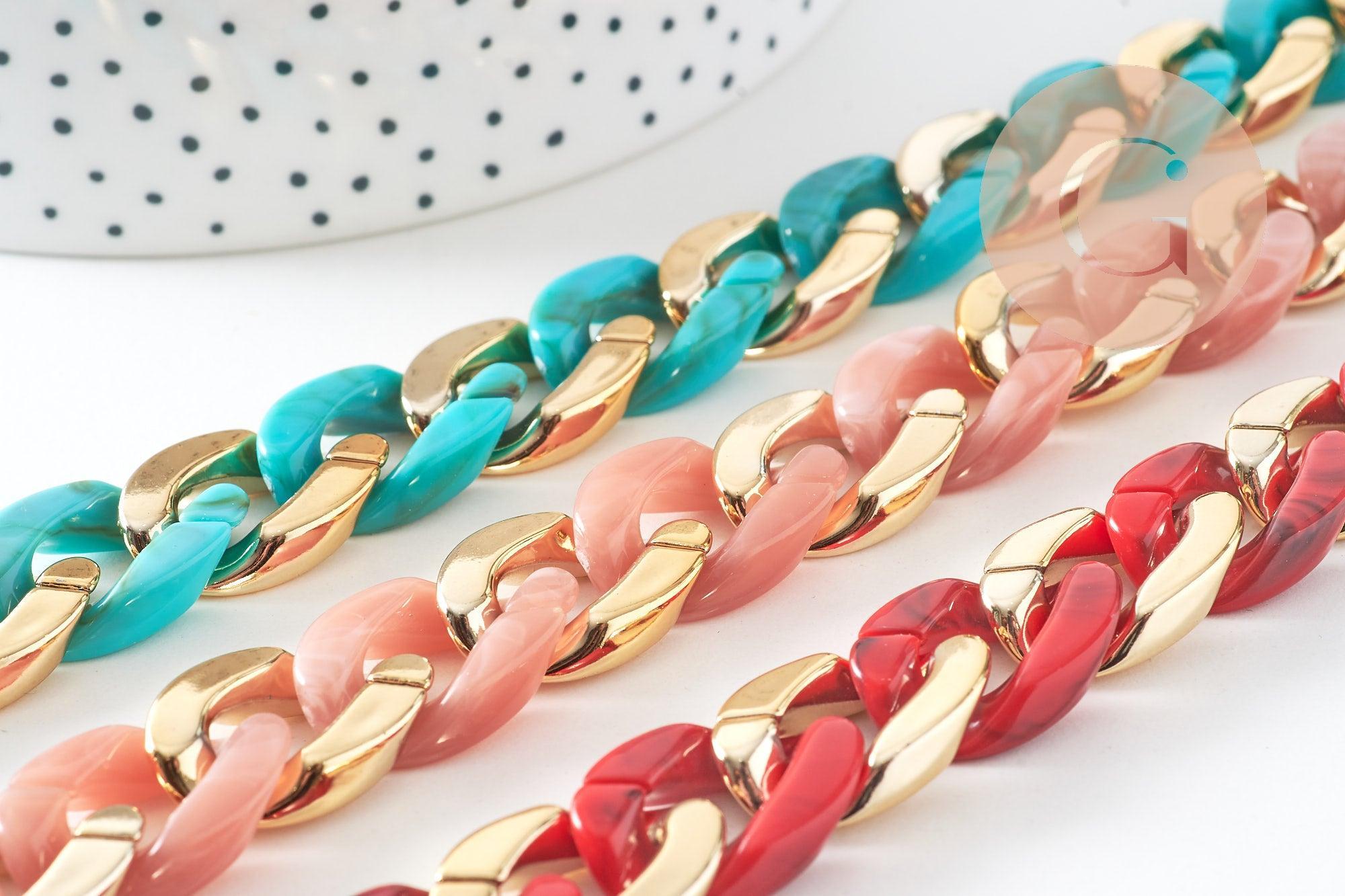 Una gran cadena de plástico acrílico con un colorido patrón de carey y un eslabón de aluminio dorado para crear joyas modernas y originales.