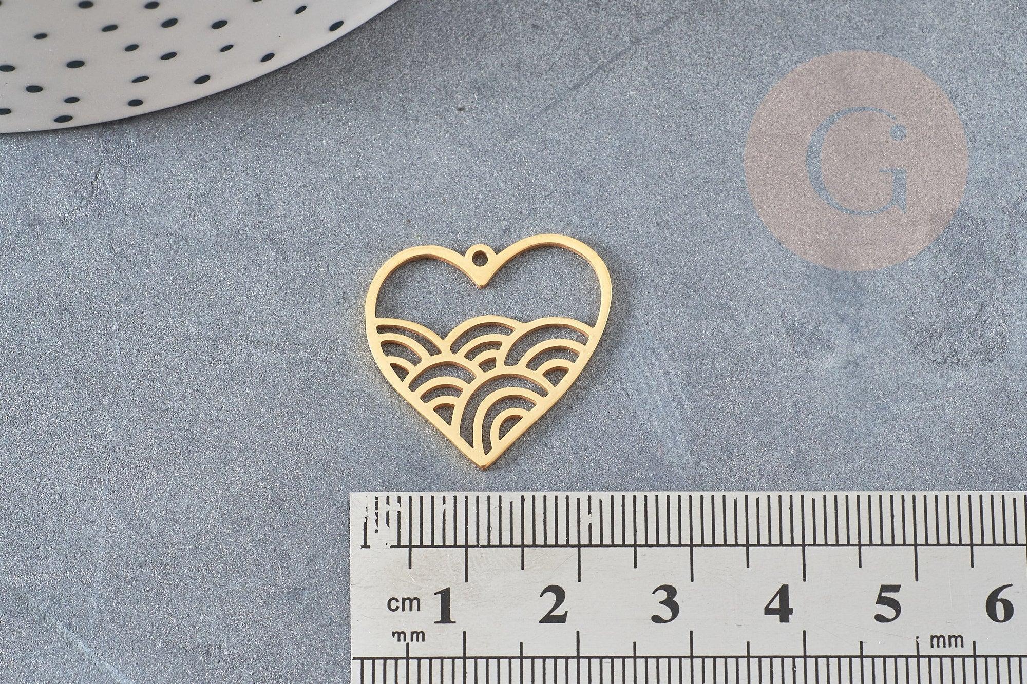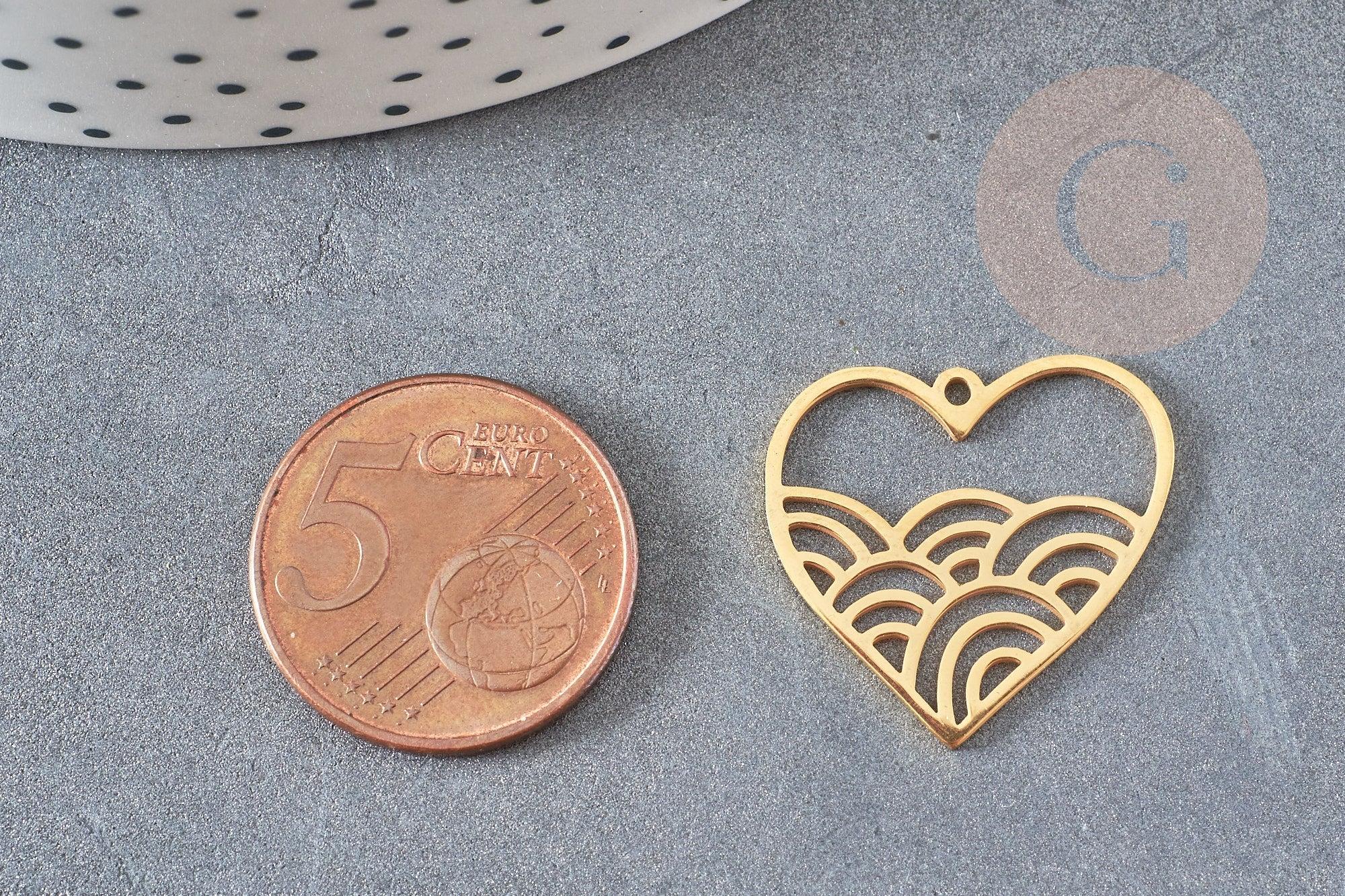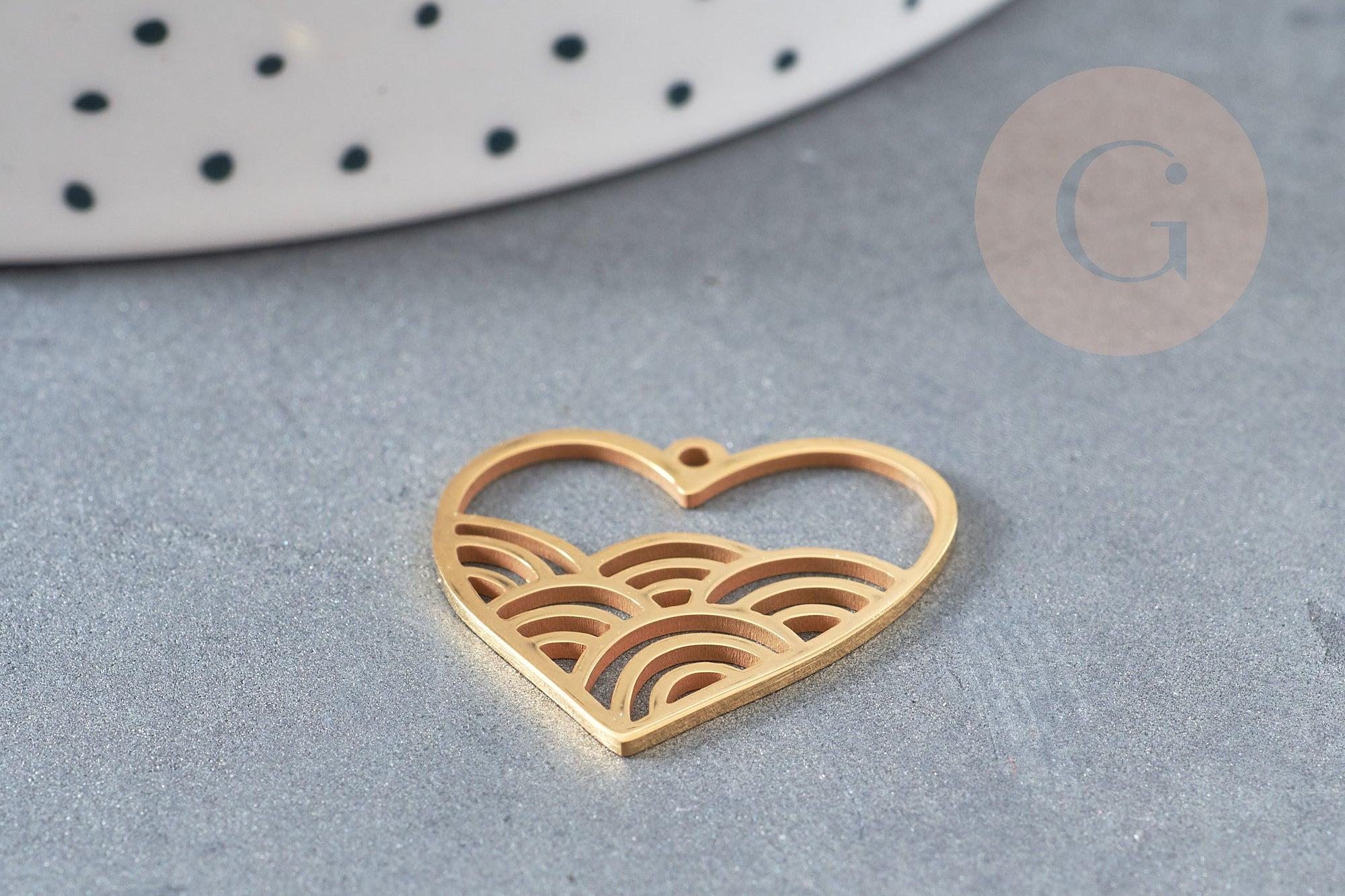 Un colgante de corazón de acero inoxidable bañado en oro decorado con un patrón de ondas japonesas. Para combinar poesía y romanticismo con tus joyas DIY, déjate seducir por este colgante.