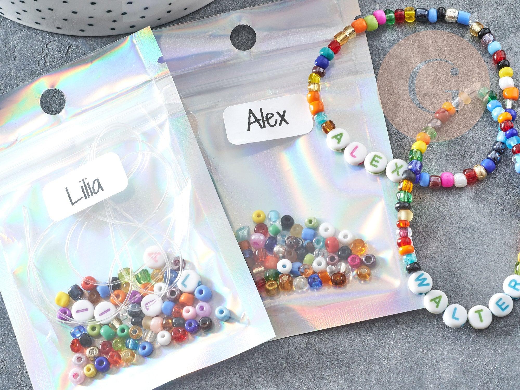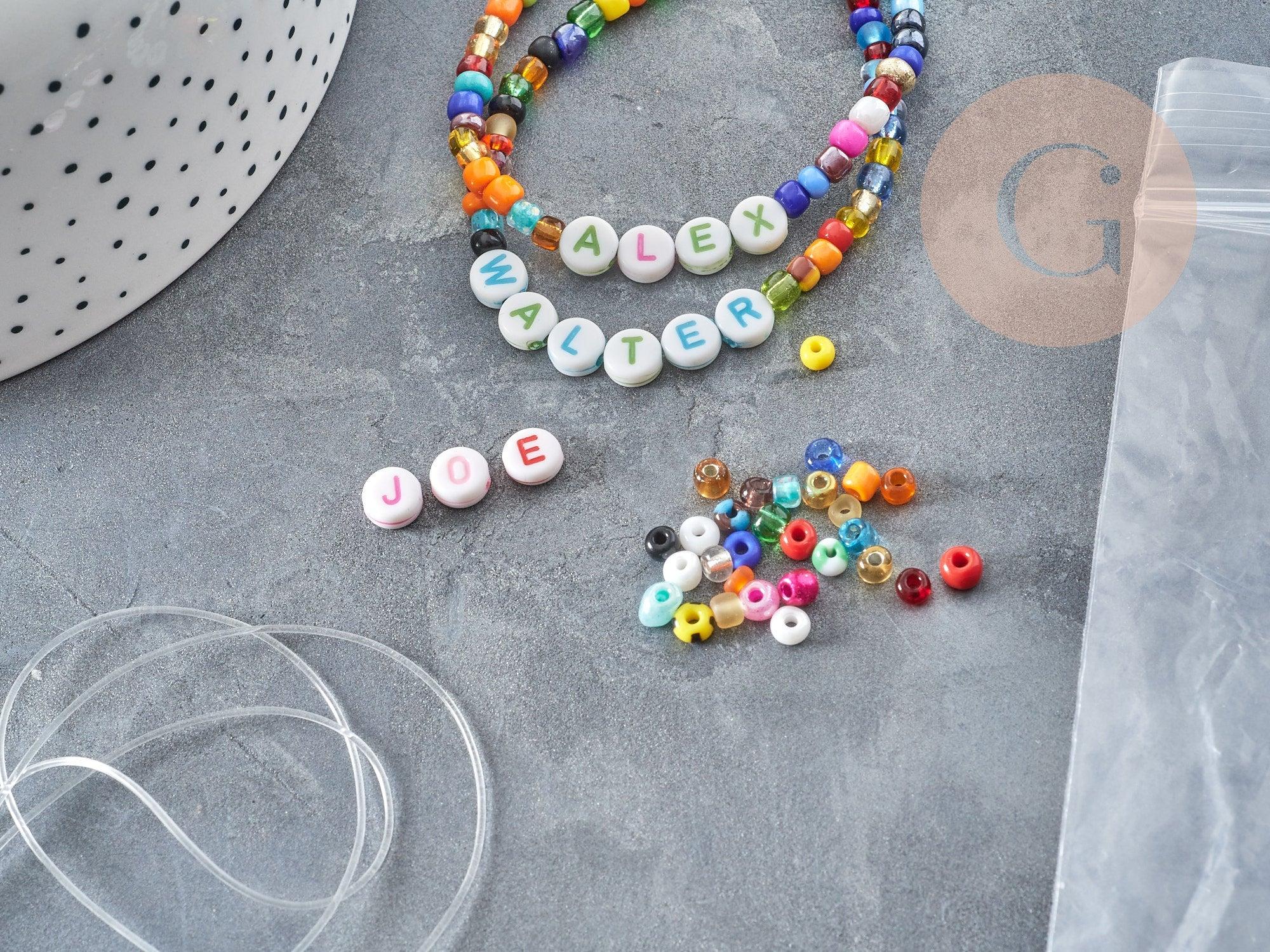 Cada kit personalizado está cuidadosamente preparado con cuentas del abecedario para componer el nombre de tu elección , acompañado de una variedad de cuentas de colores.
