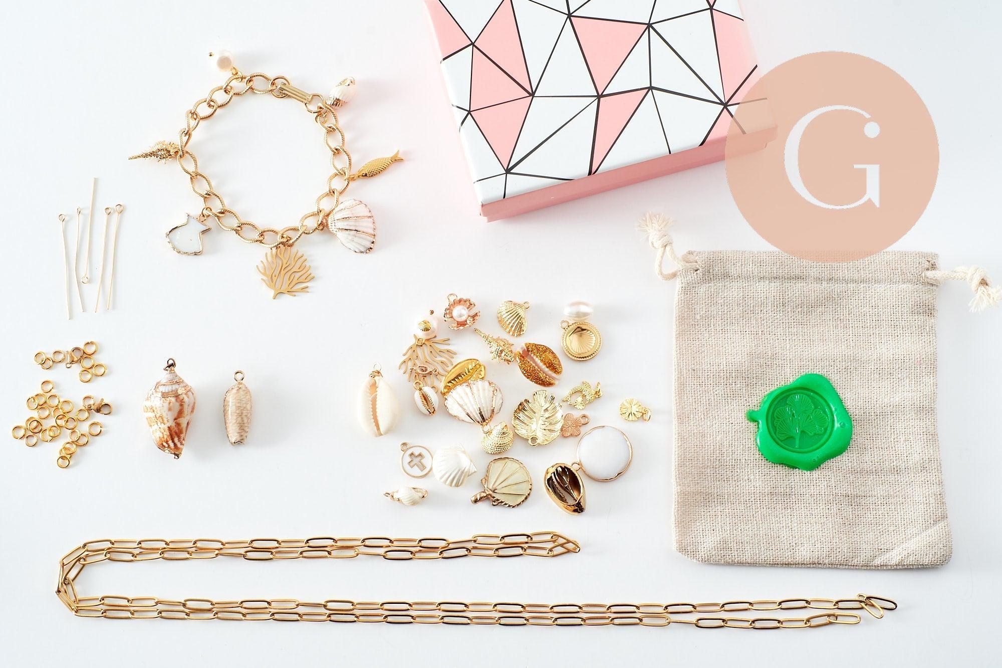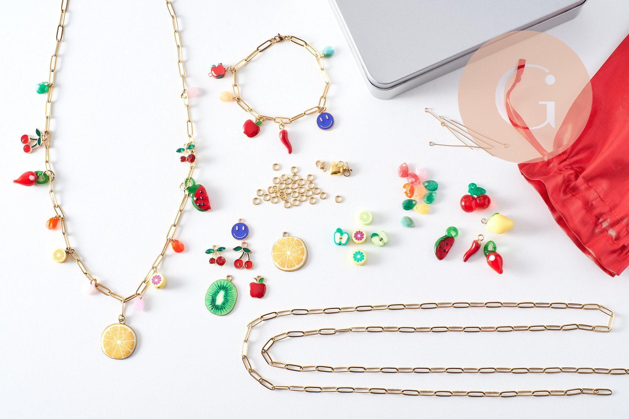 Kit de collar y pulsera con dijes de temática mística, oceánica o frutal. Cajas y kits para crear bisutería DIY, x1 (G9554)