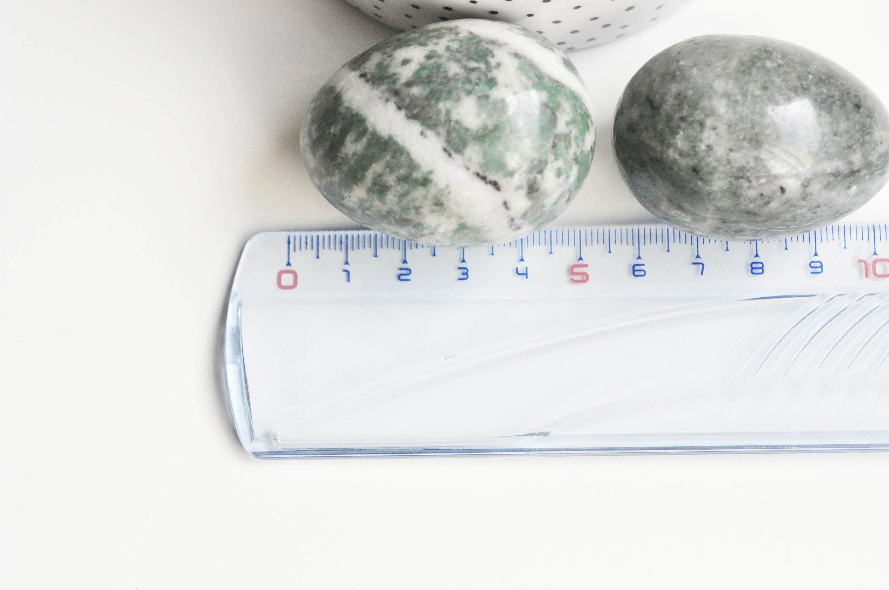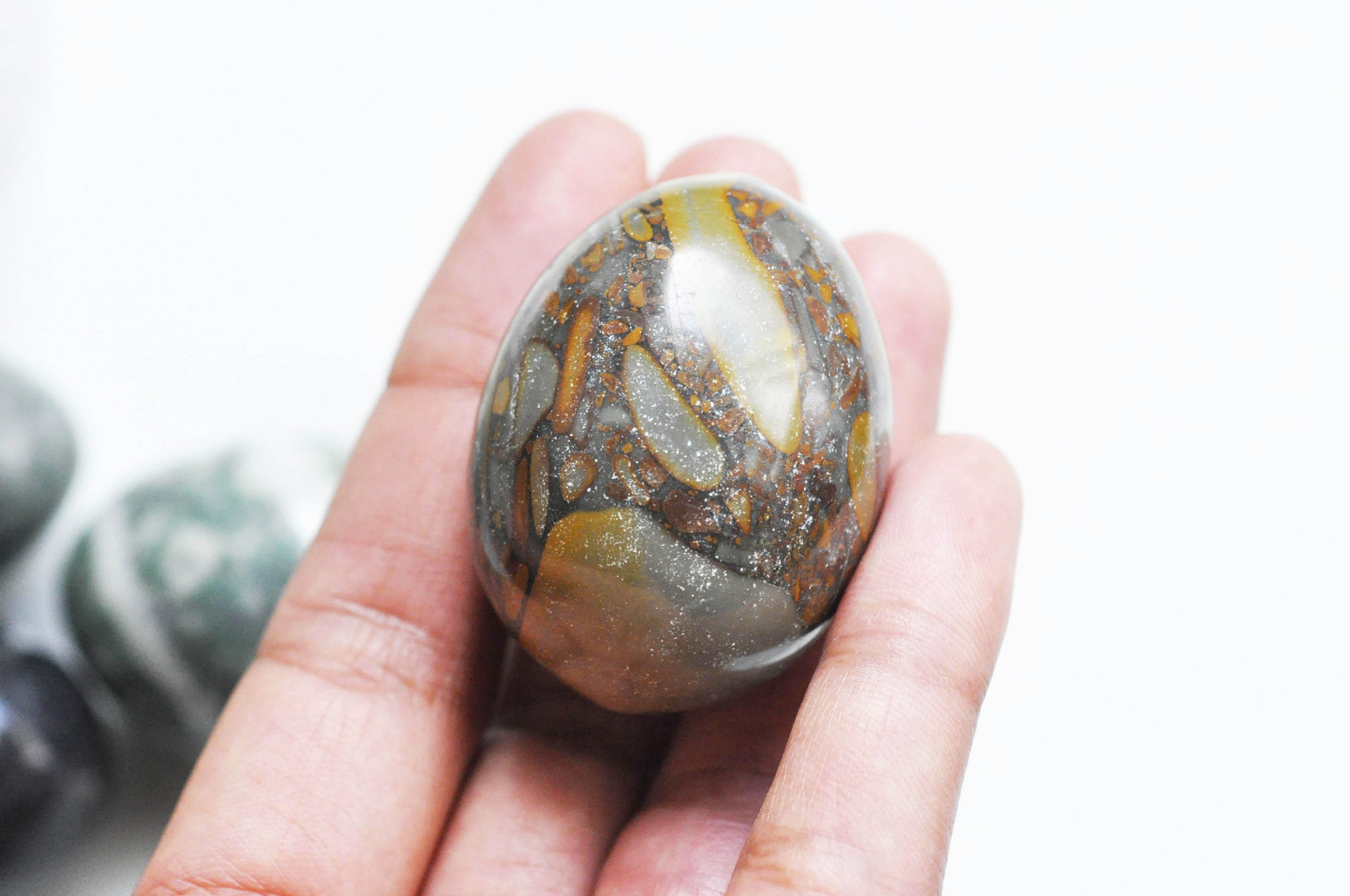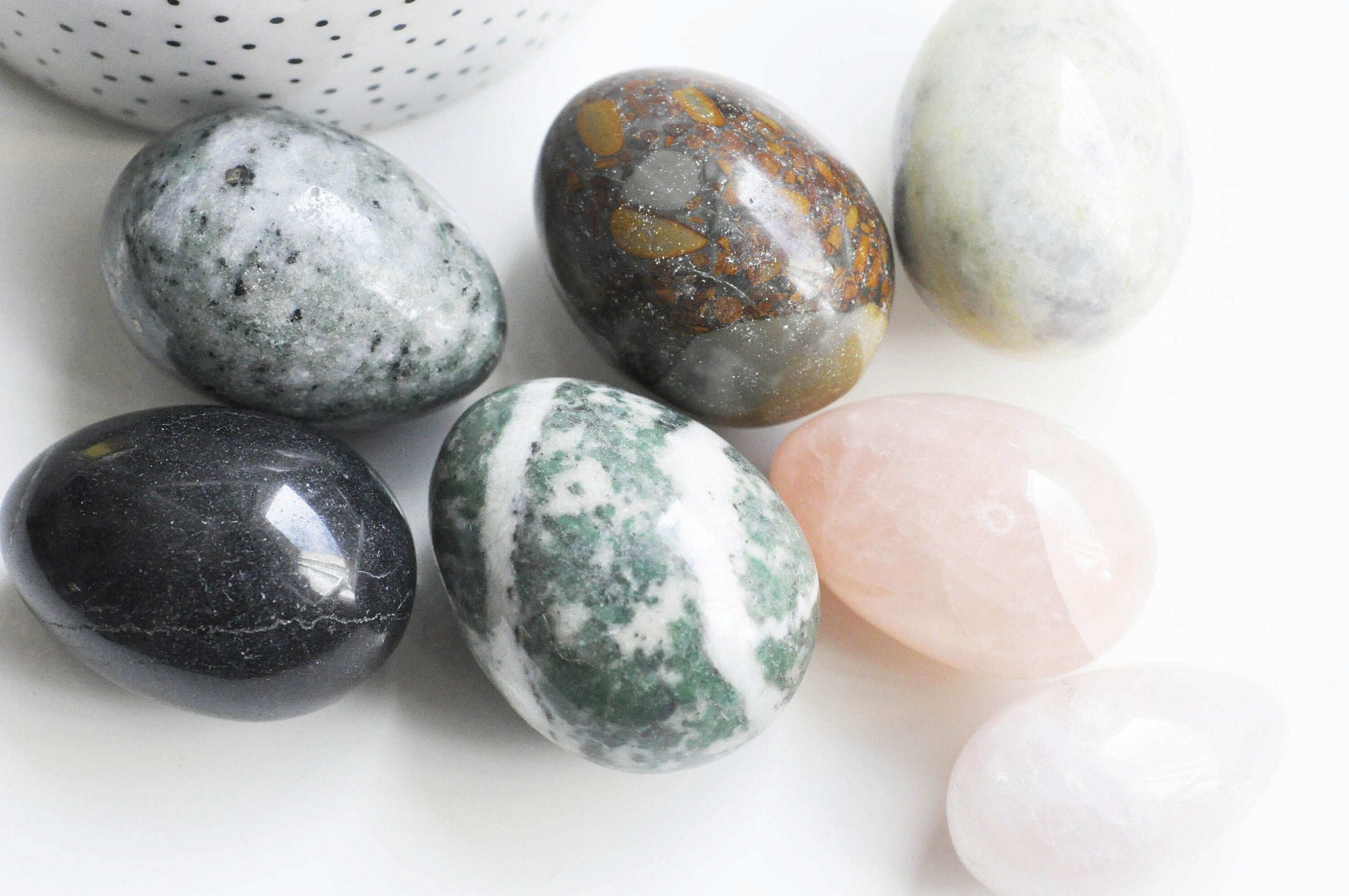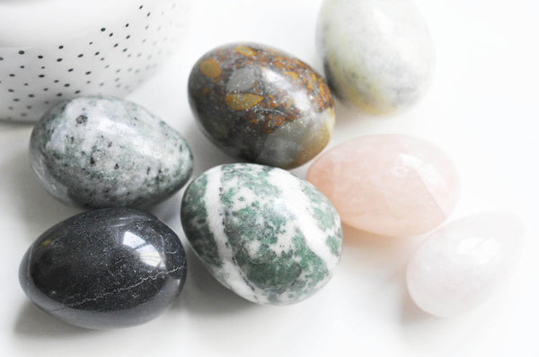 Huevos decorativos o de litoterapia, sin perforar, realizados en piedra natural.