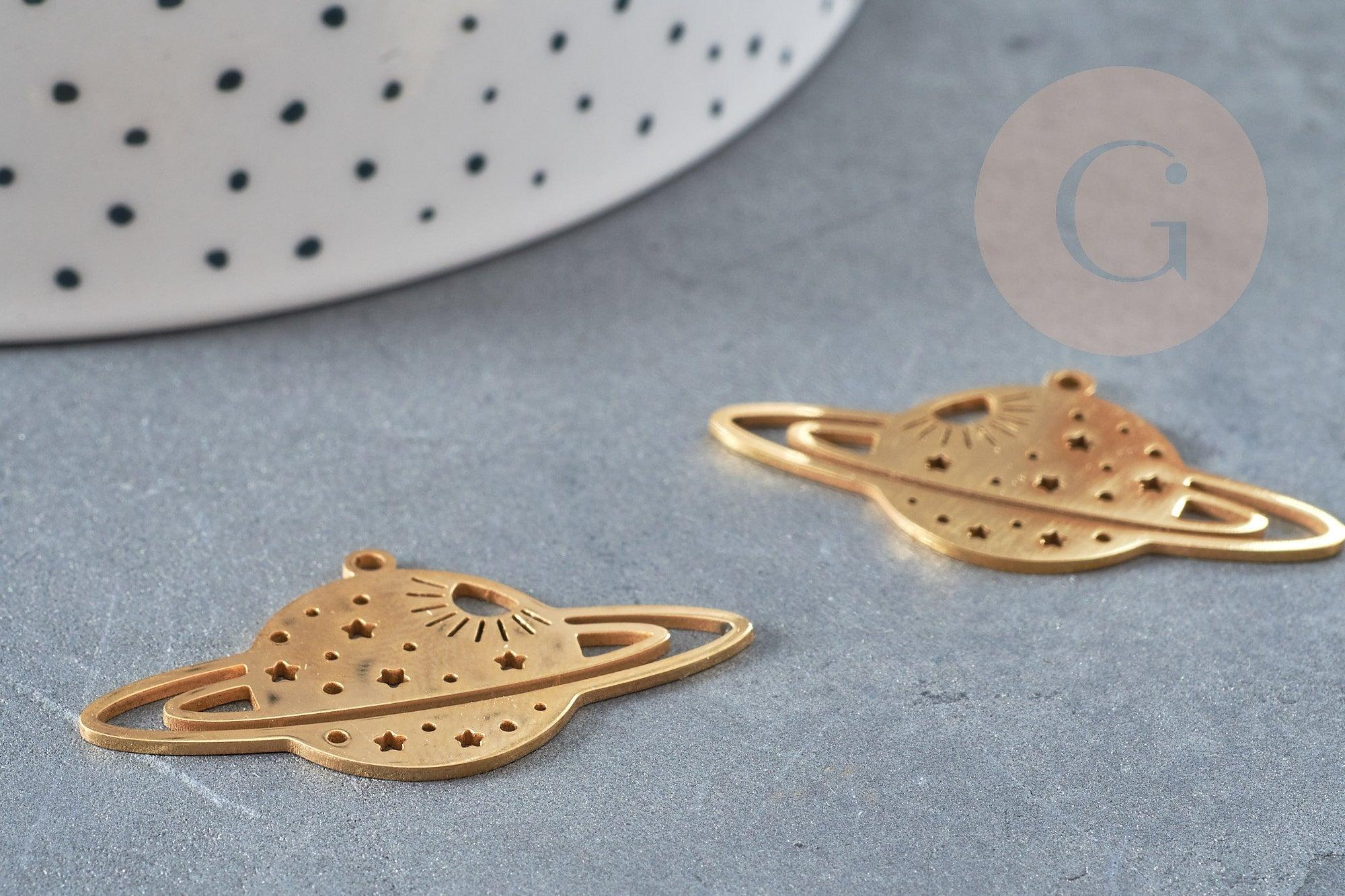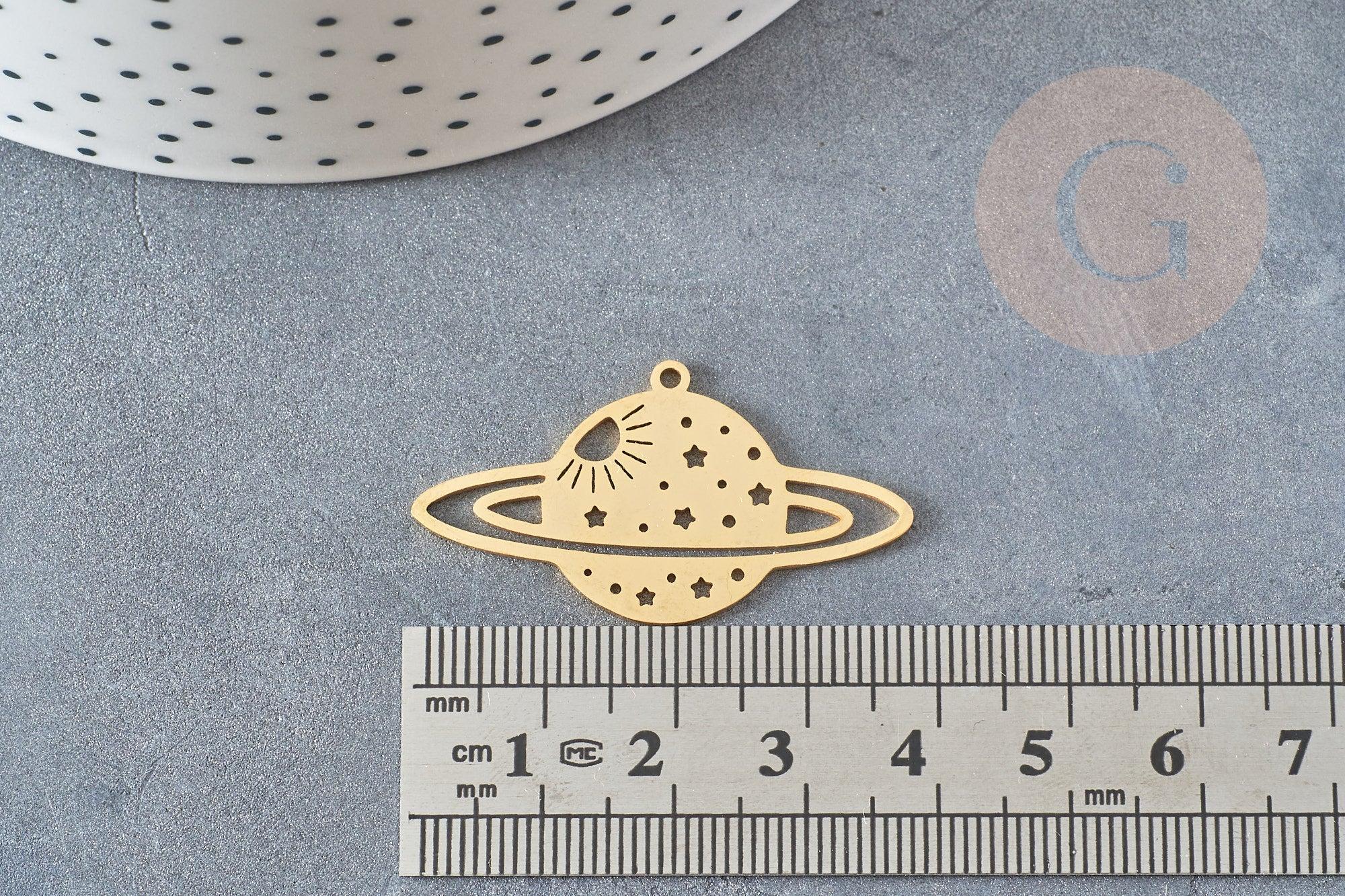 Un adorable colgante de planeta decorado con una estrella ahuecada en acero inoxidable bañado en oro.