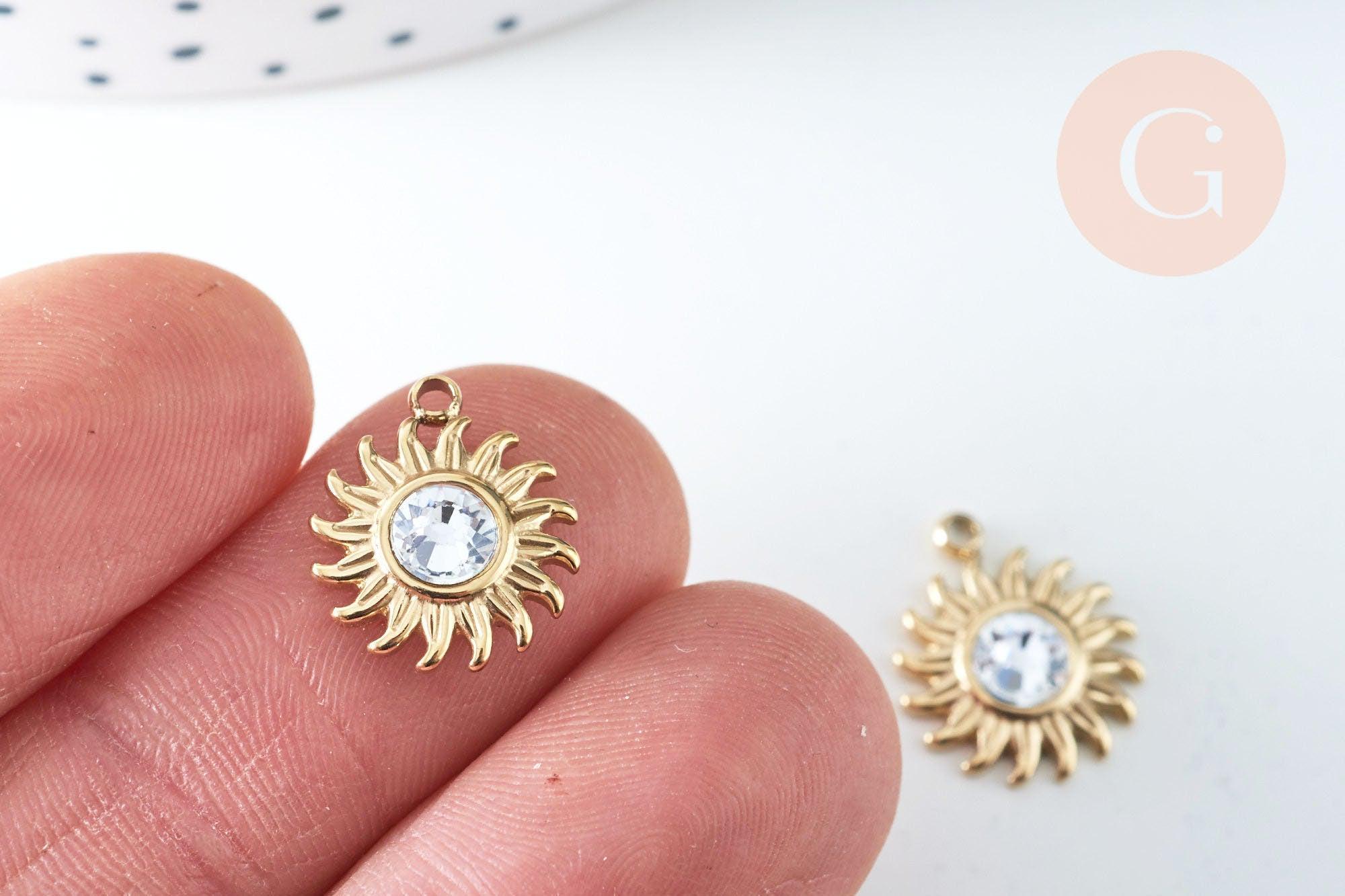 Pendentif acier doré soleil cristal 15mm, breloque doré, acier inoxydable doré, pendentif sans nickel, création bijoux, x1 G6348