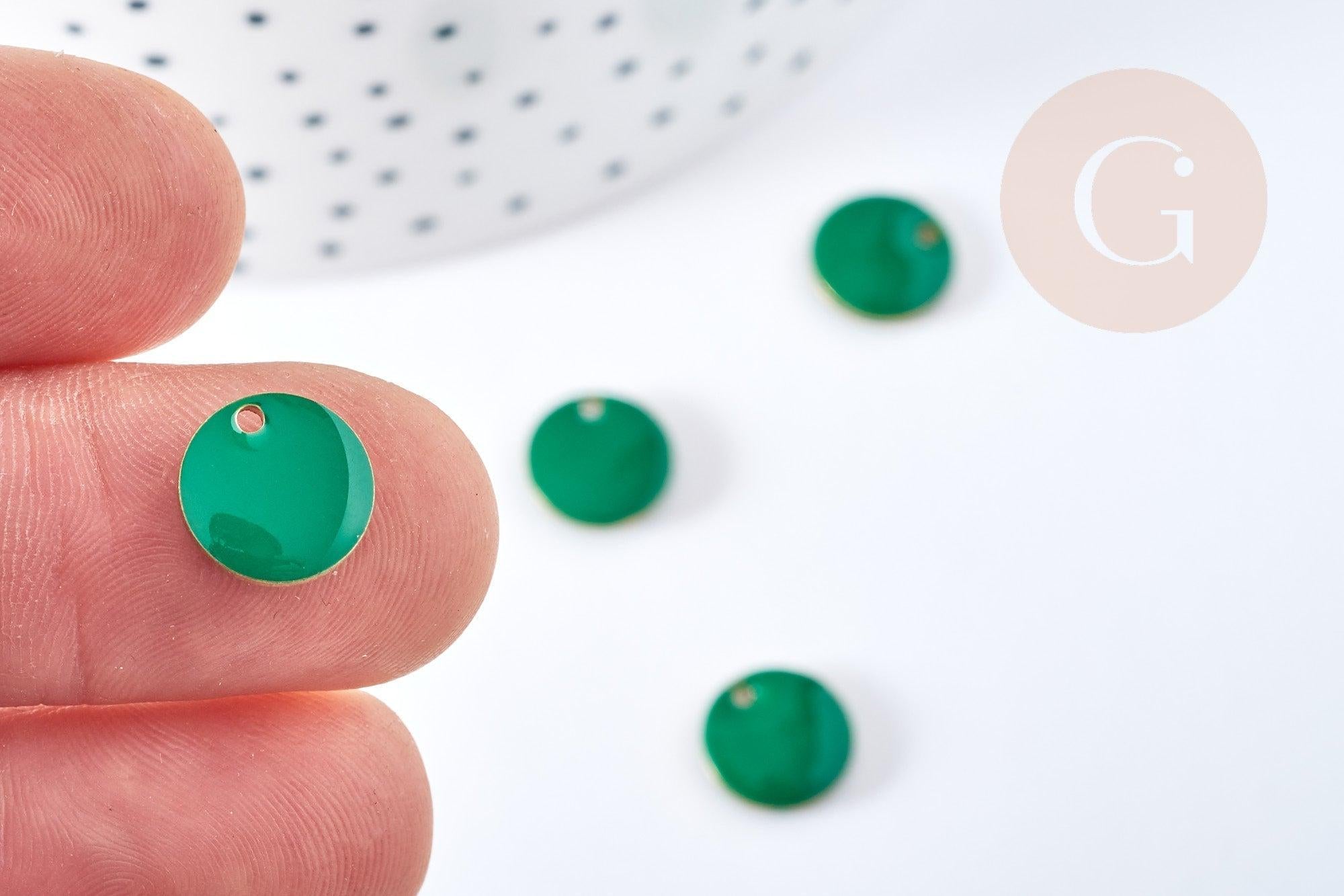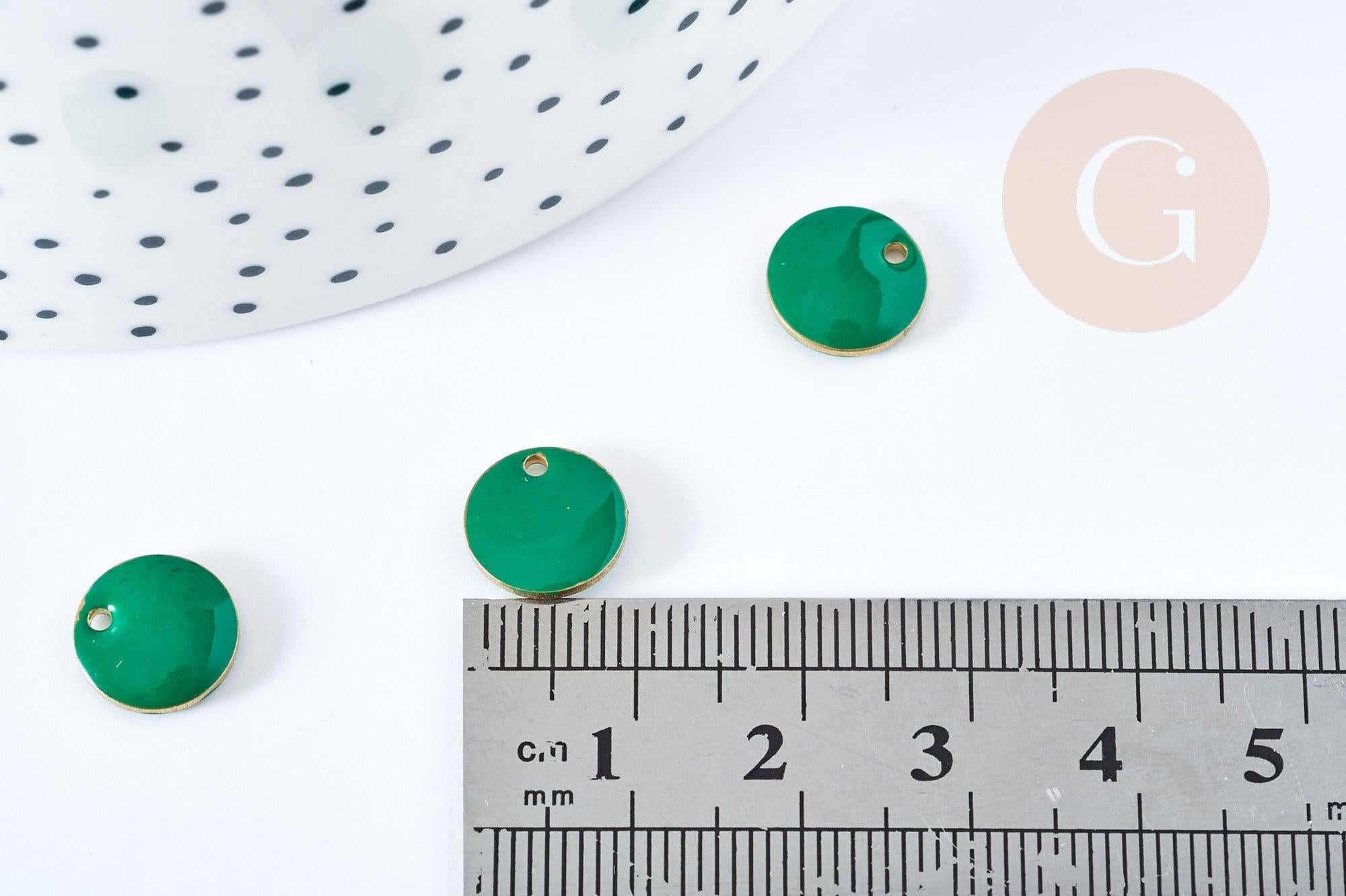 pendentif breloque plate ronde en laiton brut émail vert 10mm, x 5 (G8553)