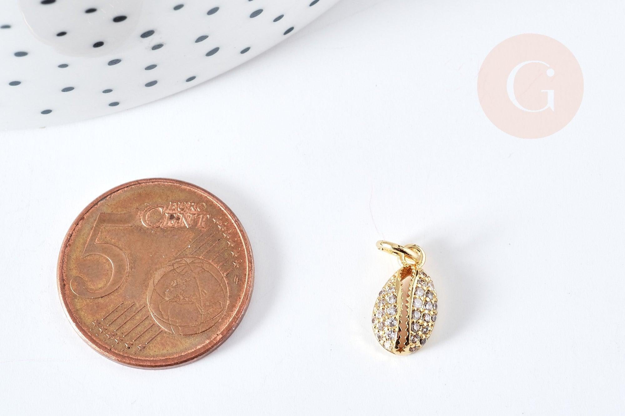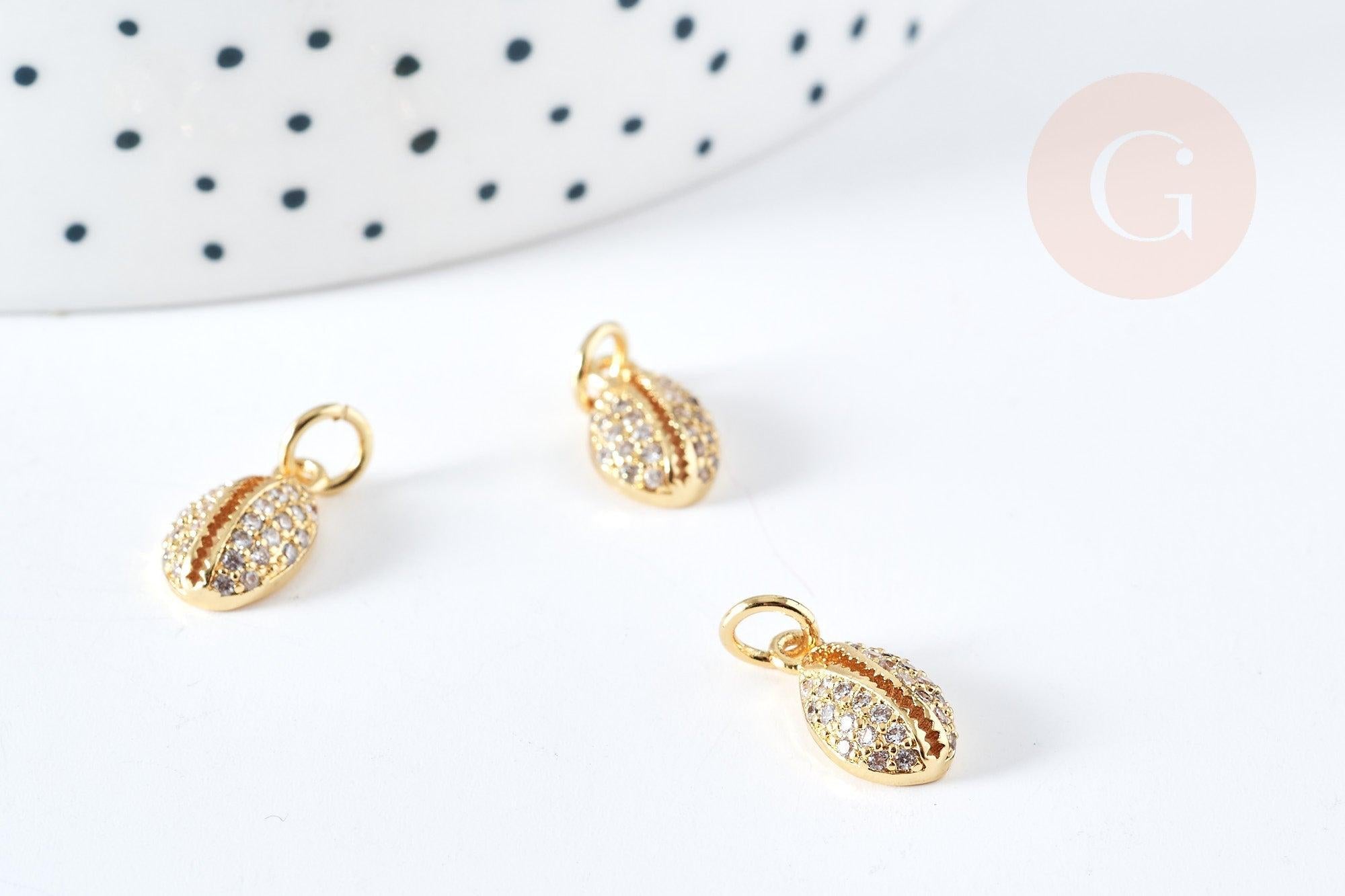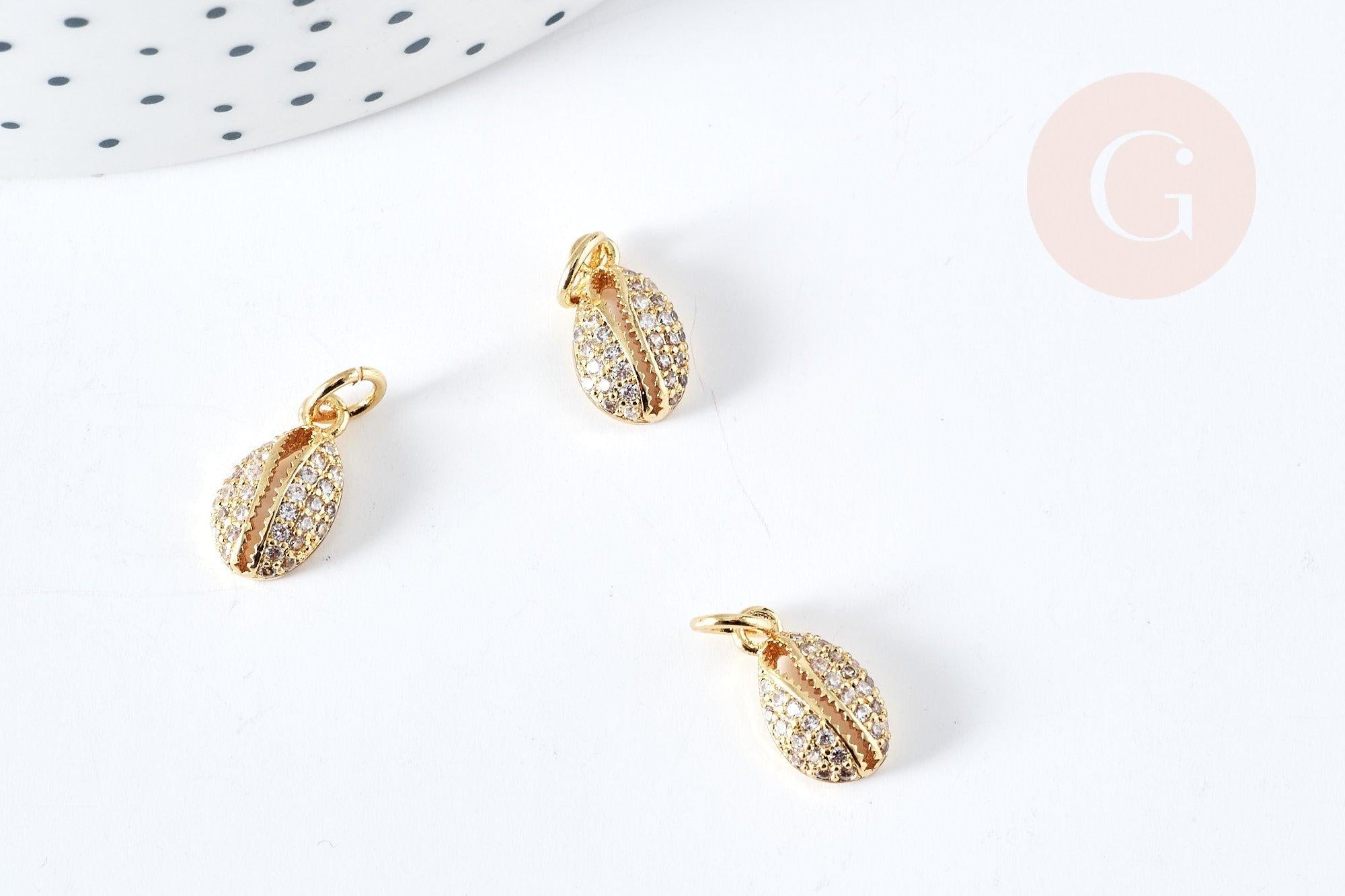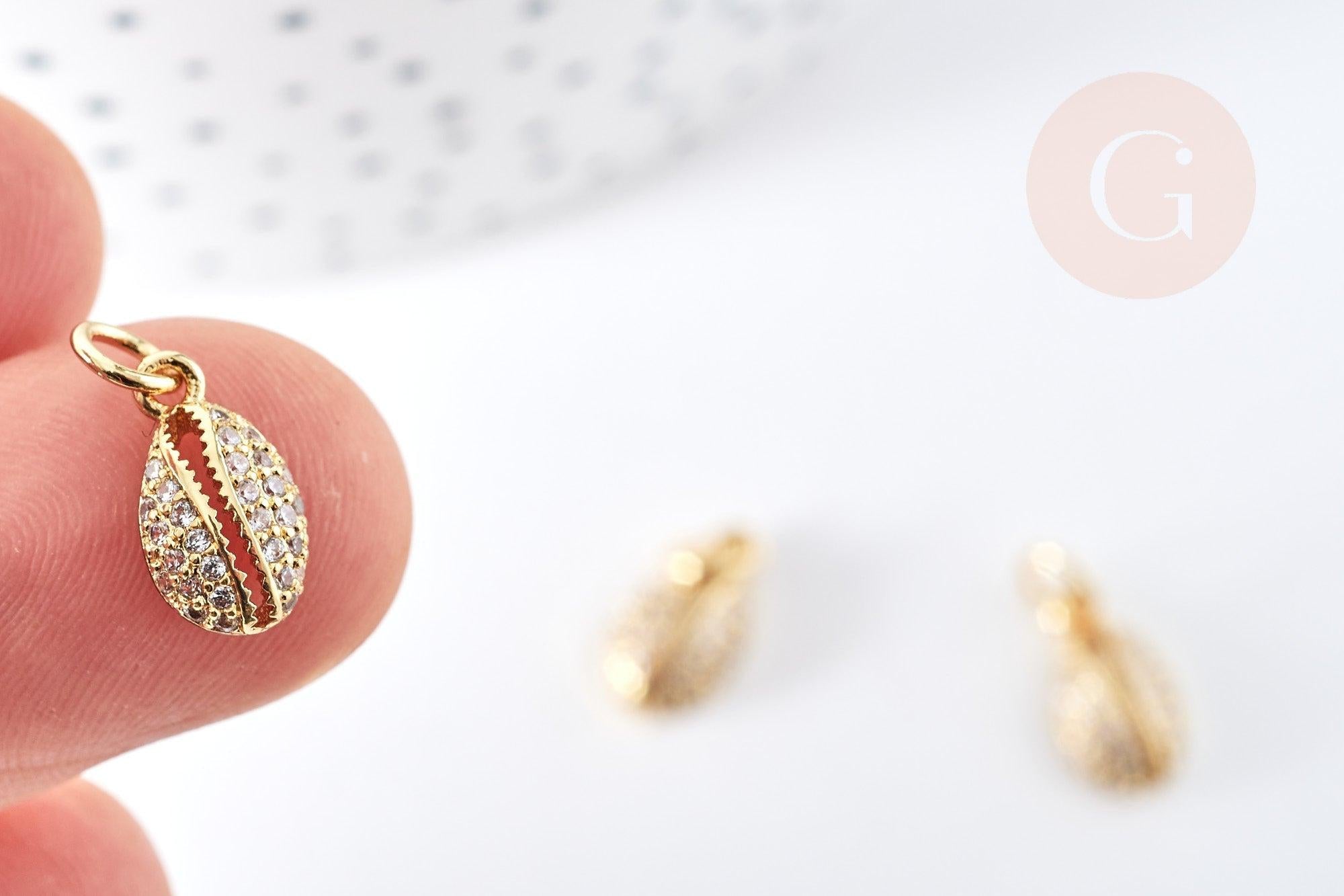 Este colgante de concha de cauri dorada es una auténtica joya de moda gracias a su engaste de mini circonitas en toda su superficie. Con él, seguro que crearás complementos y bisutería ultramodernos este verano.