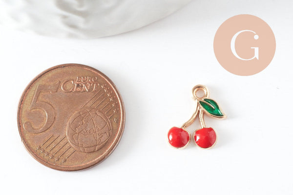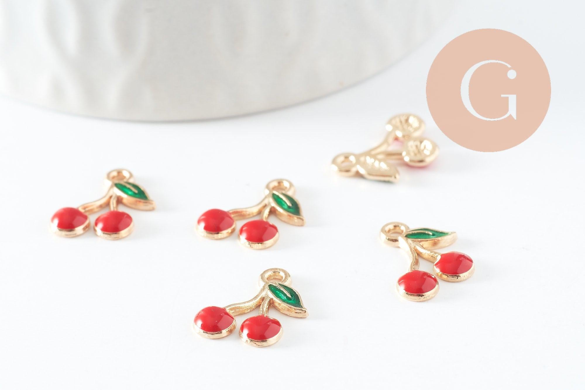 Estos colgantes de cereza en zamac dorado recubiertos de esmalte rojo y verde son una excelente opción para añadir un toque veraniego y afrutado a tus creaciones de joyería DIY .
