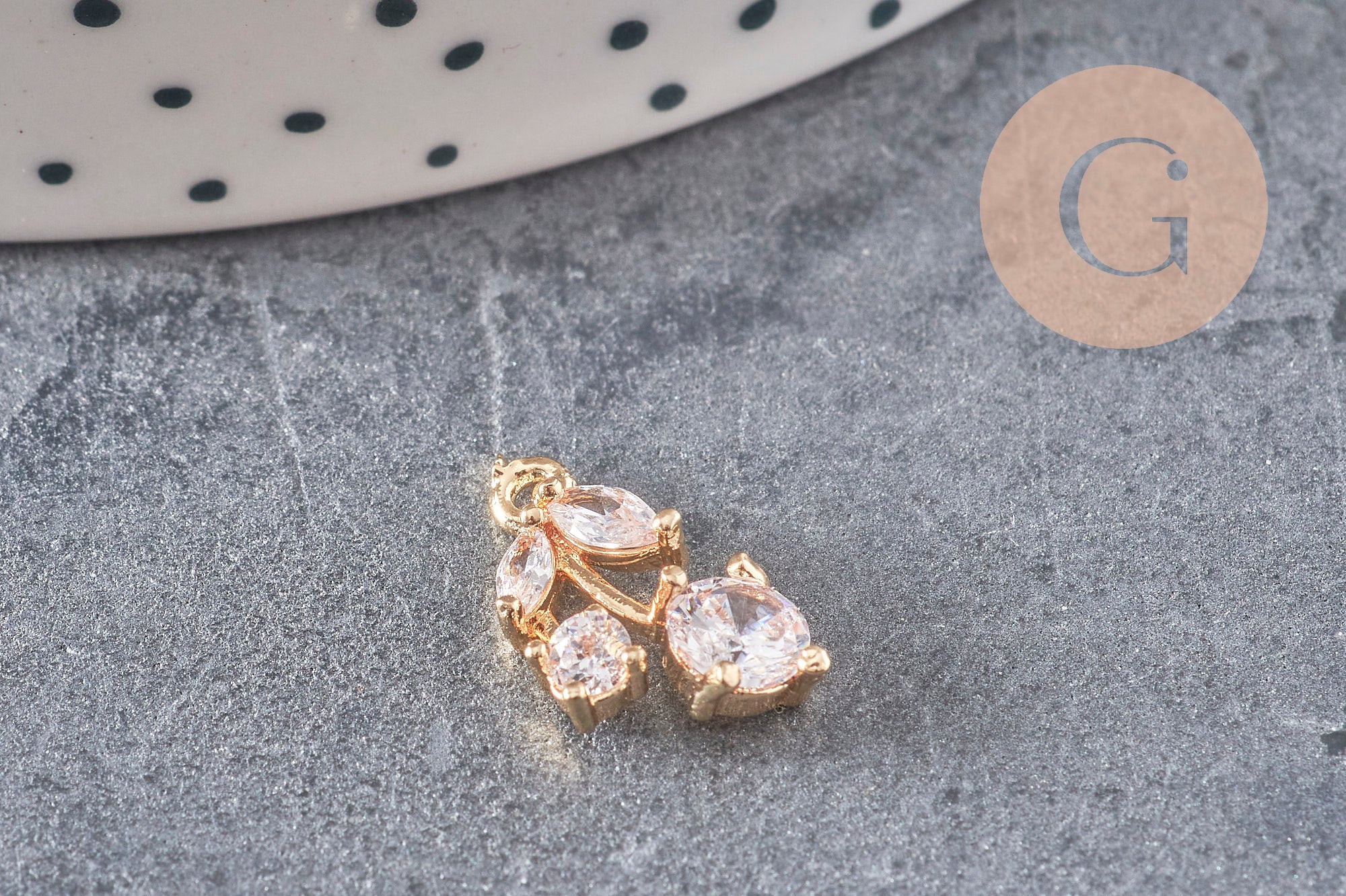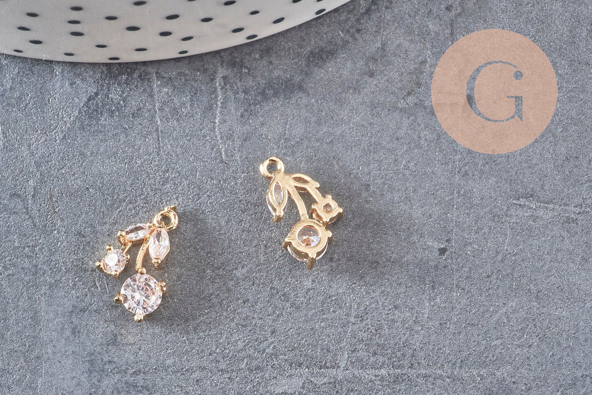 Este colgante de cereza de latón dorado decorado con circonitas blancas será ideal para sus numerosas creaciones de bisutería DIY sobre el tema de las frutas.