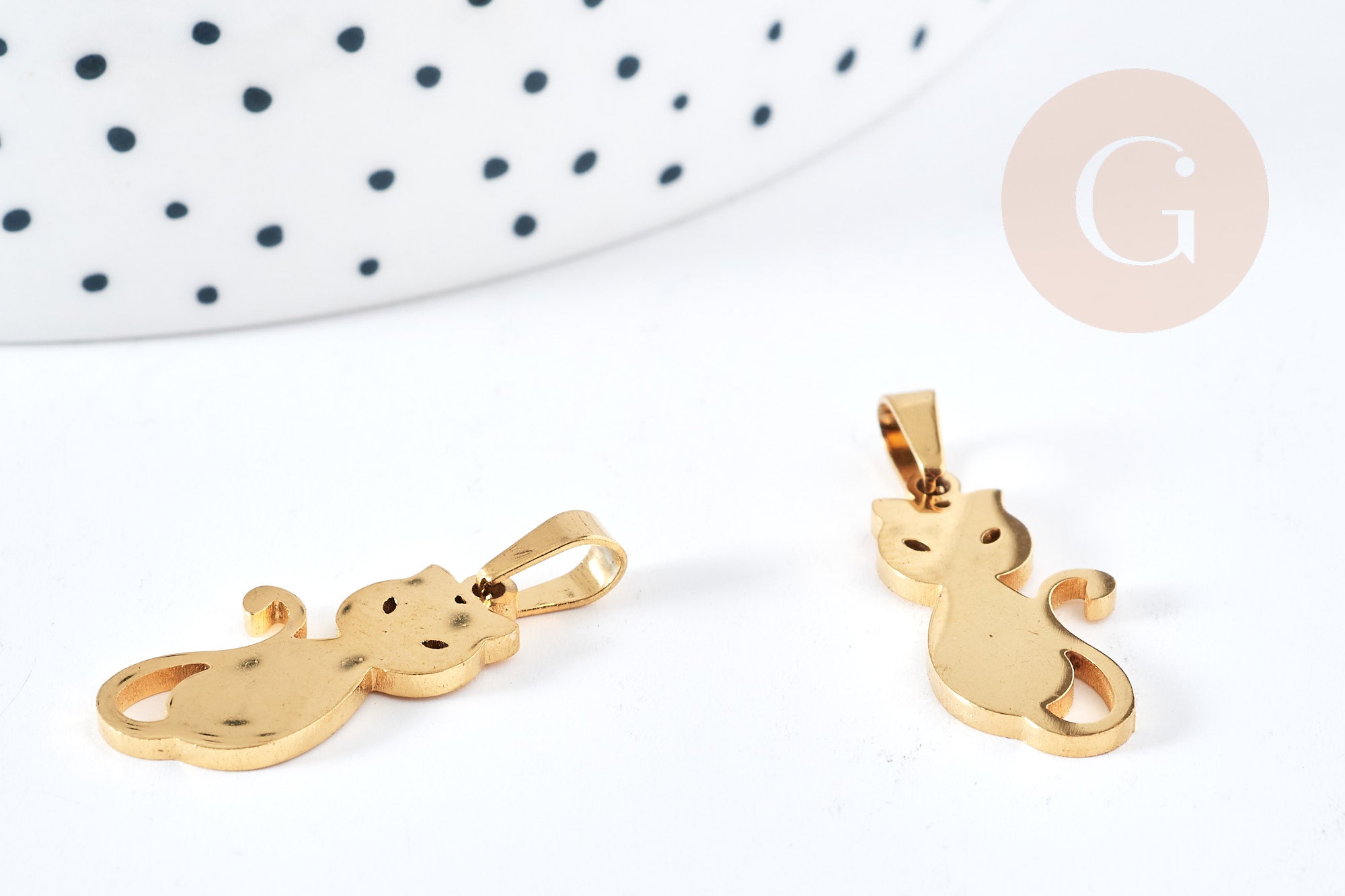 Las posibilidades son infinitas, deja volar tu creatividad para crear joyas únicas y personalizadas con este colgante de gato de acero bañado en oro .