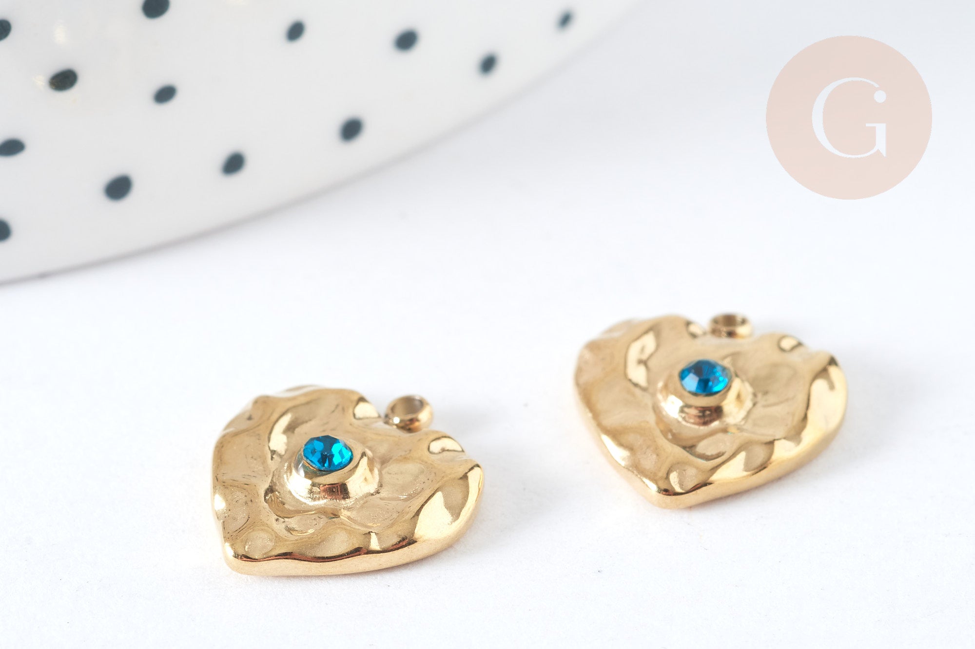 Un colgante de corazón , martillado y elaborado en acero inoxidable 304 bañado en oro . ¡En el centro hay un circón azul facetado que brilla!