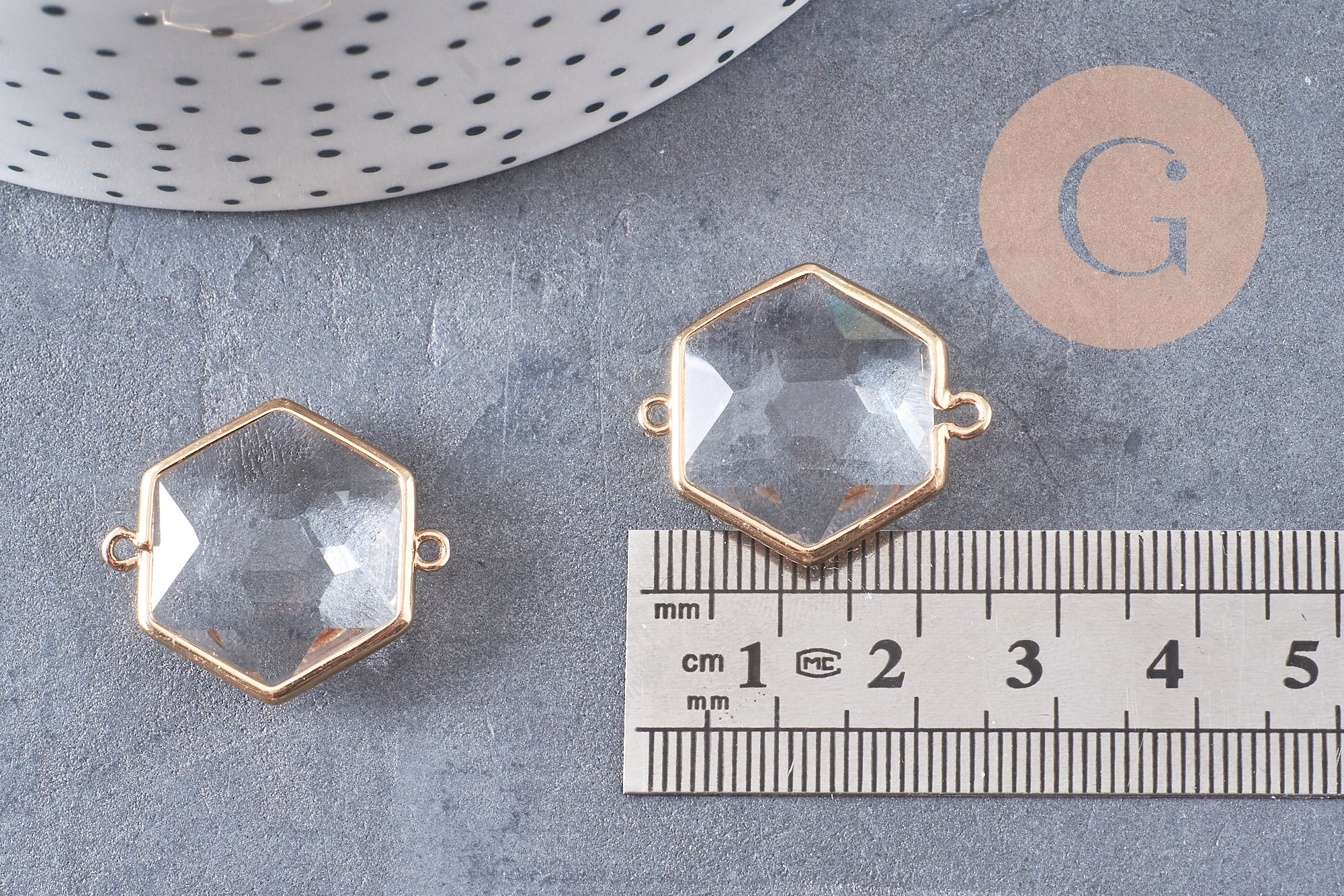 Colgante con conector hexagonal dorado con cristal facetado transparente, colgante de cristal, colgante dorado, creación de joyas, 25,5 mm, juego de 2