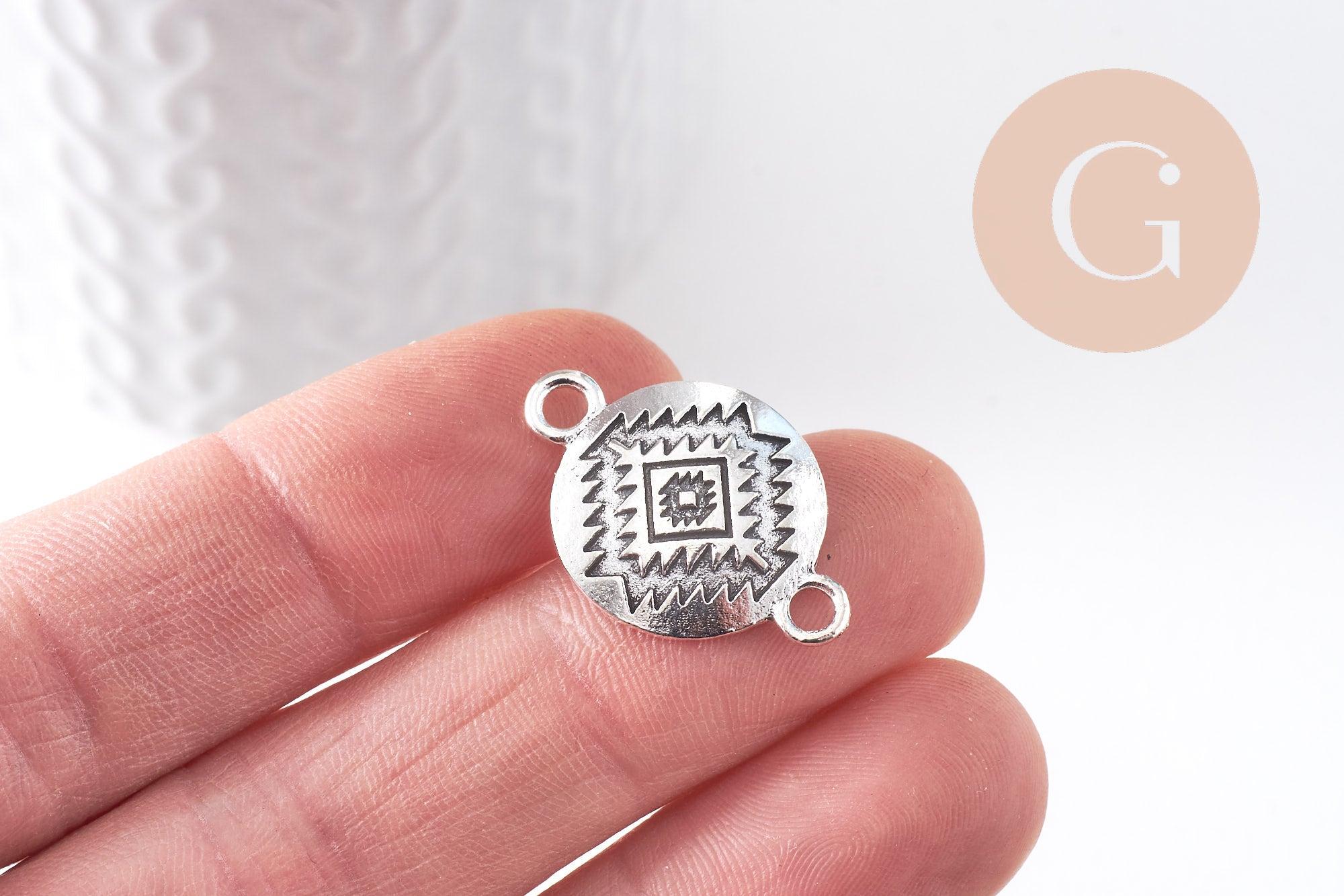 Pendentif connecteur rond zamac platine motif amérindien 26mm, x2 (G10417)