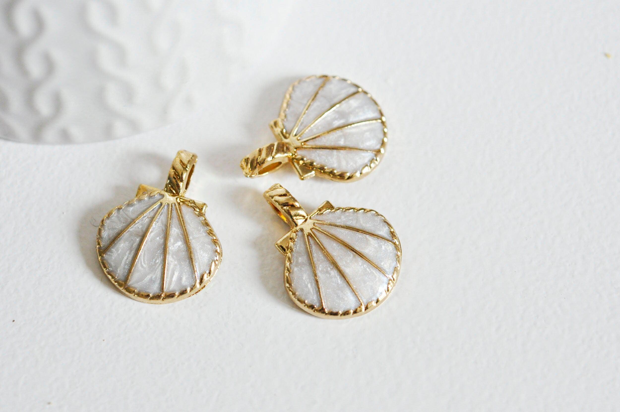 Colgante de concha dorada blanca, suministro creativo, colgante de concha, creación de joyas, concha dorada, colgante dorado, 24,5 mm, juego de 2 2 conchas de metal dorado recubiertas de resina blanca transparente. El anillo está situado en la parte superior...