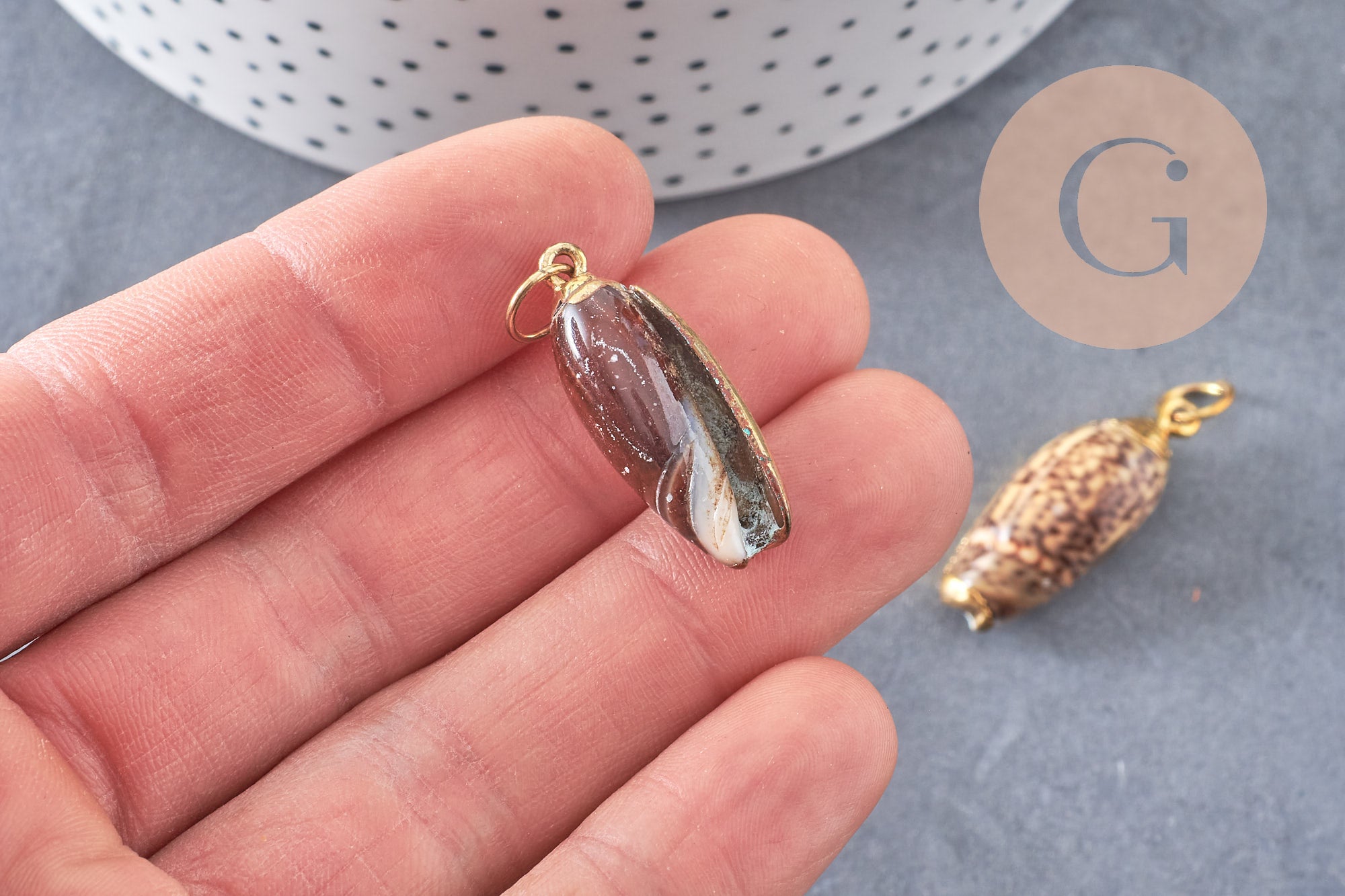 Un elegante colgante de concha natural dorada.