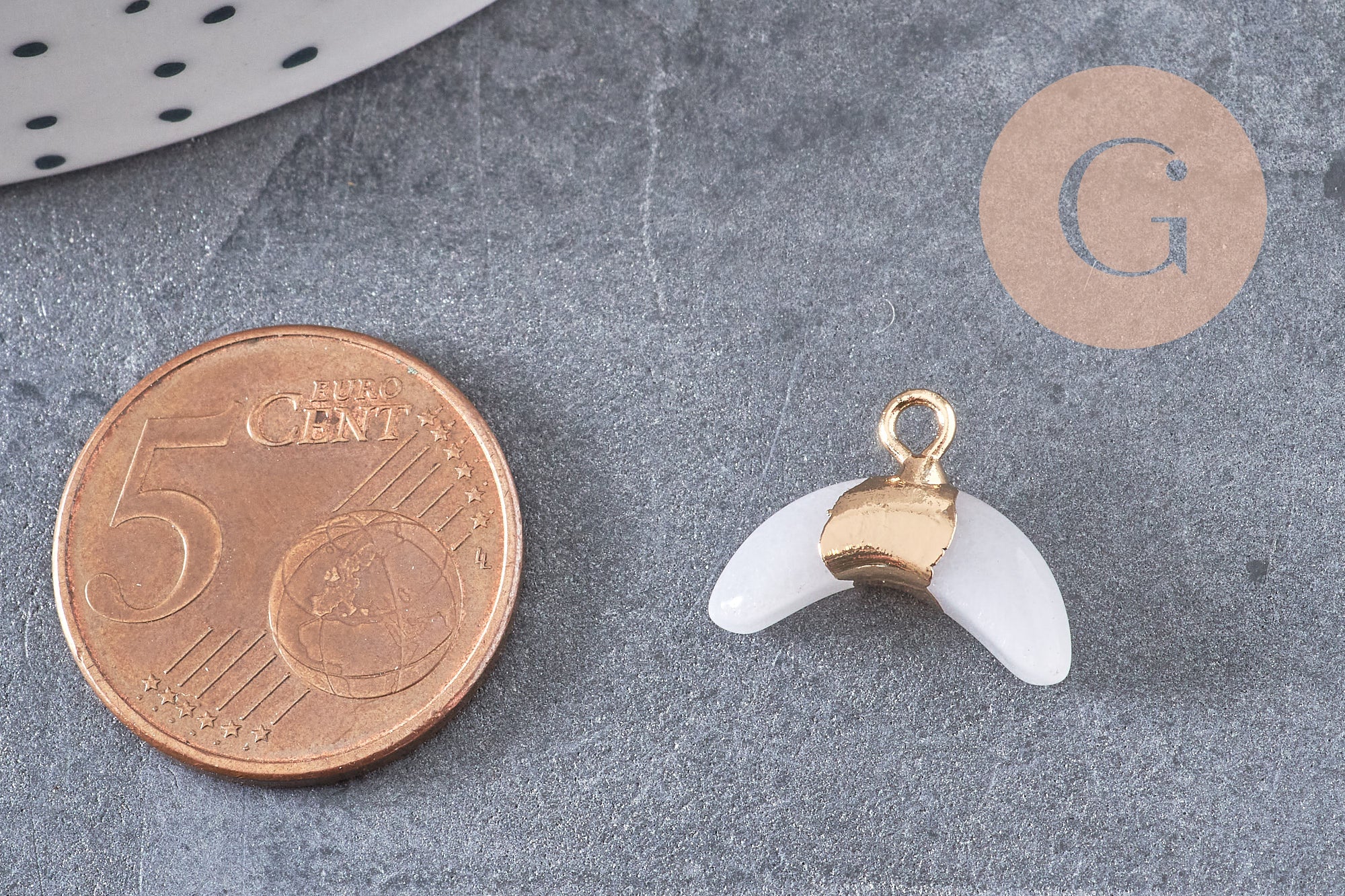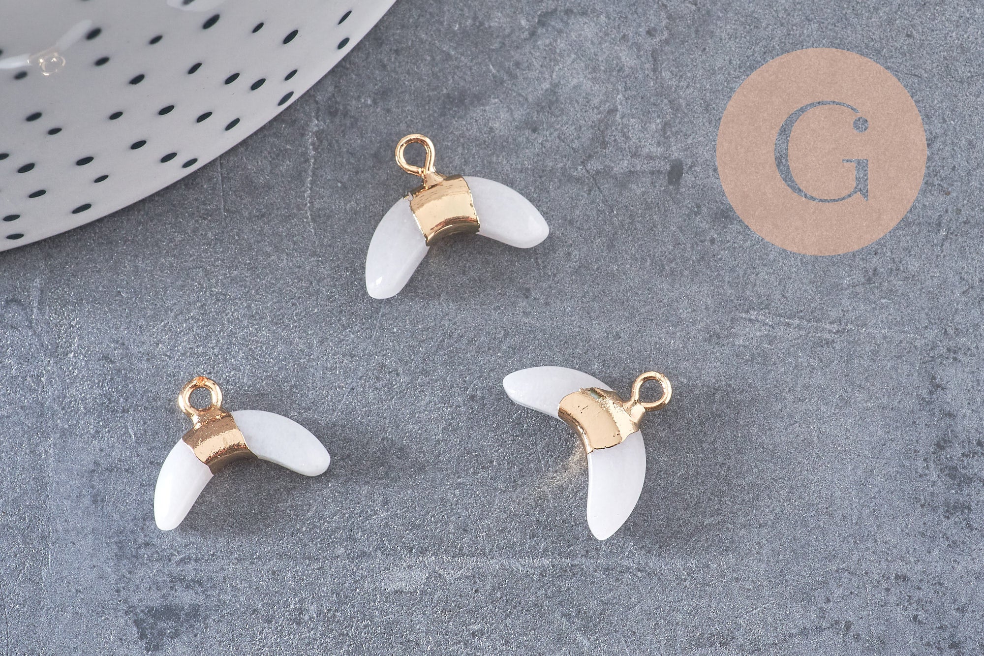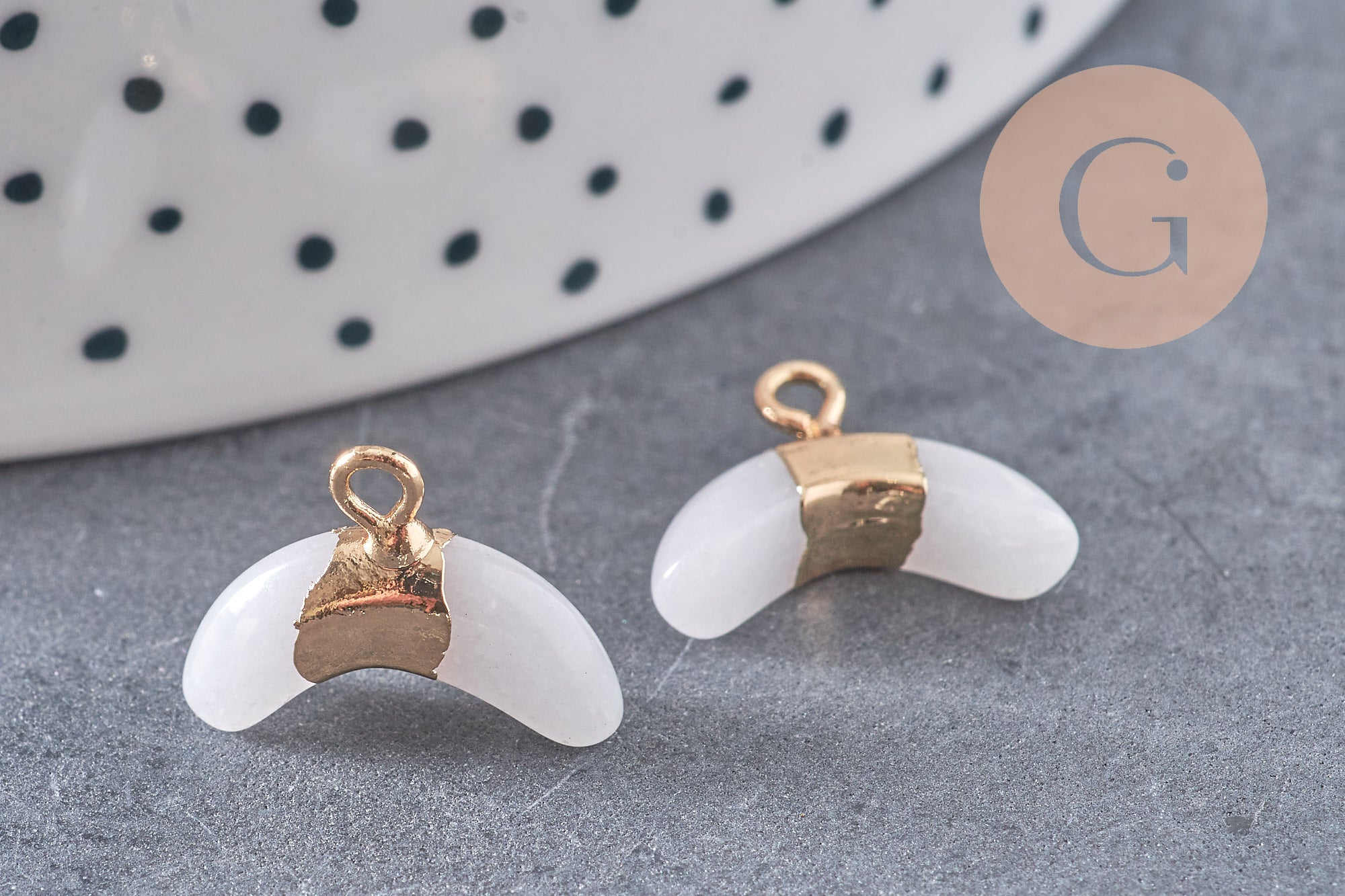 Enamórate de este colgante de jade blanco natural, tallado en forma de cuerno/media luna y montado sobre una elegante base de latón bañado en oro. Una joya de moda que podrás incorporar a tus creaciones y darle un toque místico y mineral.