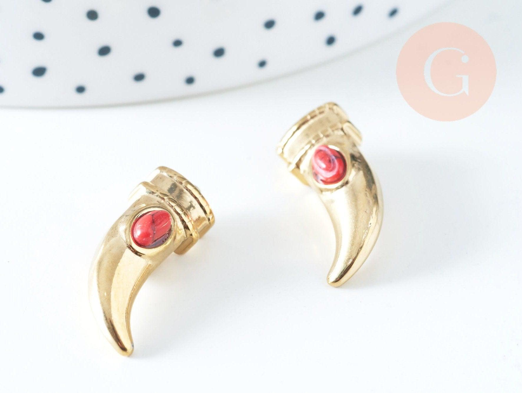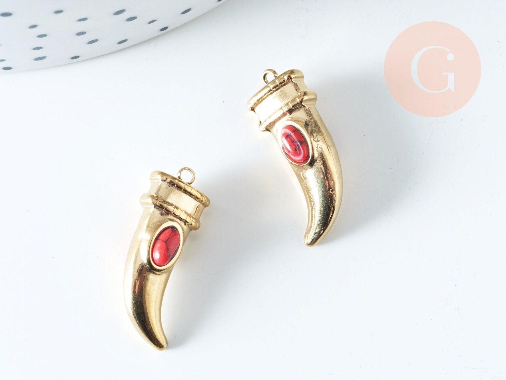 Un bonito charm de cuerno de acero bañado en oro decorado con una piedra sintética roja, ¡un colgante original para utilizar en todas tus creaciones de joyería! Ligero y muy estético, podrás crear fácilmente rizos originales. Simplemente coloque su colgante...