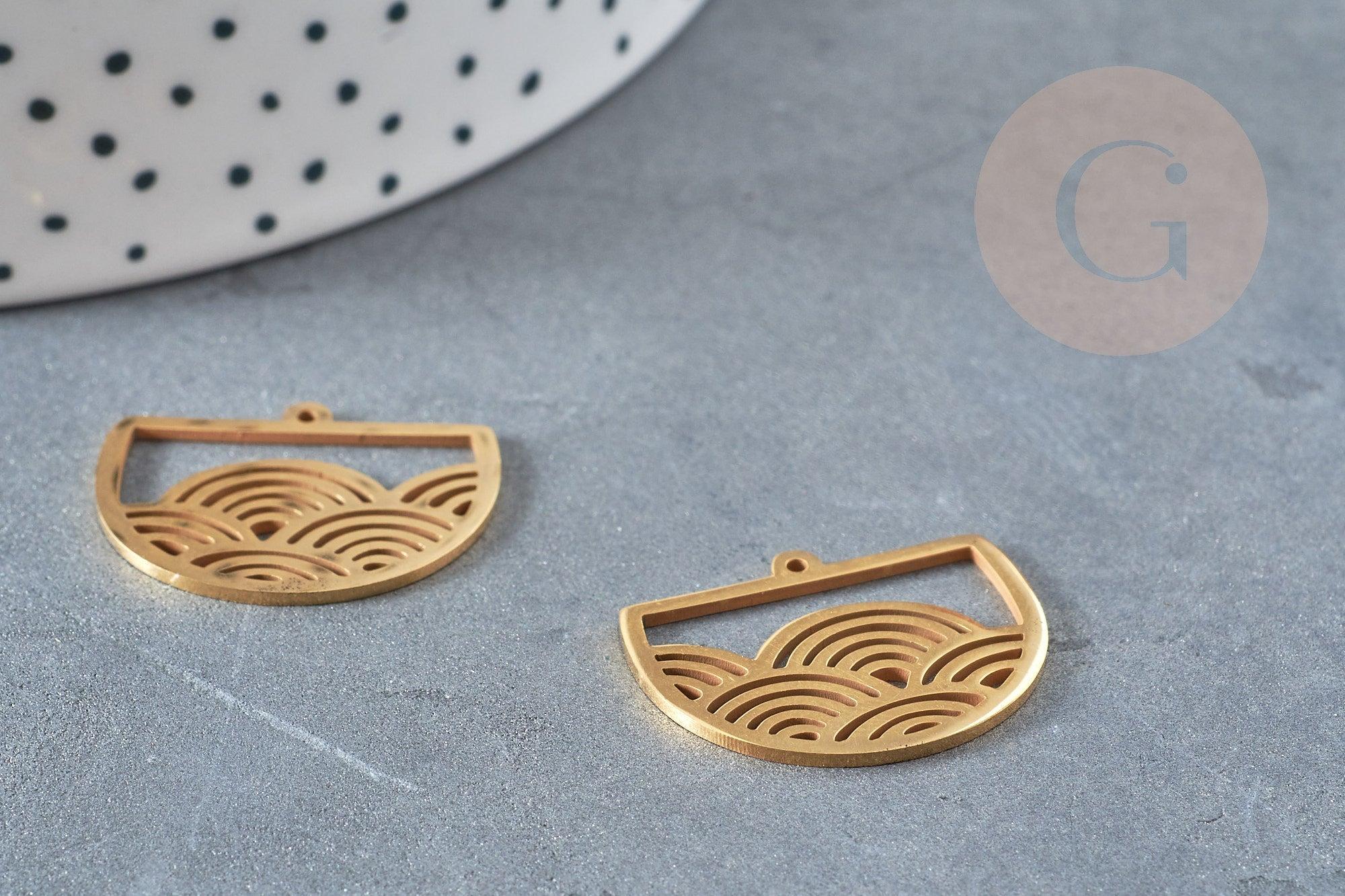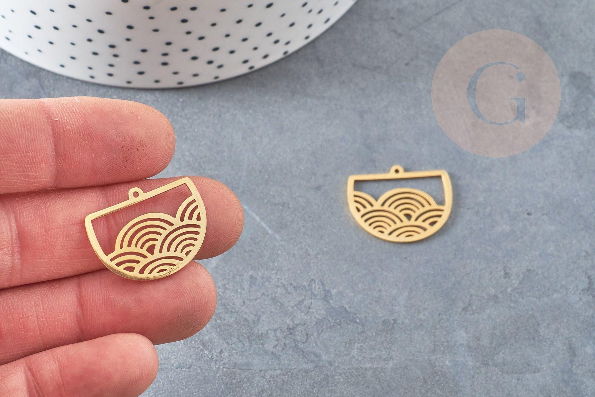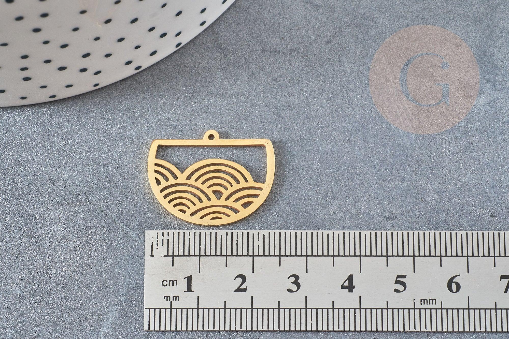 Un colgante de medio círculo en acero inoxidable bañado en oro decorado con un patrón de ondas japonesas . Un colgante dorado ideal para tus creaciones DIY.
