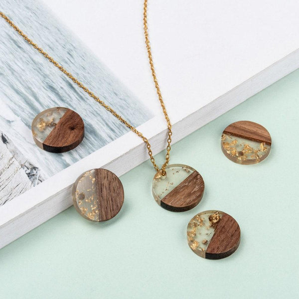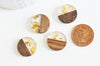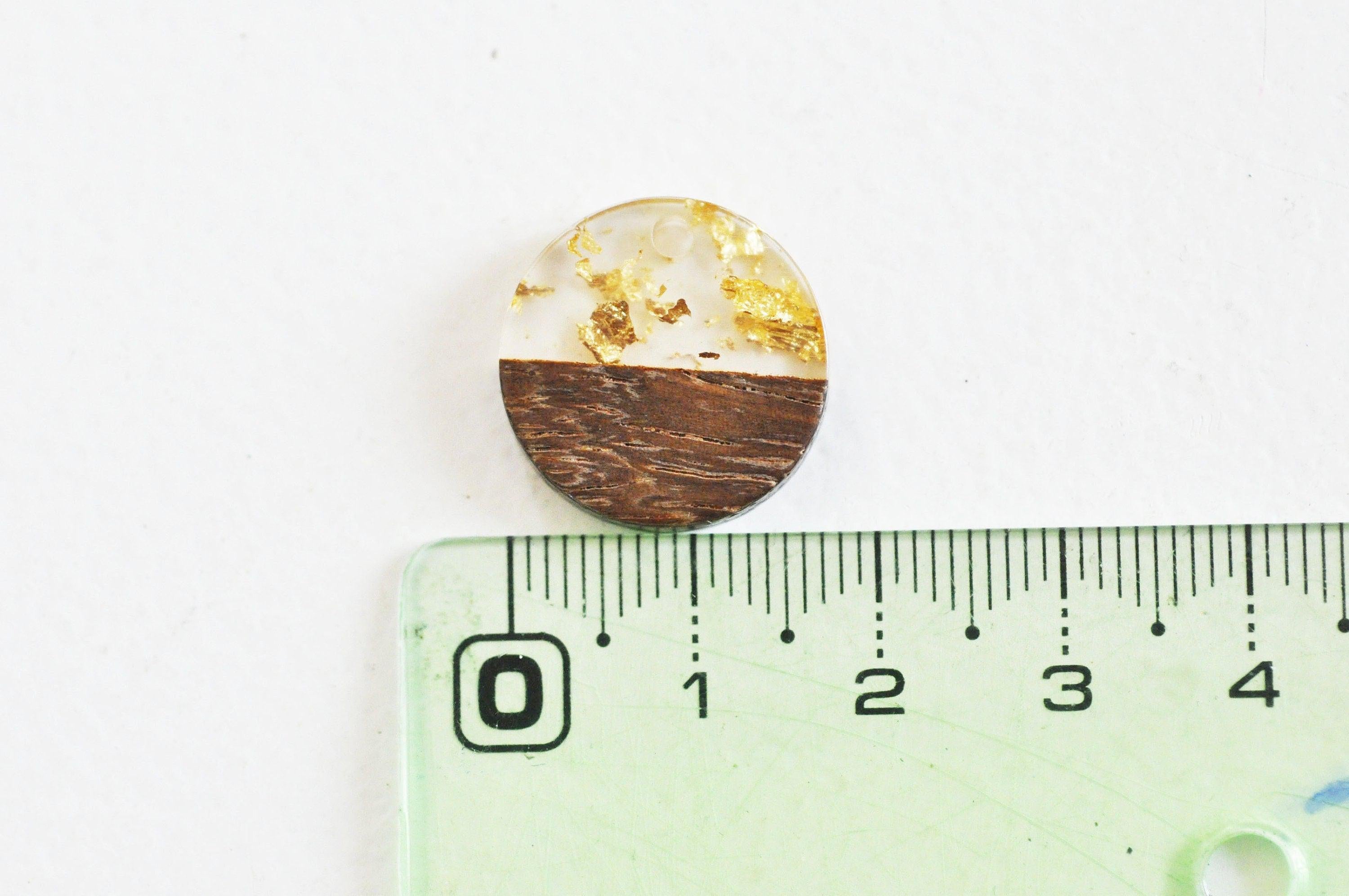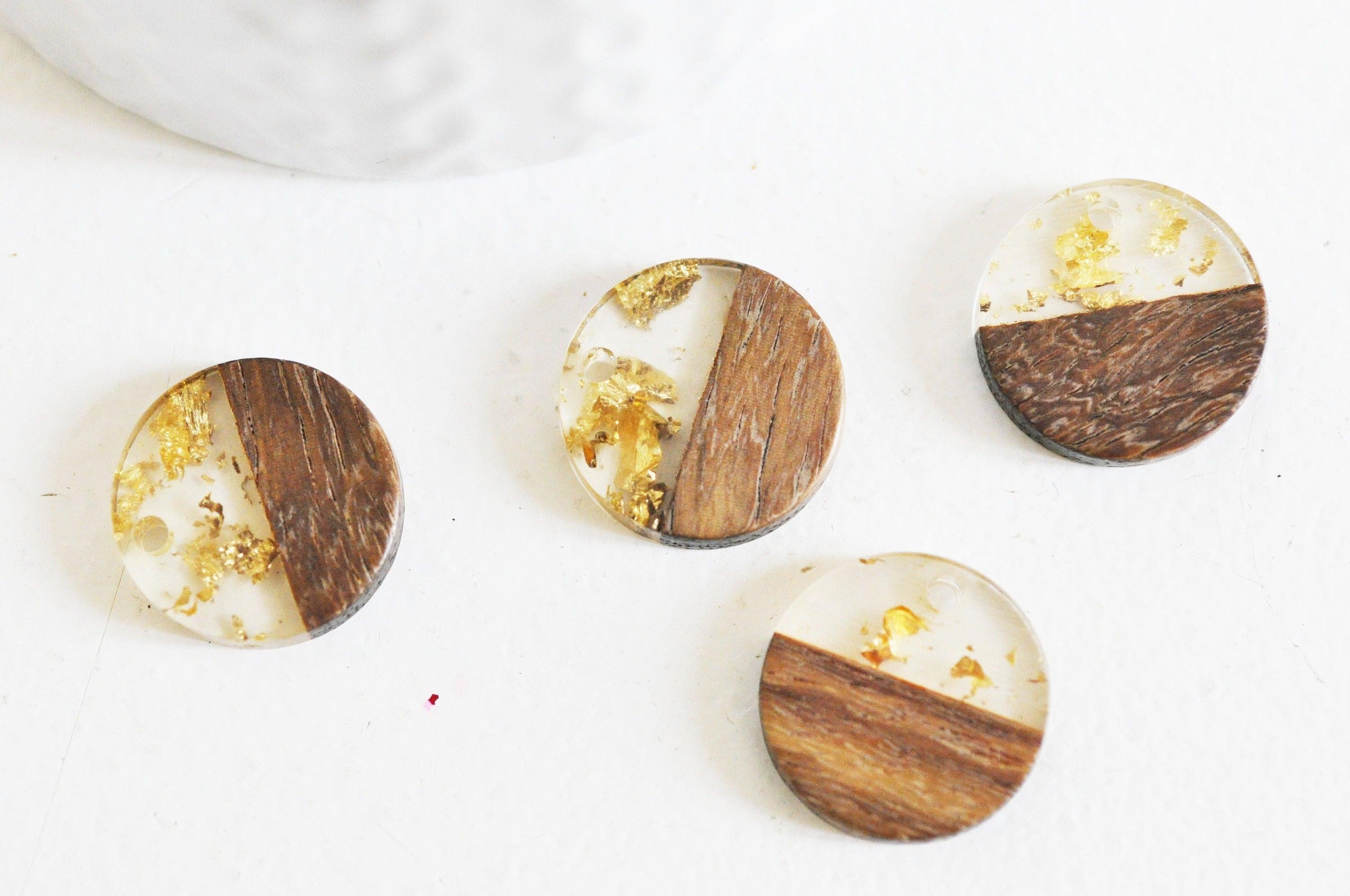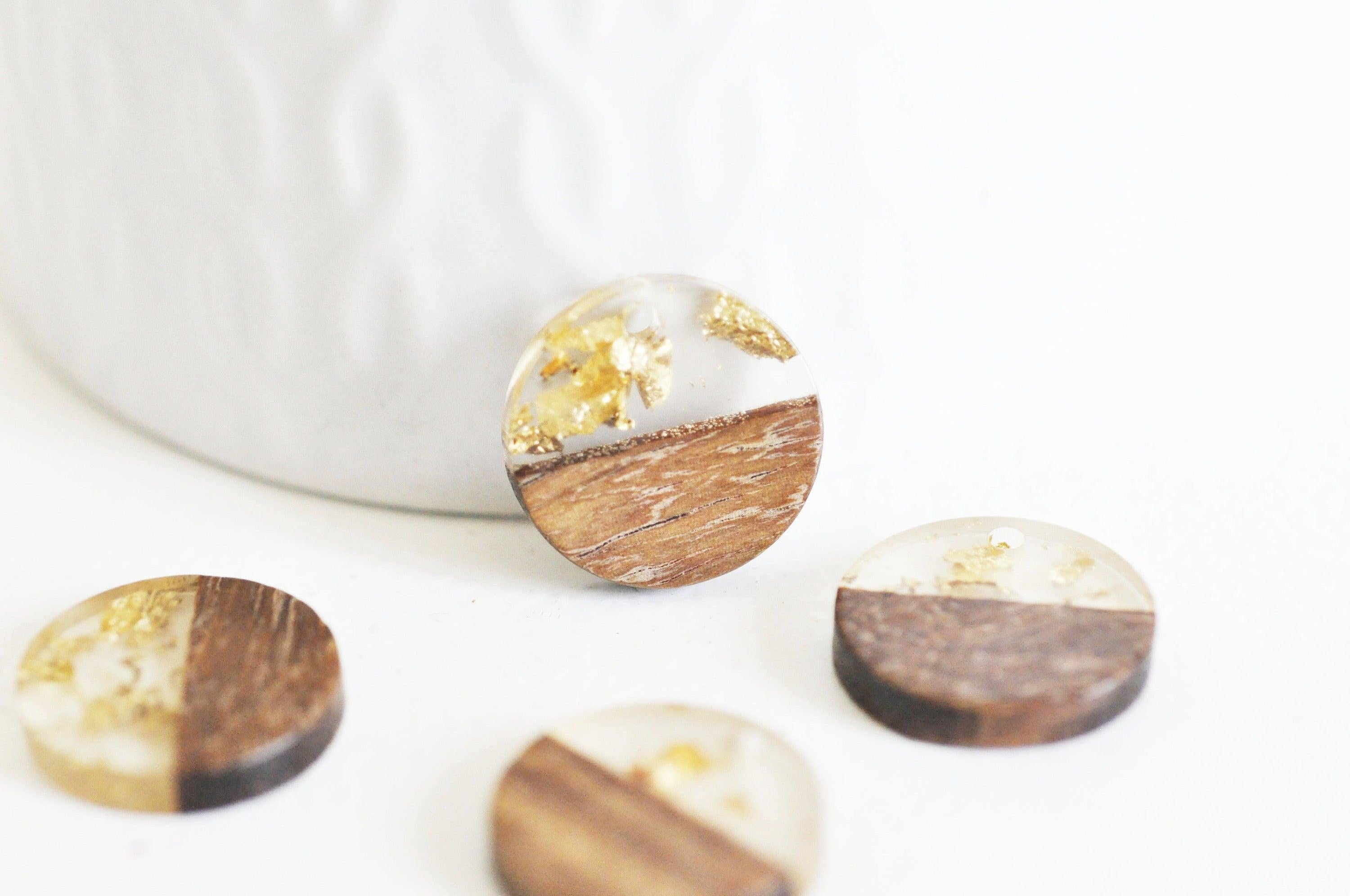 Cuentas en forma de disco de aspecto muy sencillo, fabricadas en madera y resina transparente y guilladas doradas, con las que se pueden realizar colgantes muy bonitos o bucles completos de espíritu geométrico.