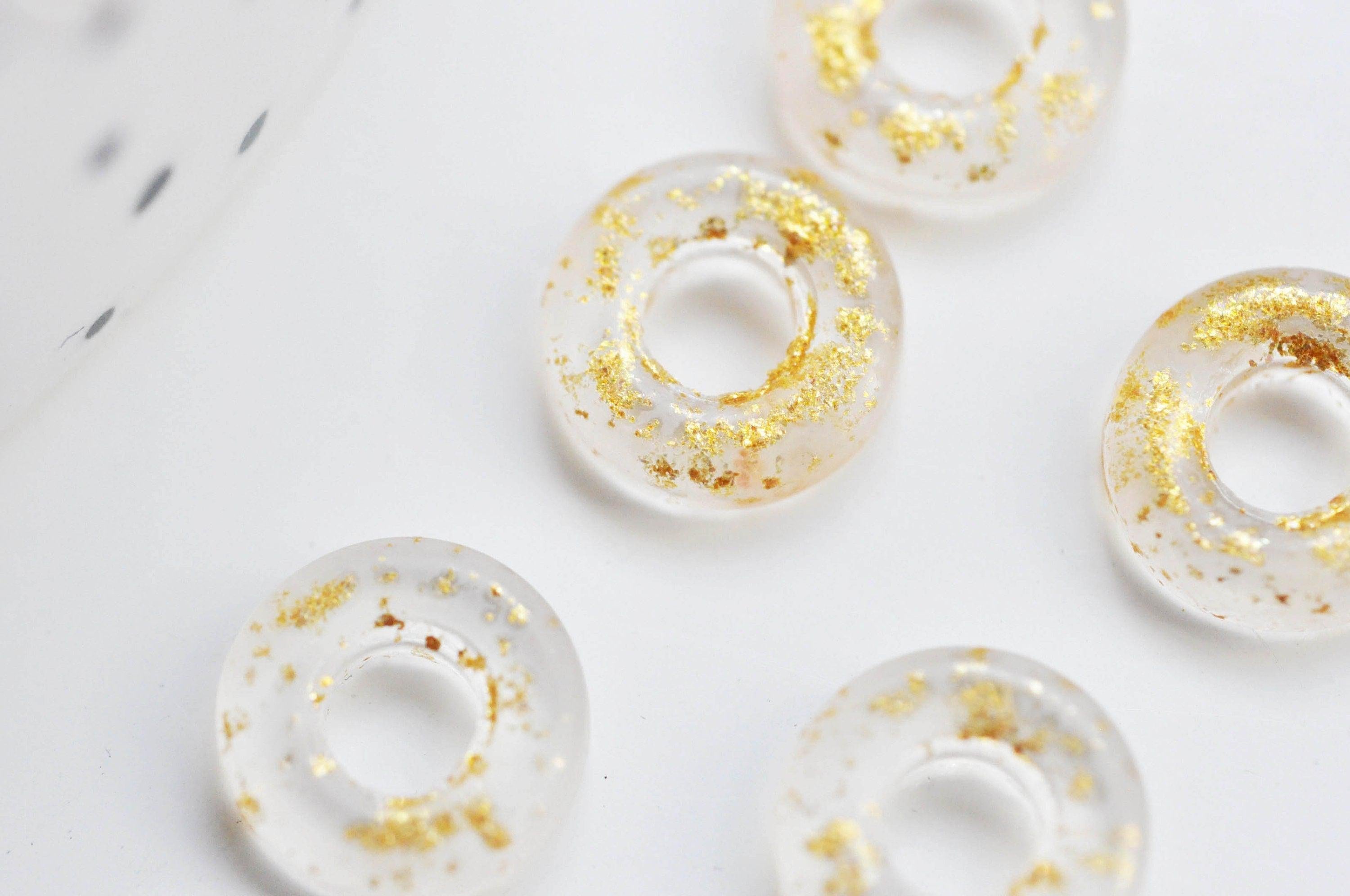 Déjate seducir por estos colgantes de cristal transparente con forma de donut, decorados con pan de oro.