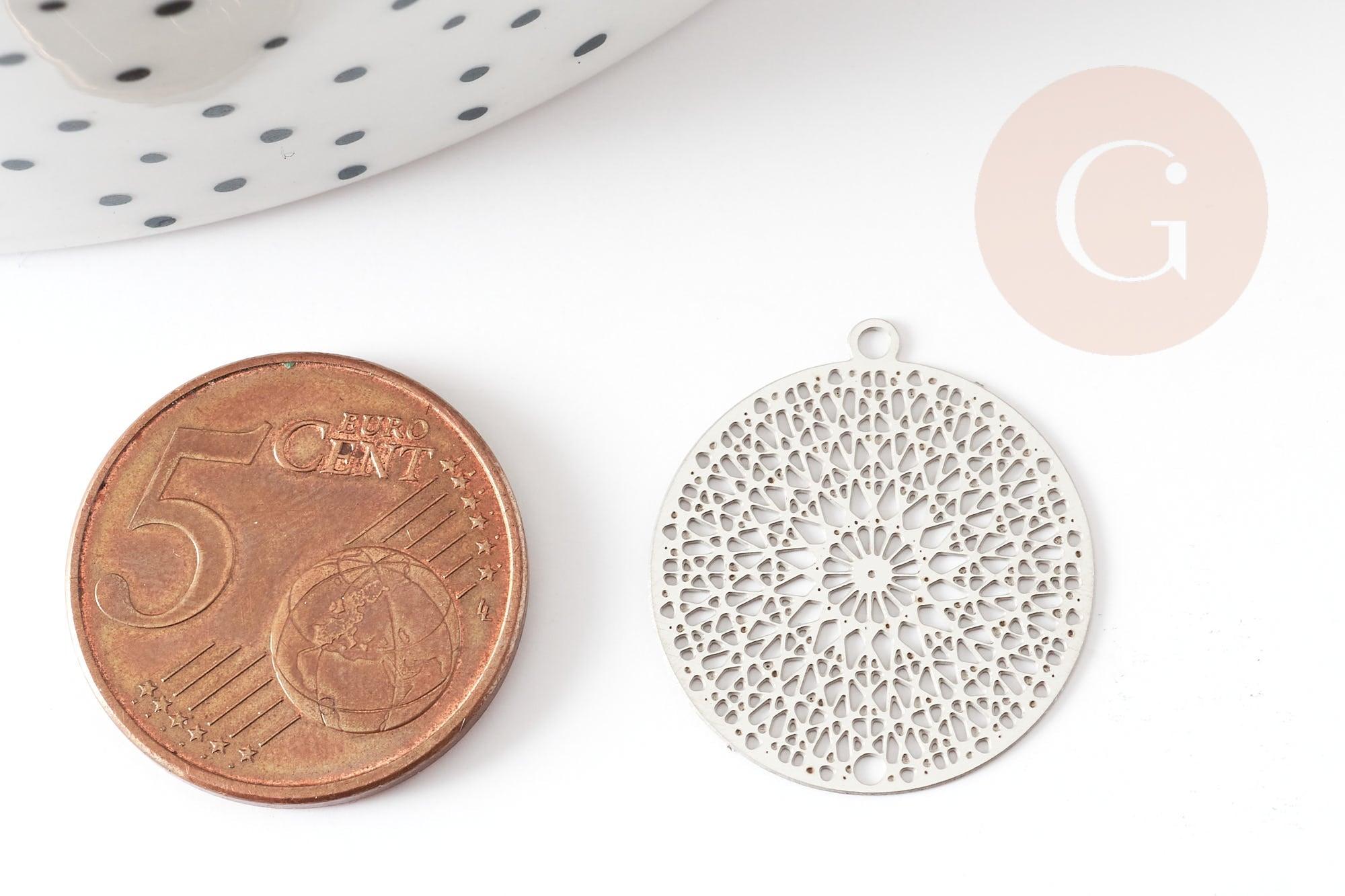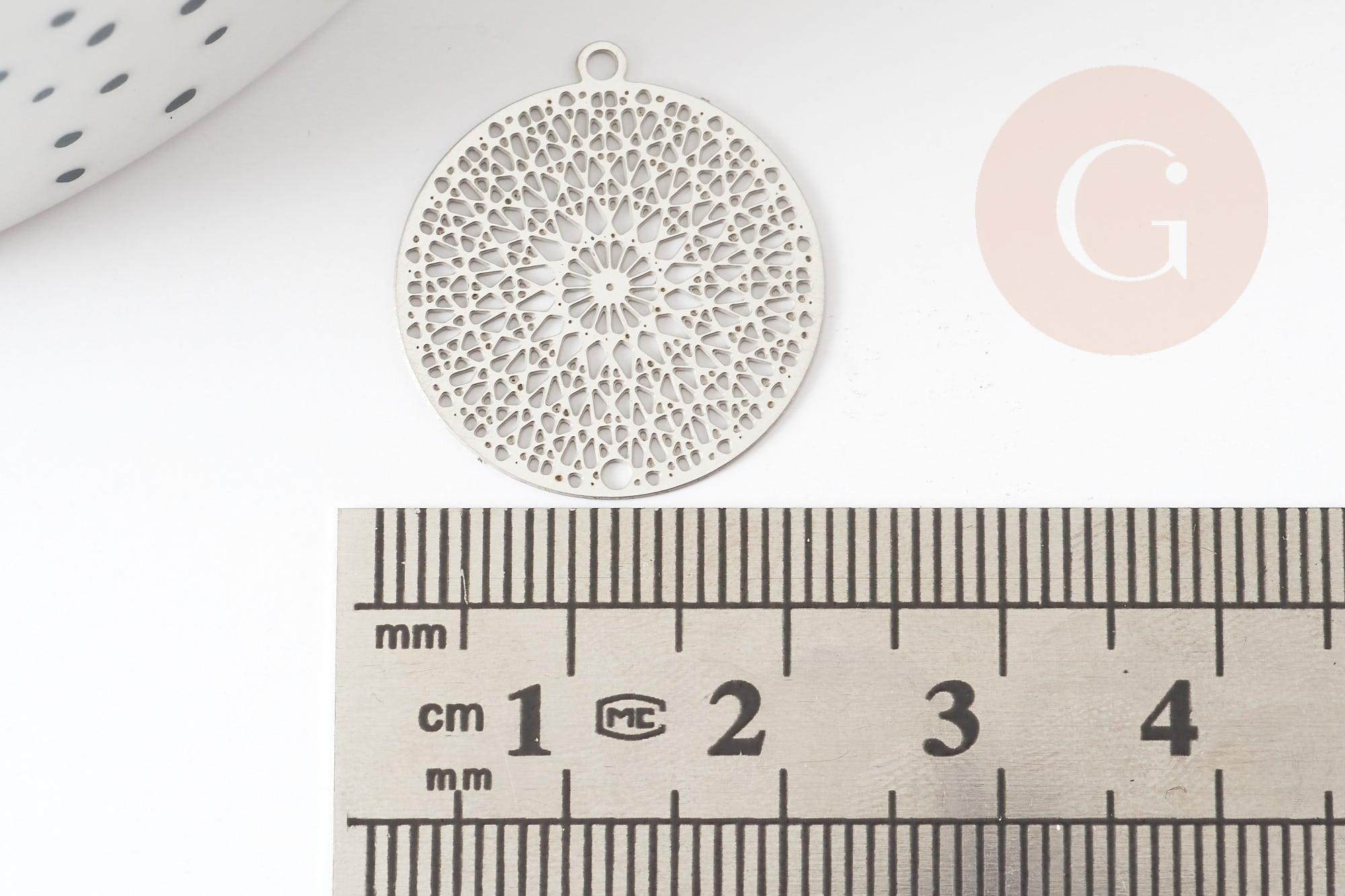 Pendentif estampe filigrane rond acier argent, Pendentif très fin et léger, 22x20mm,x2 (G4910)