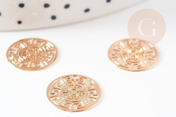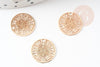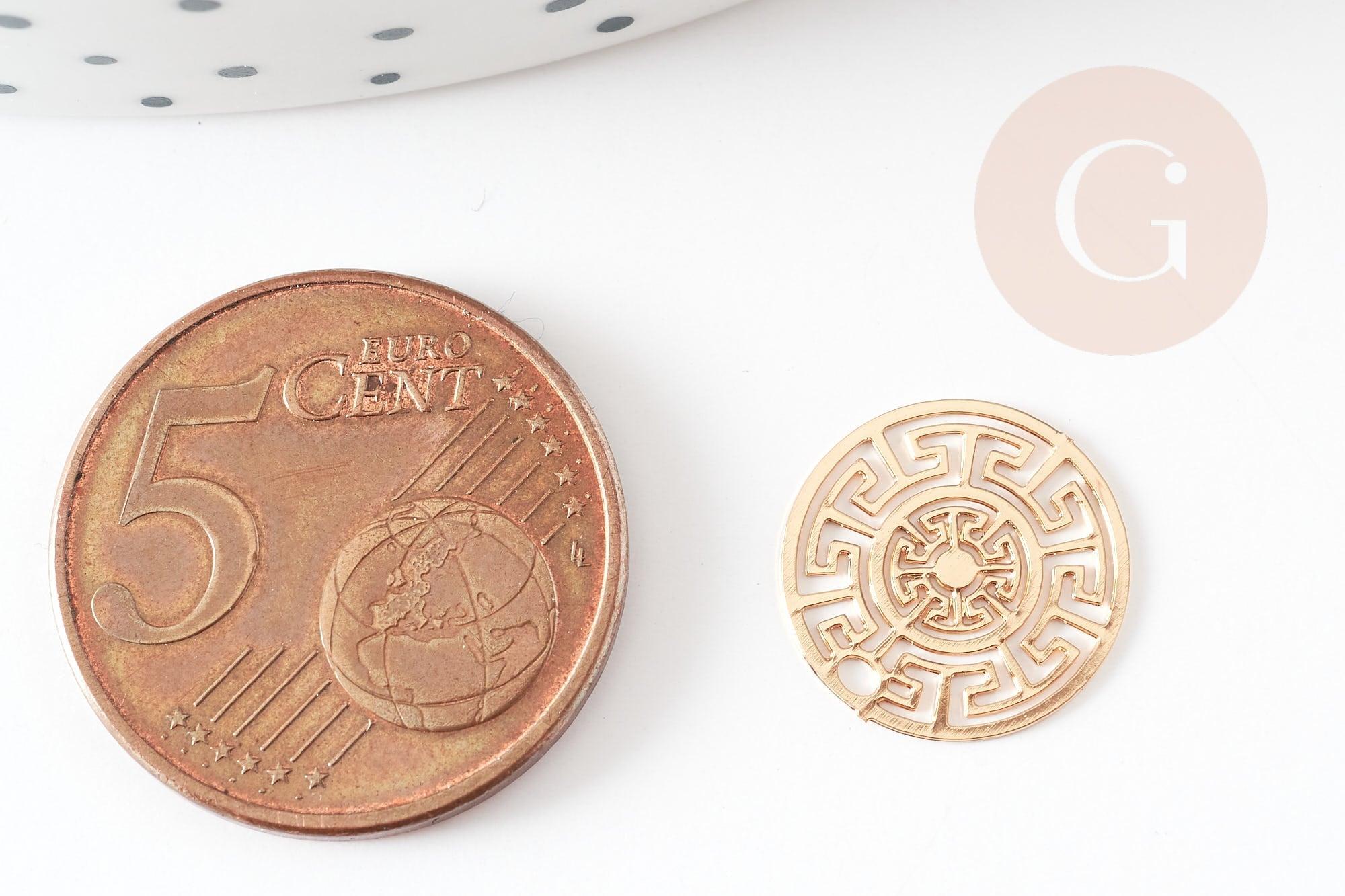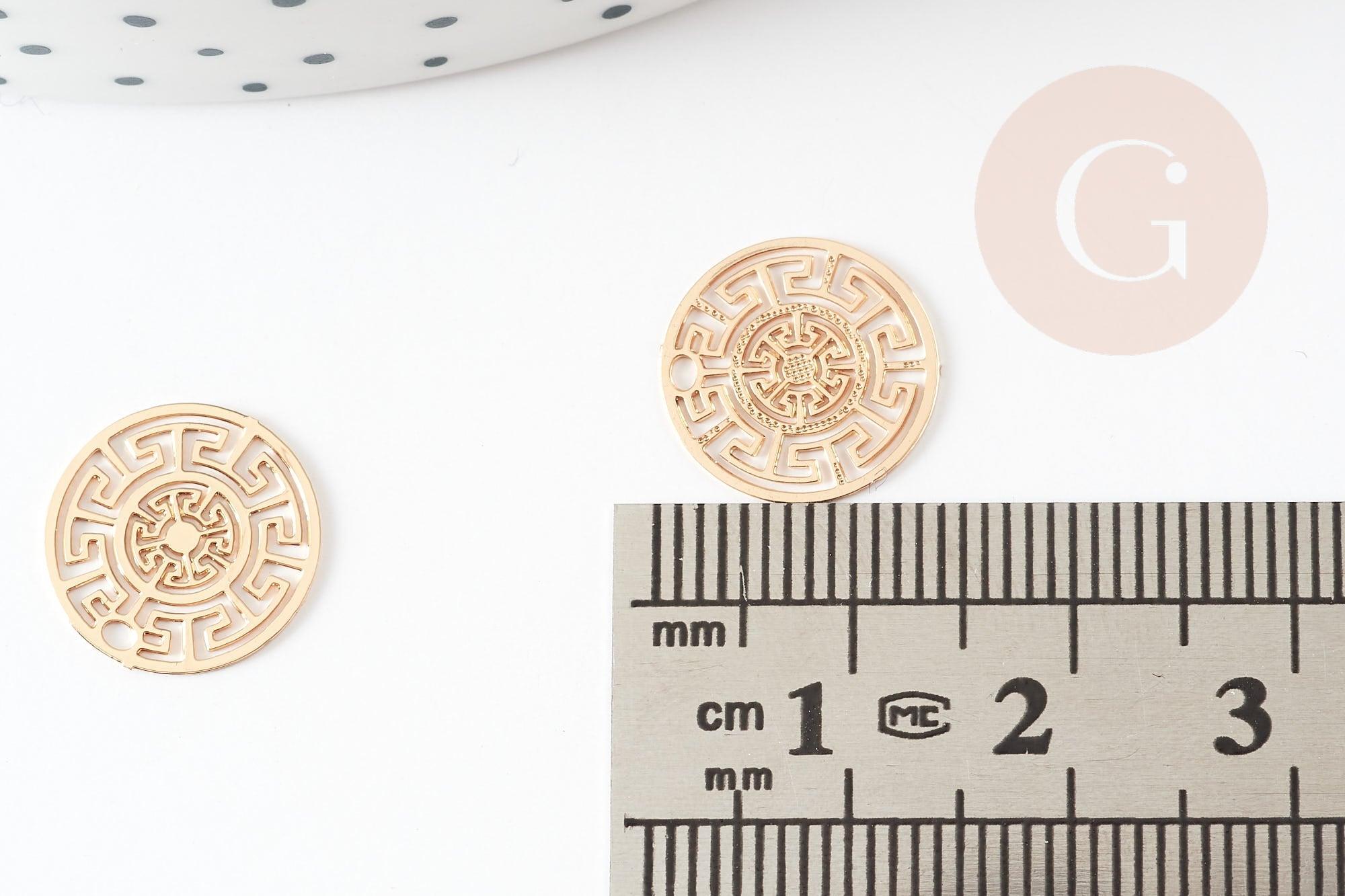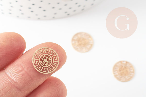 Colgante redondo con filigrana azteca estampada en latón chapado en oro, colgante muy fino y ligero, 13 mm, x2 (G4456)