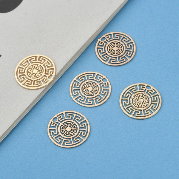 Colgante redondo con estampado de filigrana azteca en latón bañado en oro, Colgante muy fino y ligero para creación de joyas, 13 mm, Juego de 2