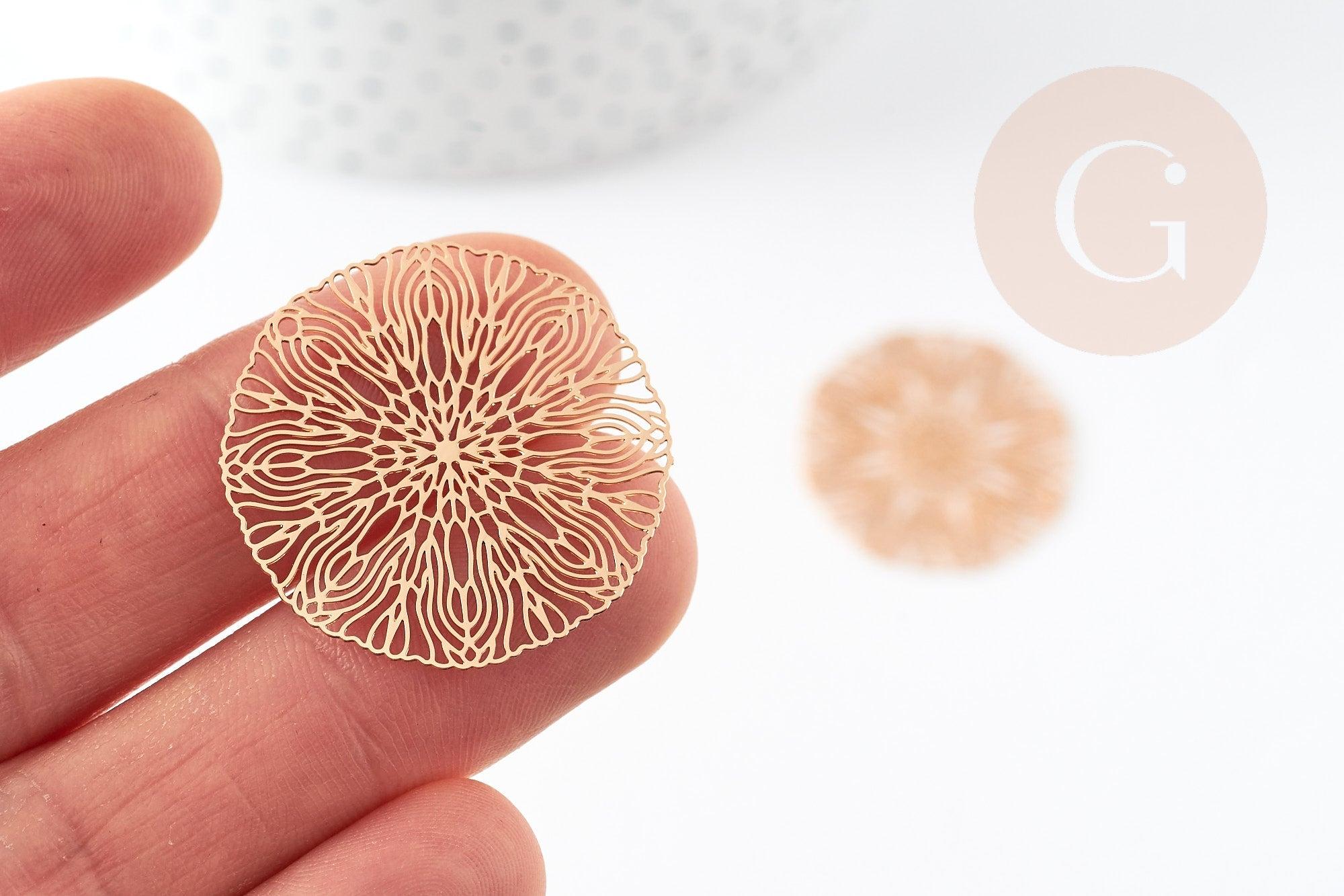 Colgante redondo con estampado de filigrana flor de latón dorado 30 mm, colgante muy fino y ligero para la creación de joyas DIY x2 G9205