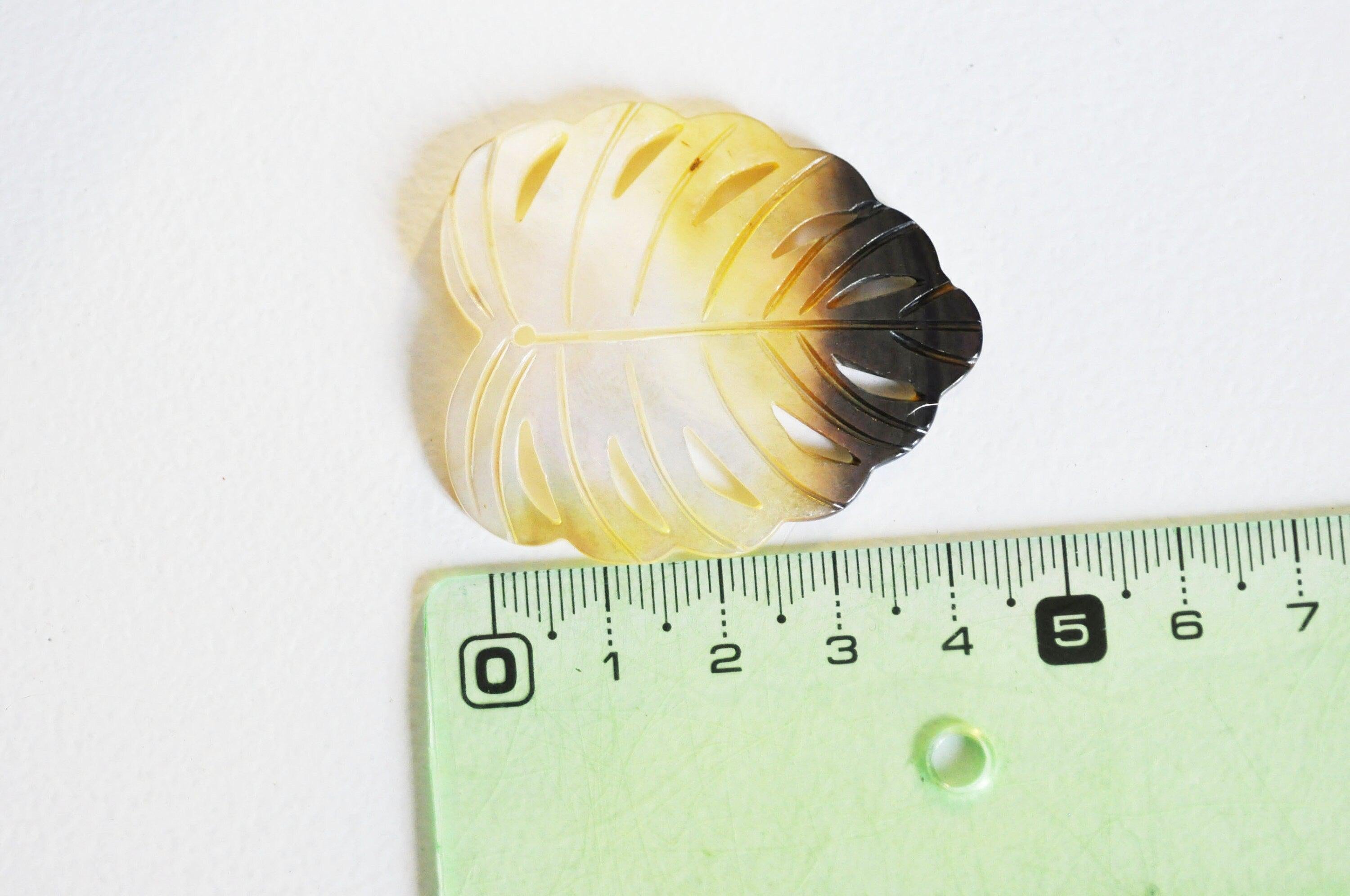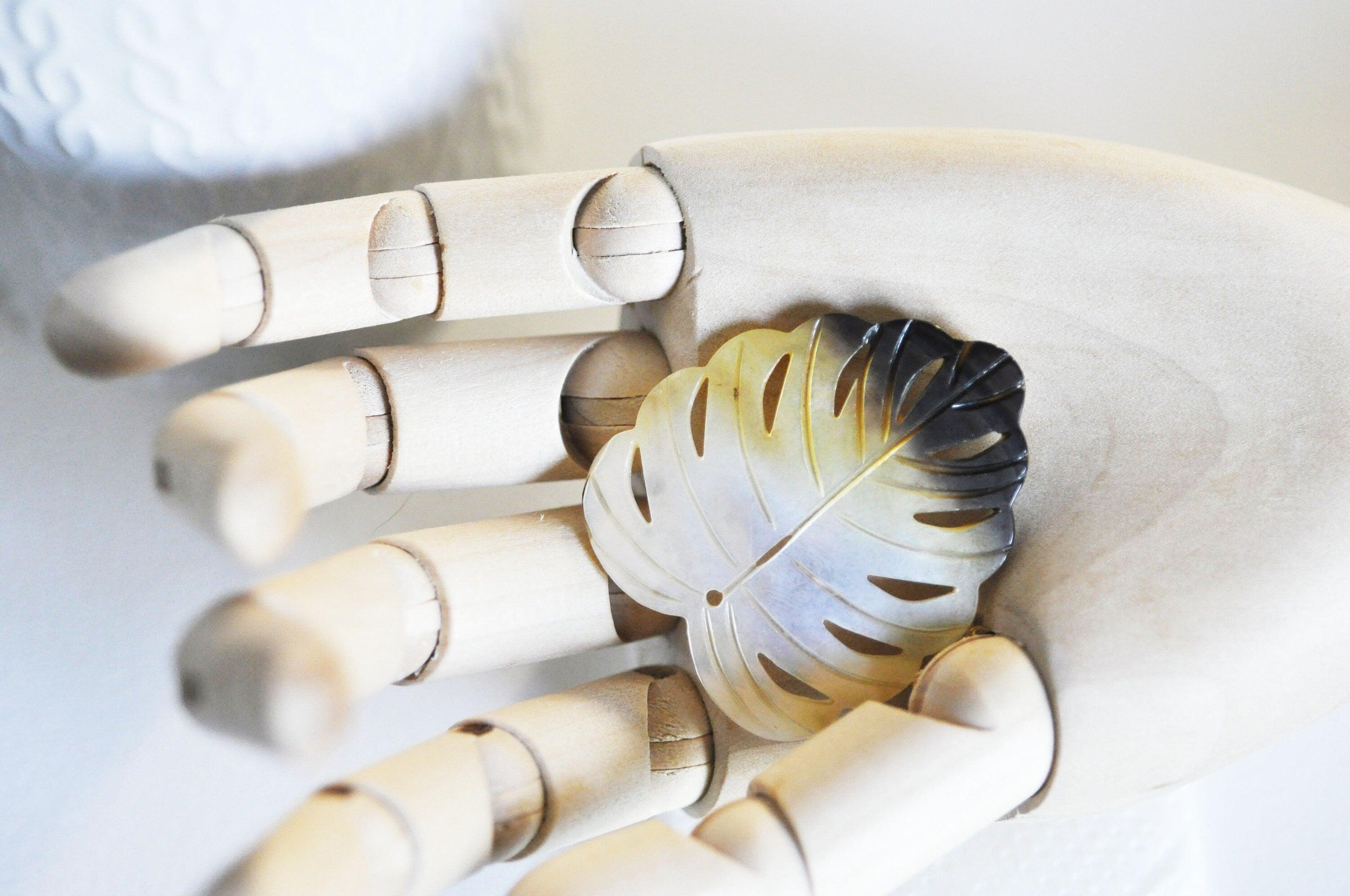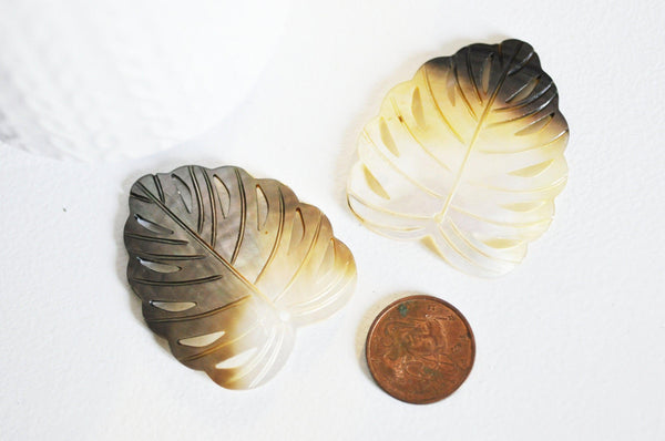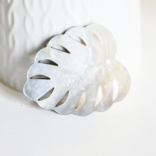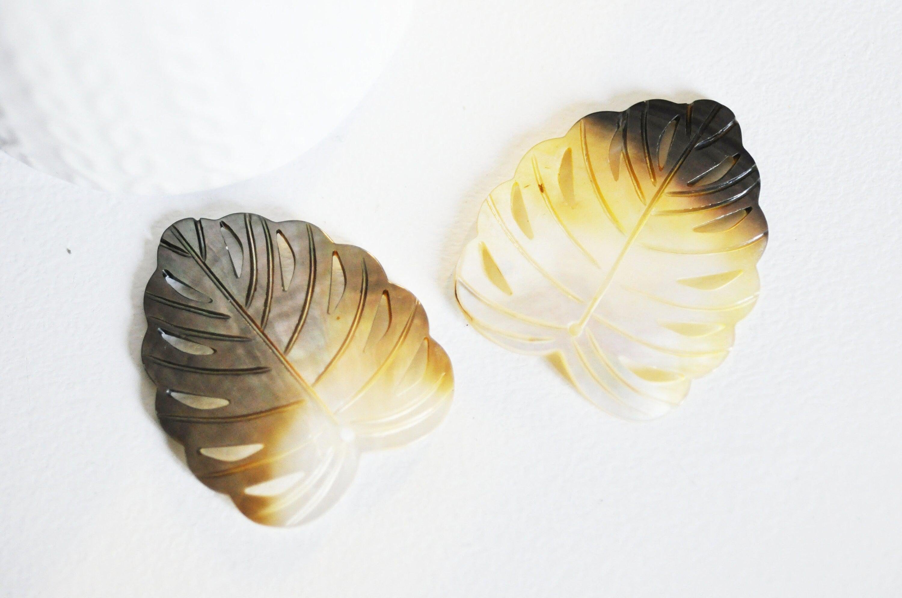 Añade un toque tropical y elegante a tus creaciones con este colgante de hoja de Monstera de nácar natural , en delicados tonos blanco perlado y gris .