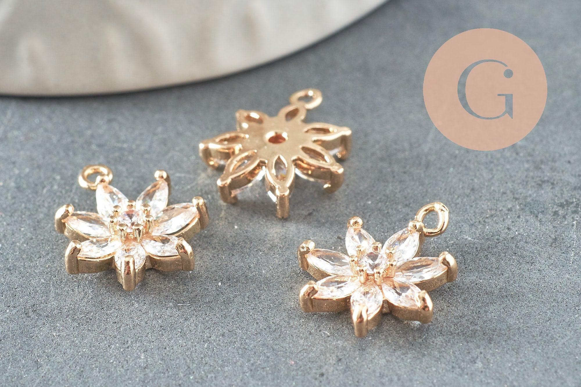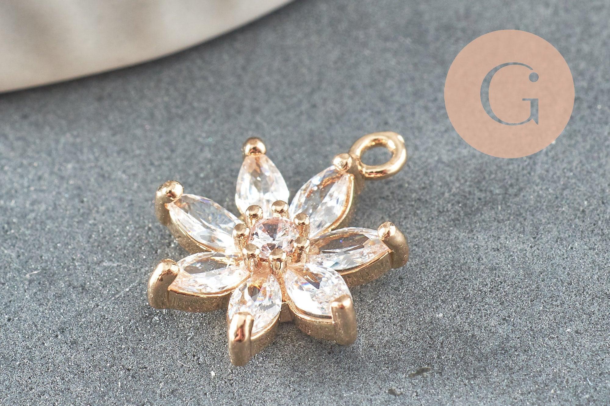 Este colgante en forma de flor de oro de 24 quilates , decorado con circonitas blancas , mide 15 mm y aporta un toque de elegancia y brillo a tus creaciones.