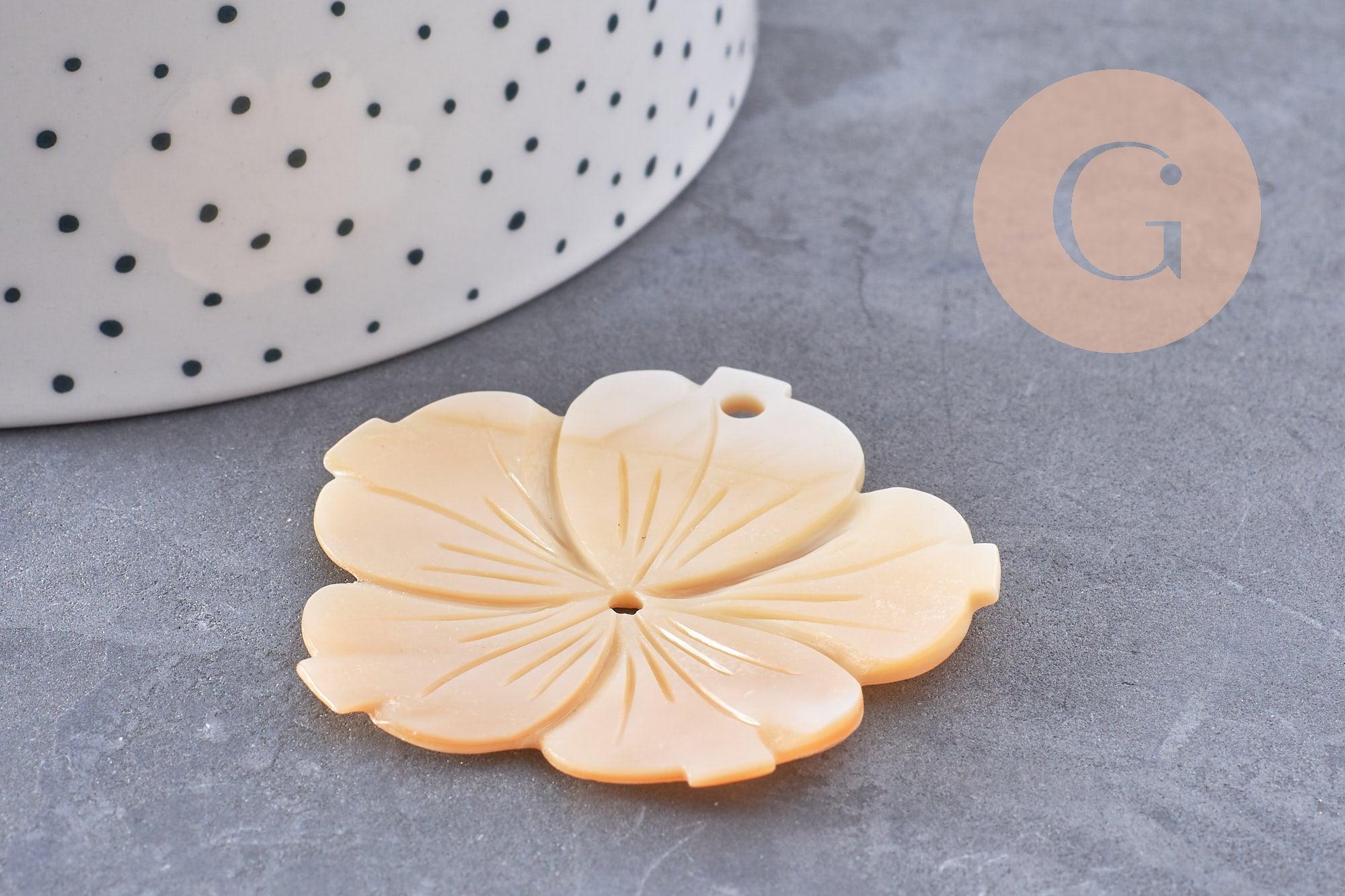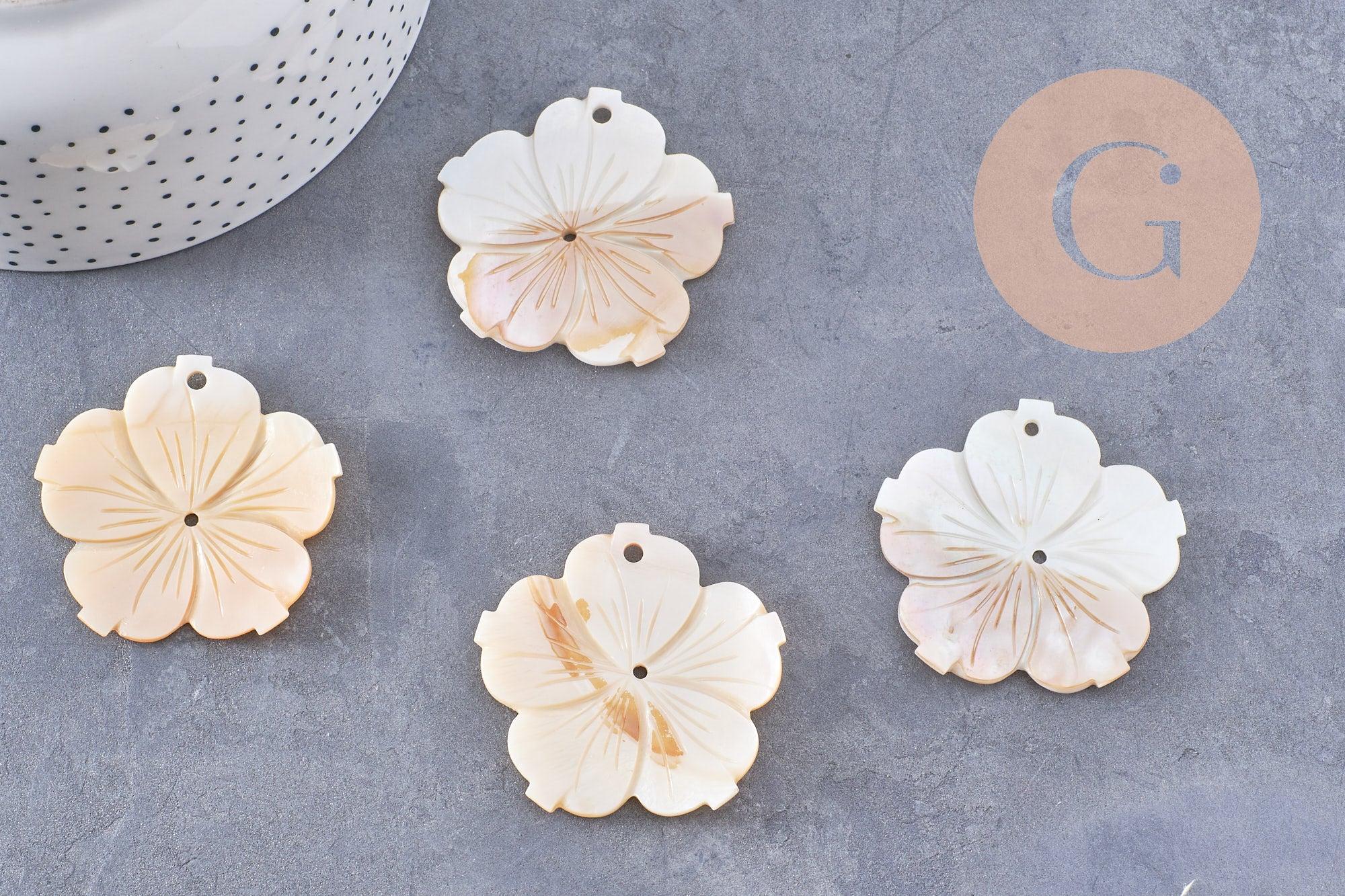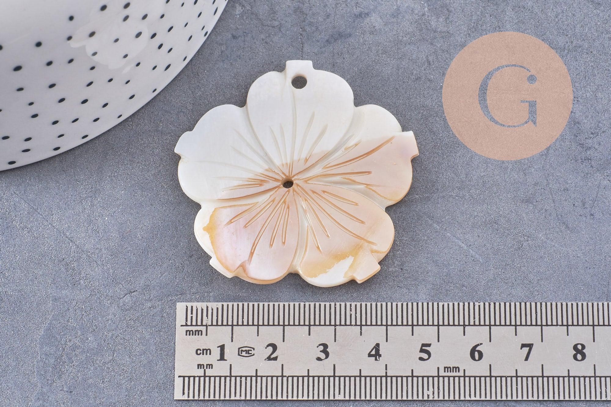 Este colgante de nácar blanco natural , en forma de flor de 48 mm , es una pieza refinada y elegante para tus creaciones de joyería.