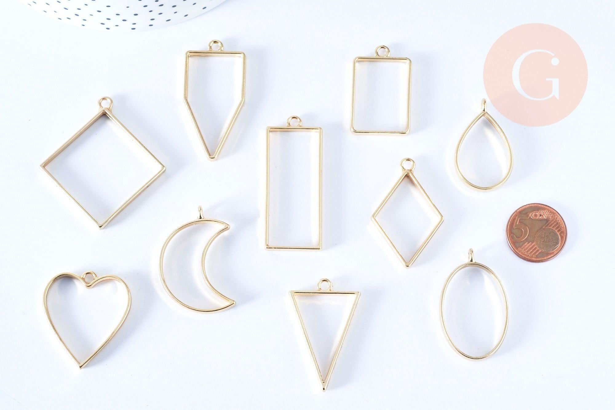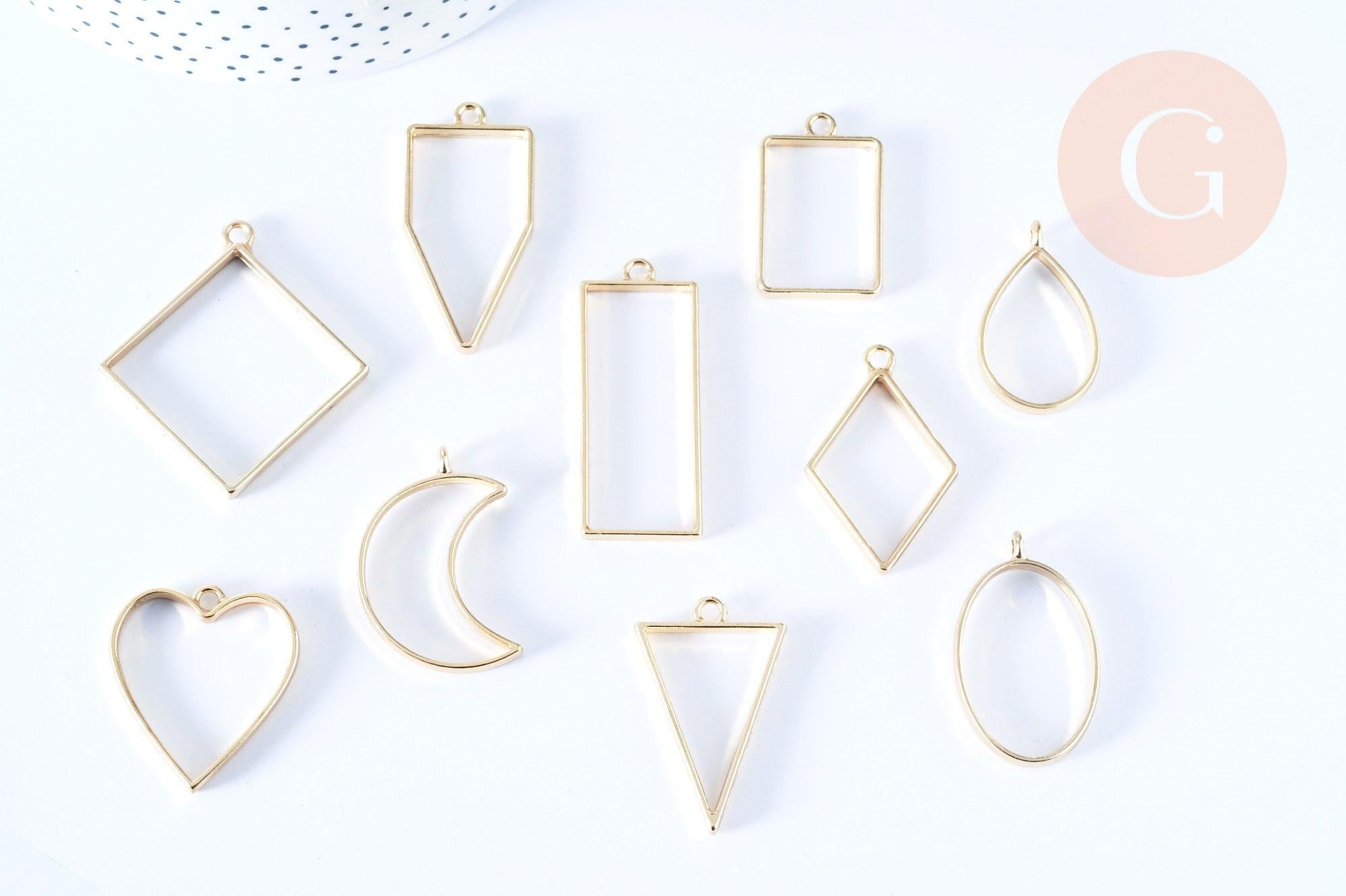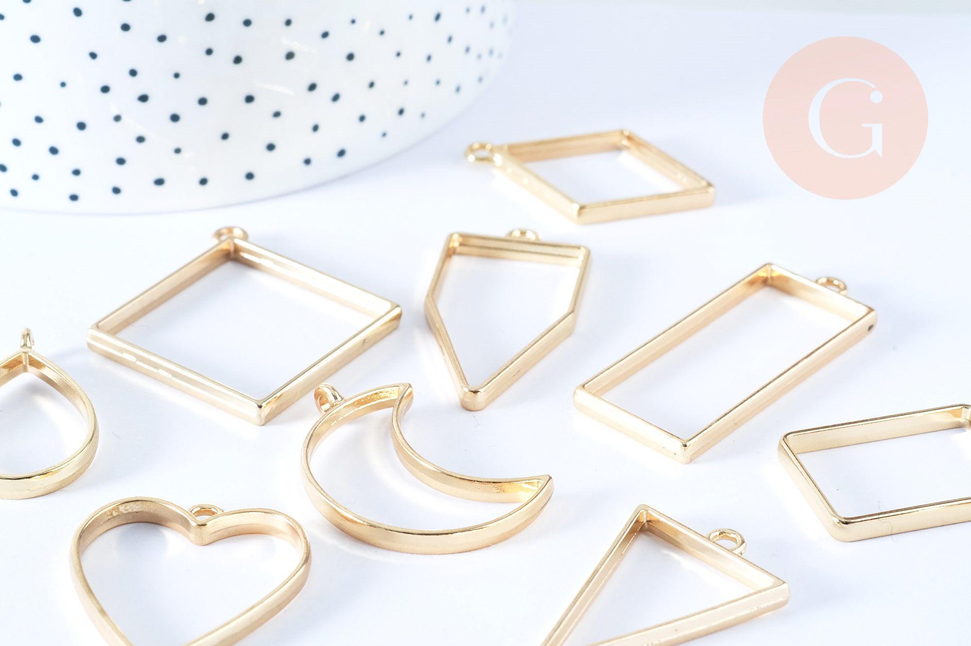 Encantador y discreto, este colgante geométrico de zamac (triángulo, diamante, cuadrado, redondo, ovalado, rectángulo, luna, corazón, gota...) está recubierto con un acabado dorado. Su contorno grueso permite verter resina epoxi sin dificultad. Deja volar tu imaginación y crea tu propia bisutería .