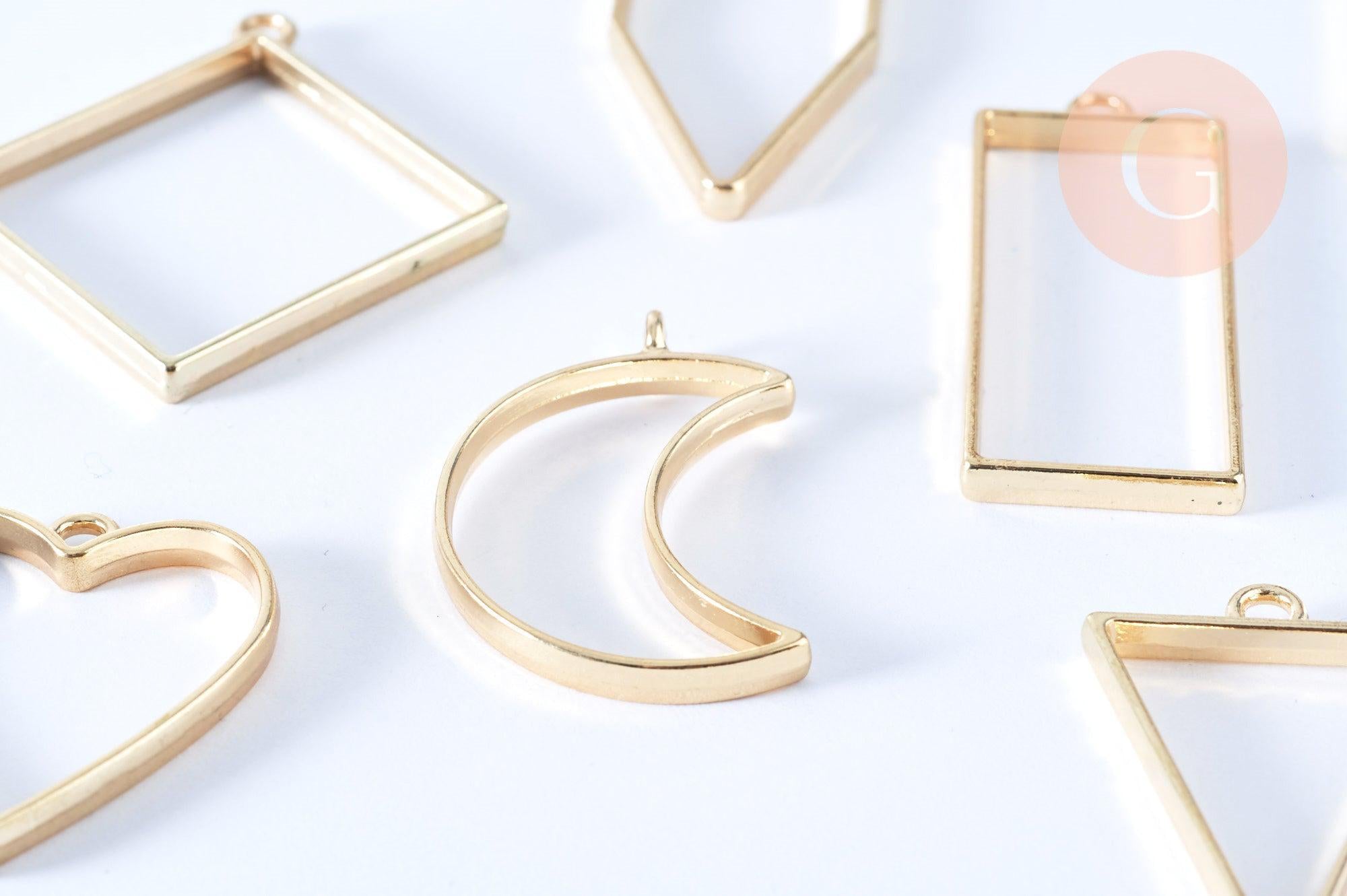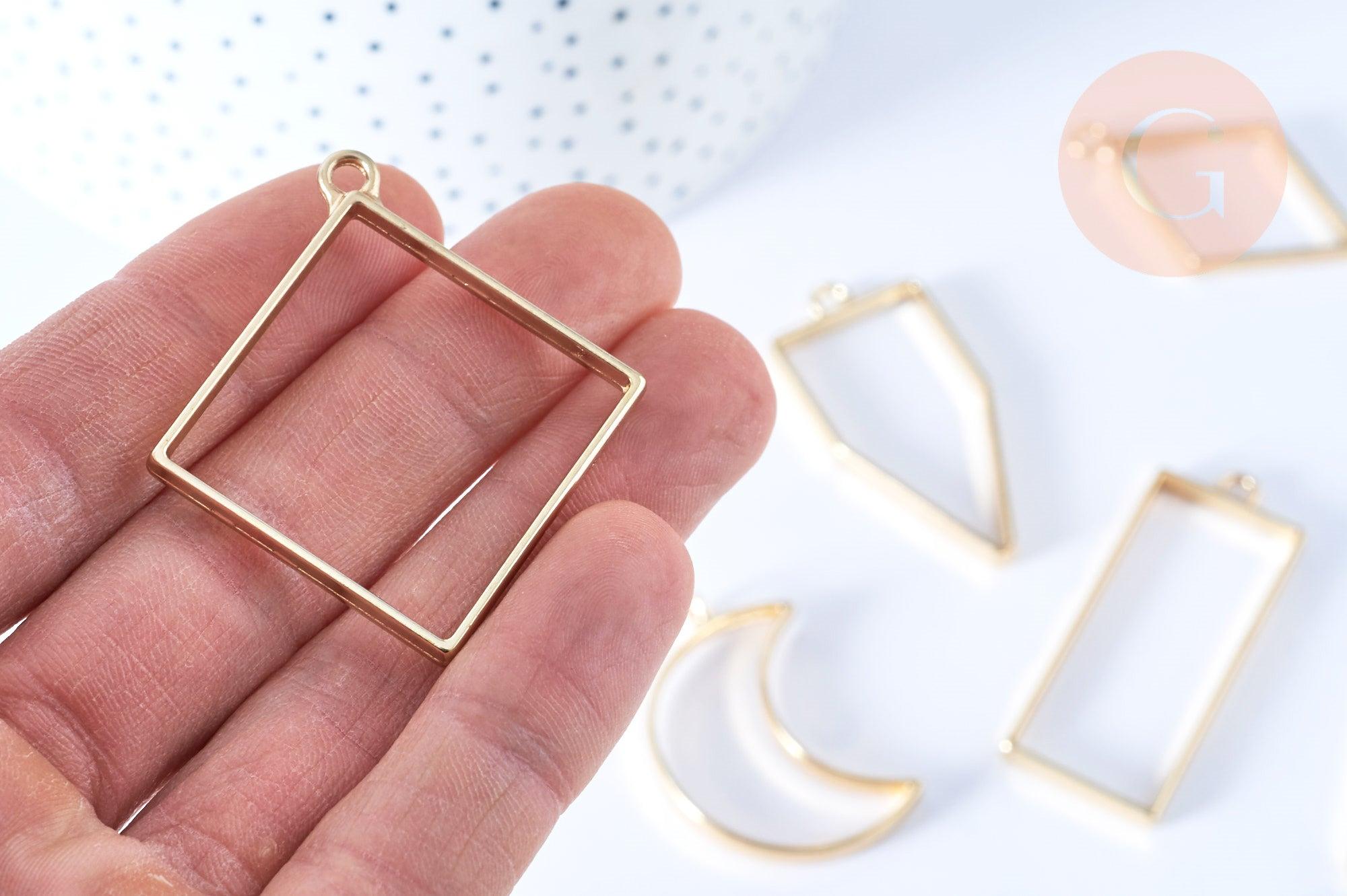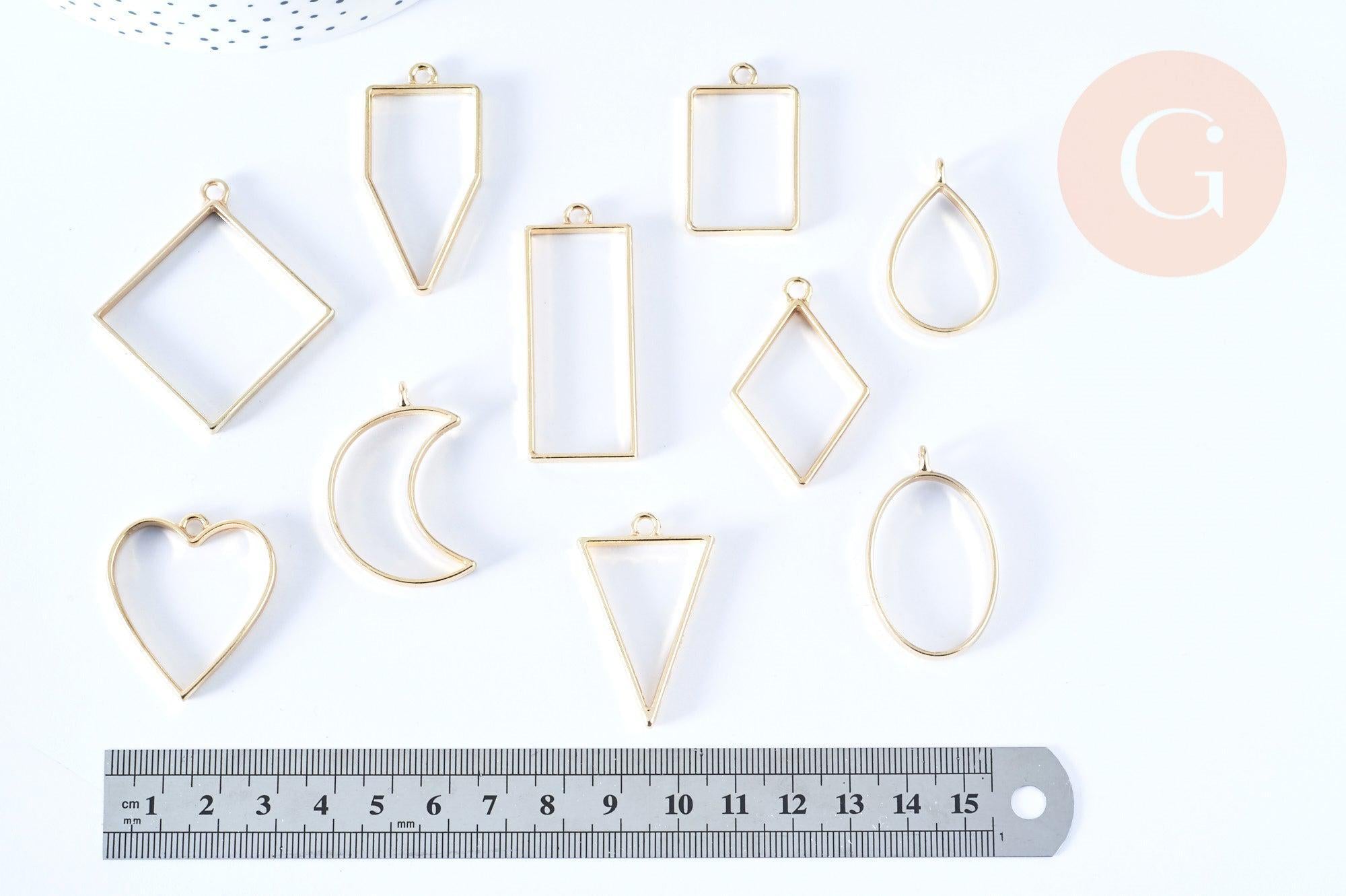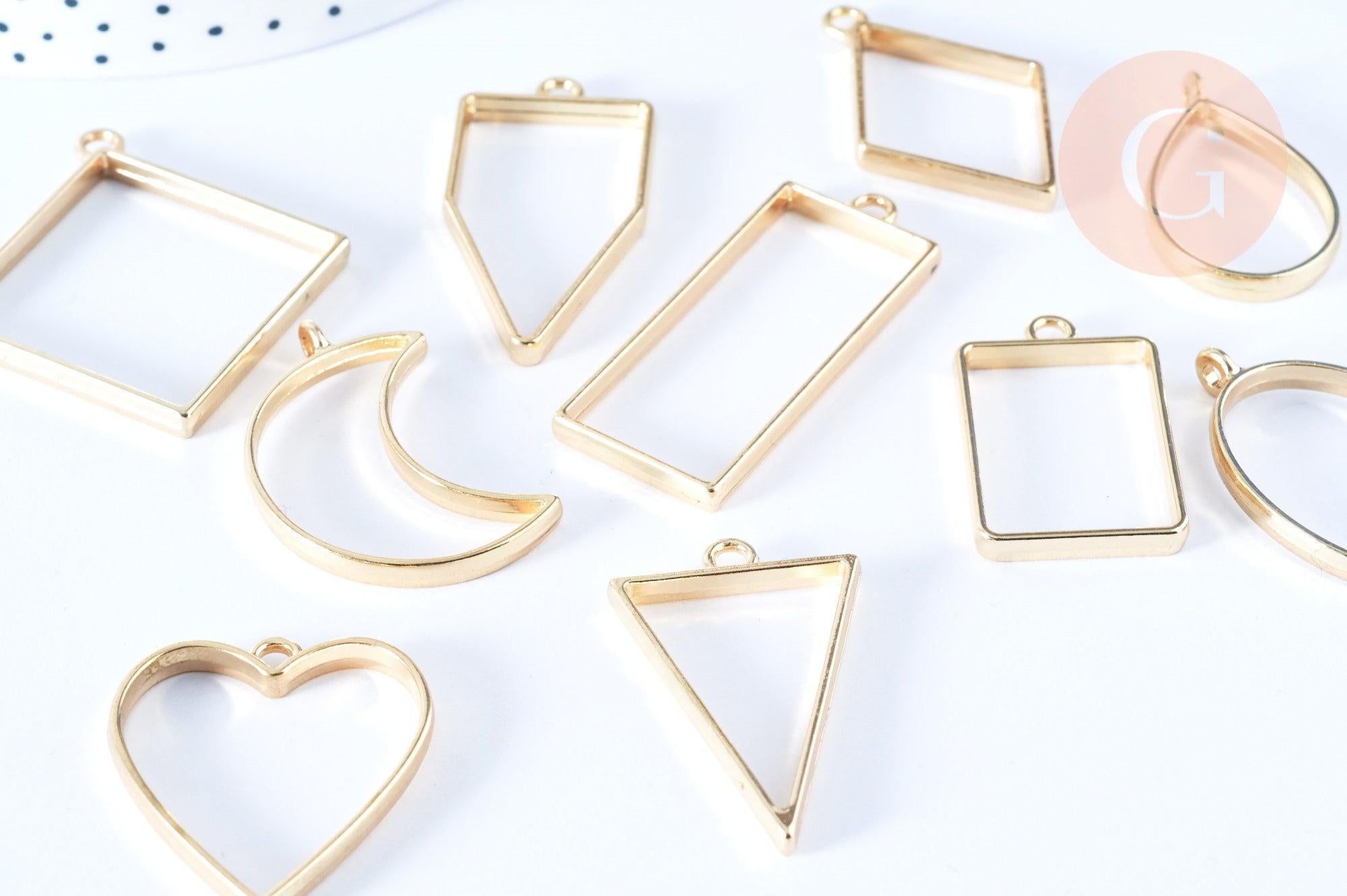 Encantador y discreto, este colgante geométrico de zamac (triángulo, diamante, cuadrado, redondo, ovalado, rectángulo, luna, corazón, gota...) está recubierto con un acabado dorado. Su contorno grueso permite verter resina epoxi sin dificultad. Deja volar tu imaginación y crea tu propia bisutería .