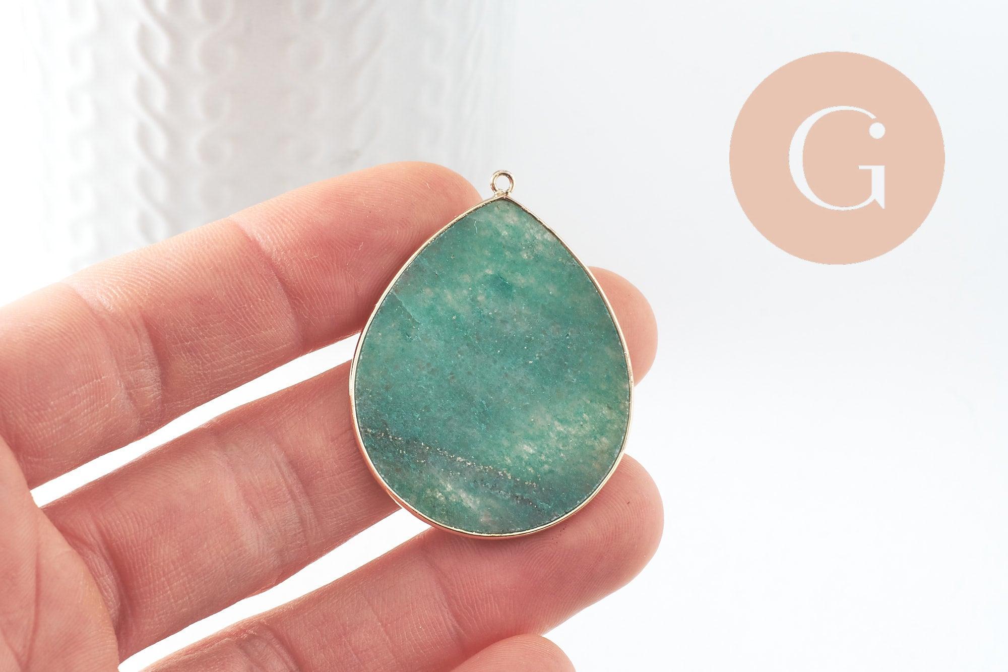 Déjate seducir por este gran colgante en forma de gota, tallado en aventurina verde natural sin teñir y engastado en un marco de latón bañado en oro . Con sus generosas dimensiones y su acabado suave, es ideal para crear joyas bohemias chic o talismanes inspirados en la naturaleza. La piedra, en su estado natural, revela sutiles matices verdes únicos en cada pieza.