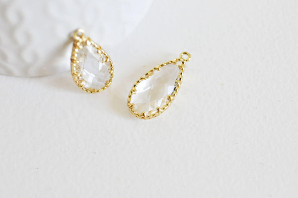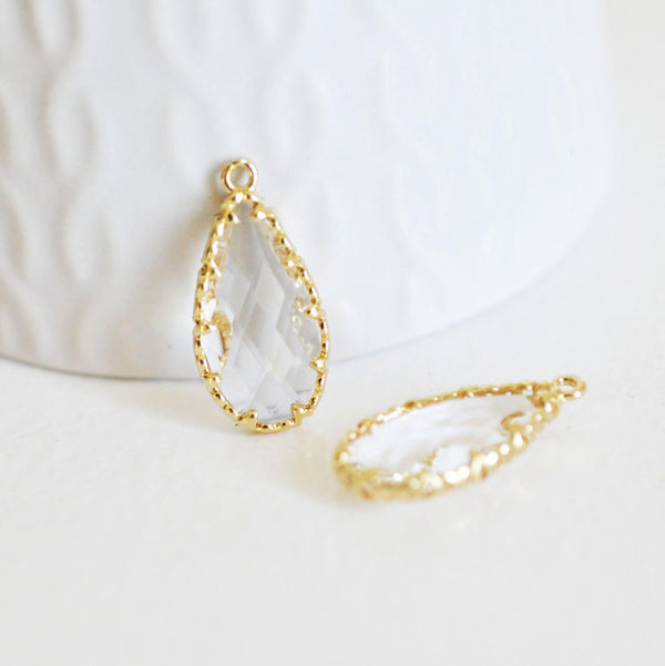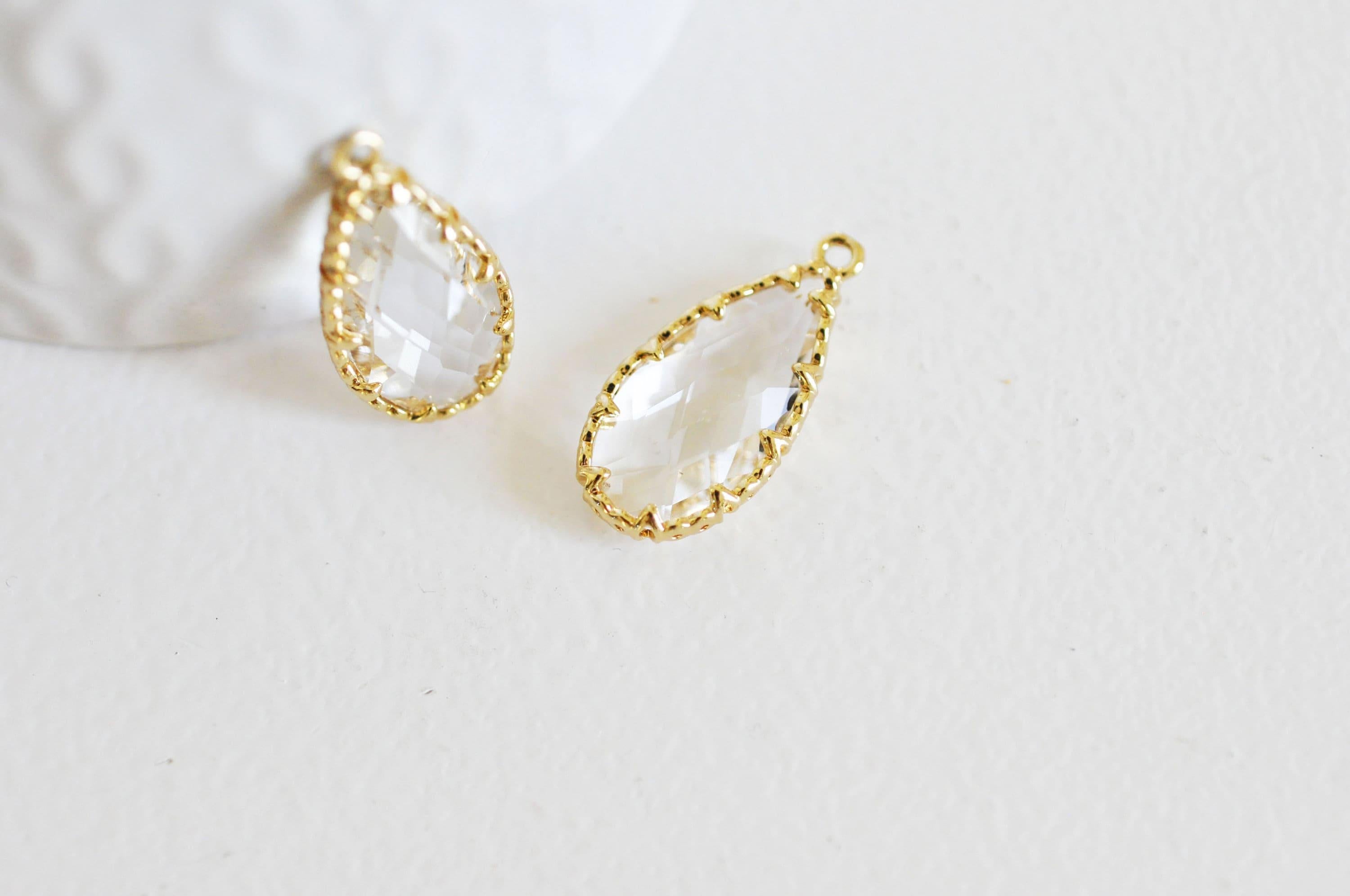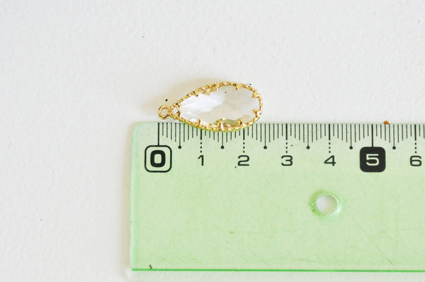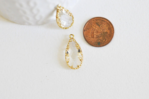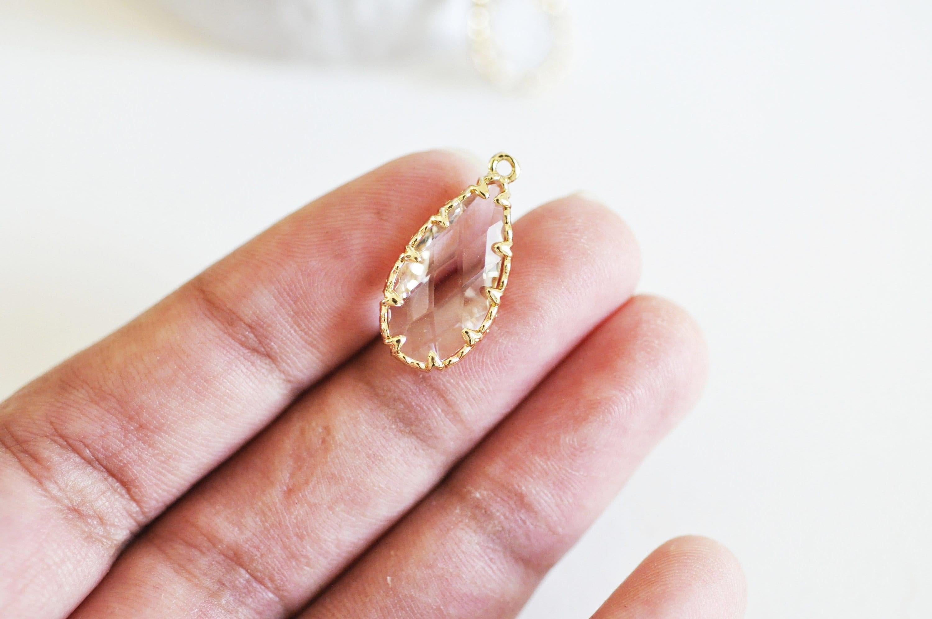 Añade un toque de elegancia atemporal a tus creaciones con este colgante de lágrima de cristal transparente facetado , rodeado de latón chapado en oro.