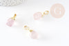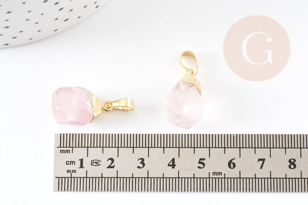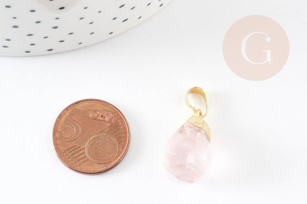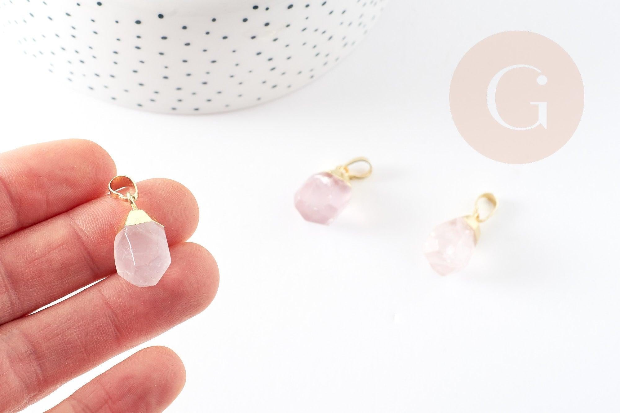 Sublime colgante en forma de gota, tallado en cuarzo rosa natural facetado y montado sobre un elegante asa de latón bañado en oro .