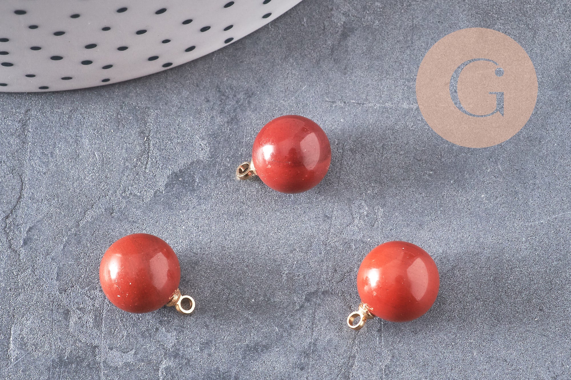 Colgante redondo de jaspe rojo natural sobre soporte de latón bañado en oro, para realizar collares, pendientes o sautoirs de moda.