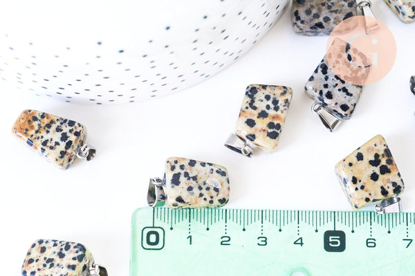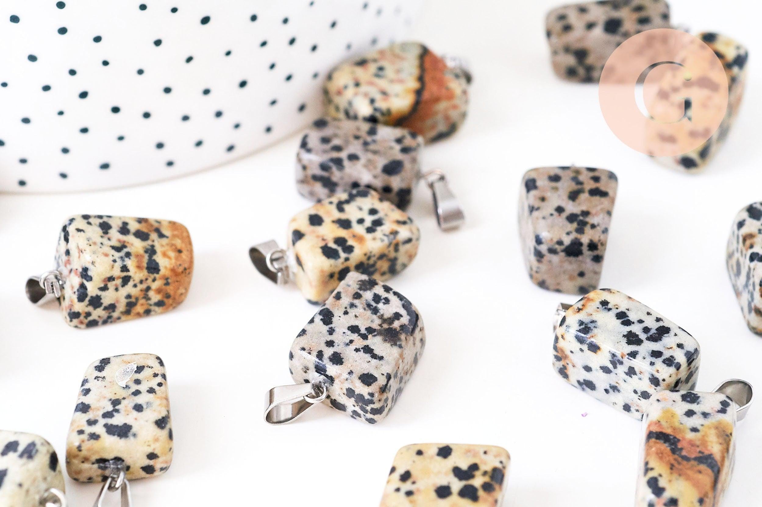 Podrás crear magníficos collares utilizando este colgante de mineral natural de jaspe dálmata sobre un soporte de color platino.