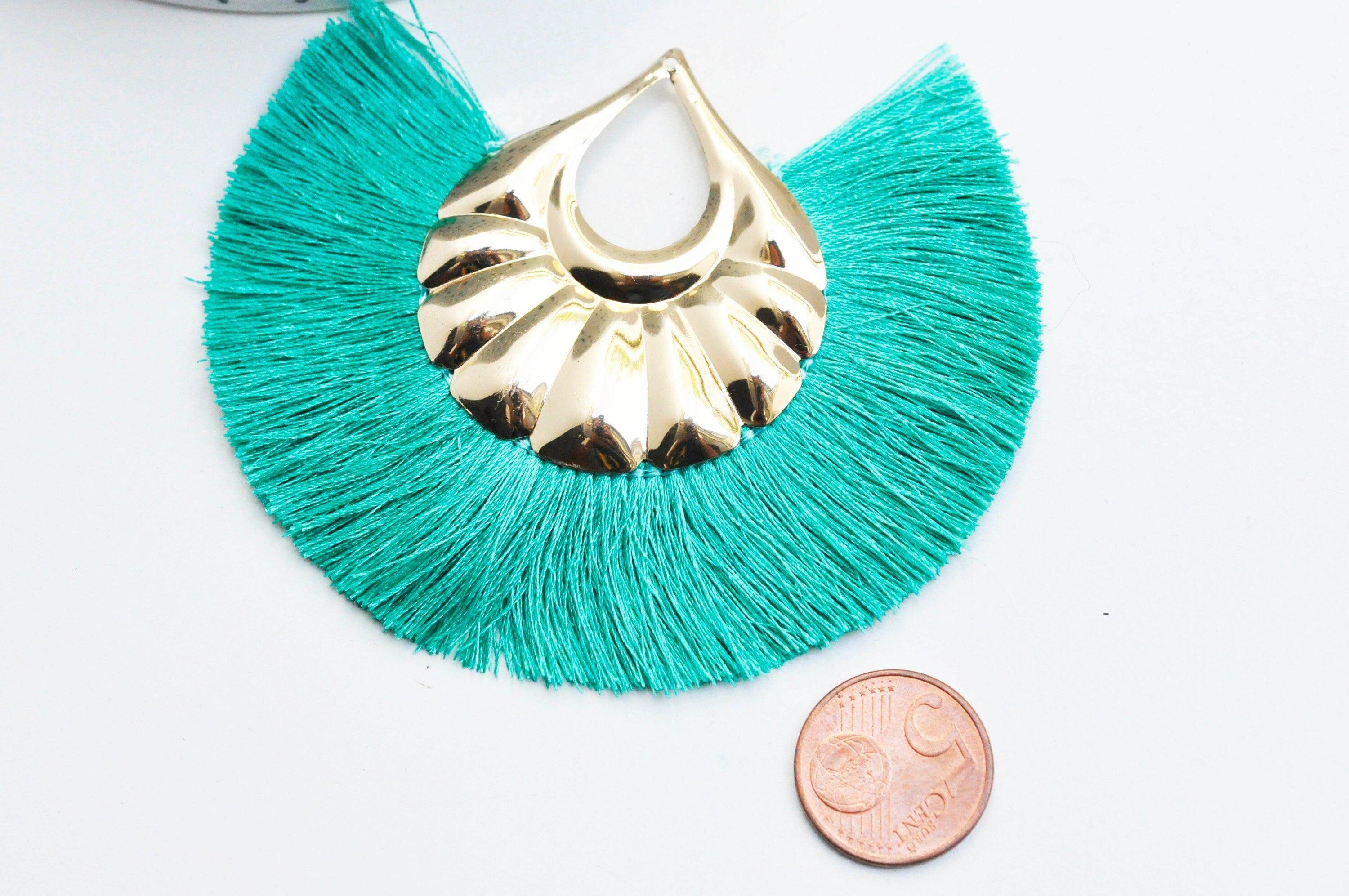 EP - Colgante grande con borla, alambre verde, engaste dorado, colgante de alambre sobre engaste dorado, 85-92 mm, x 2 (G4538)