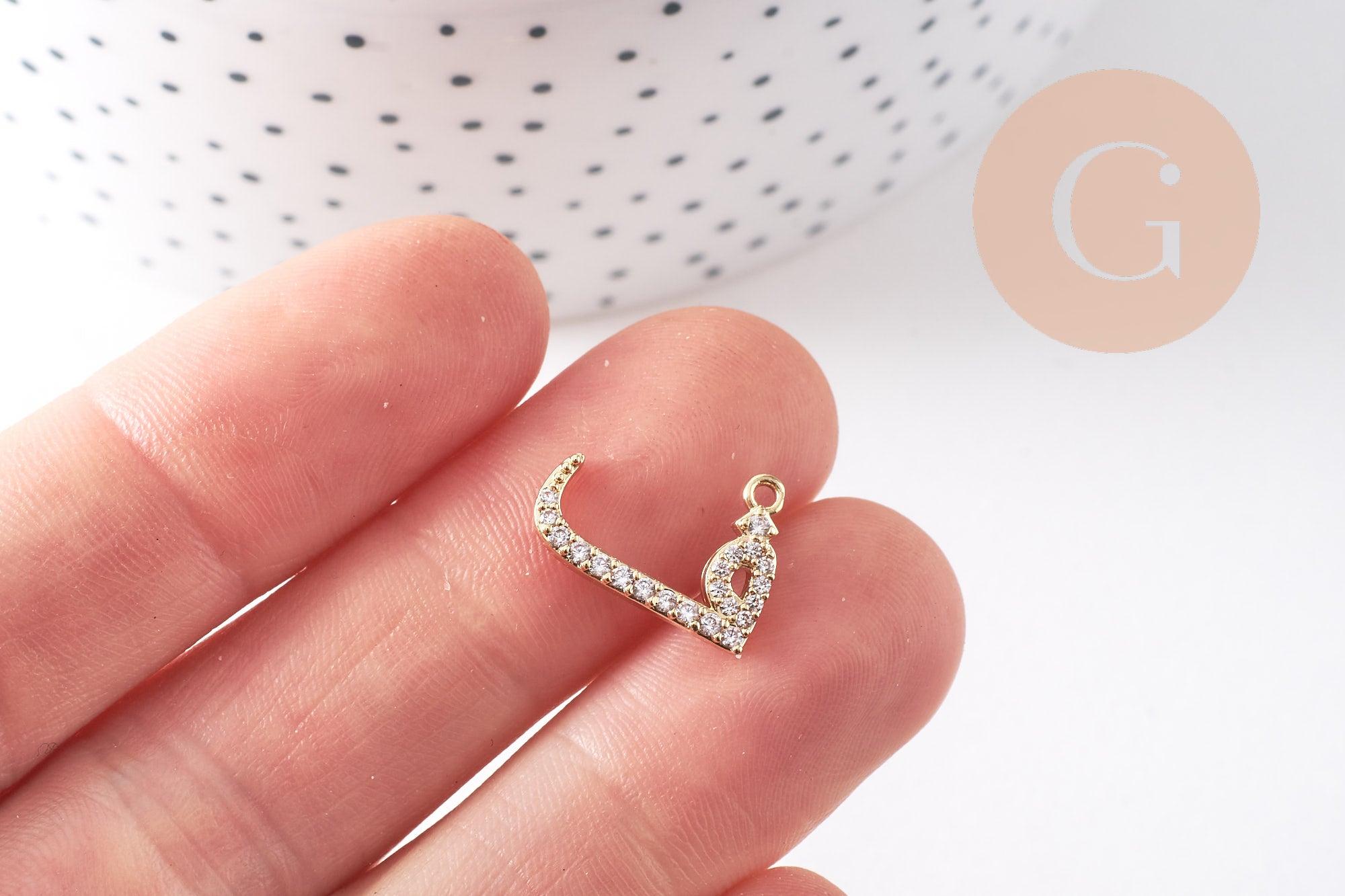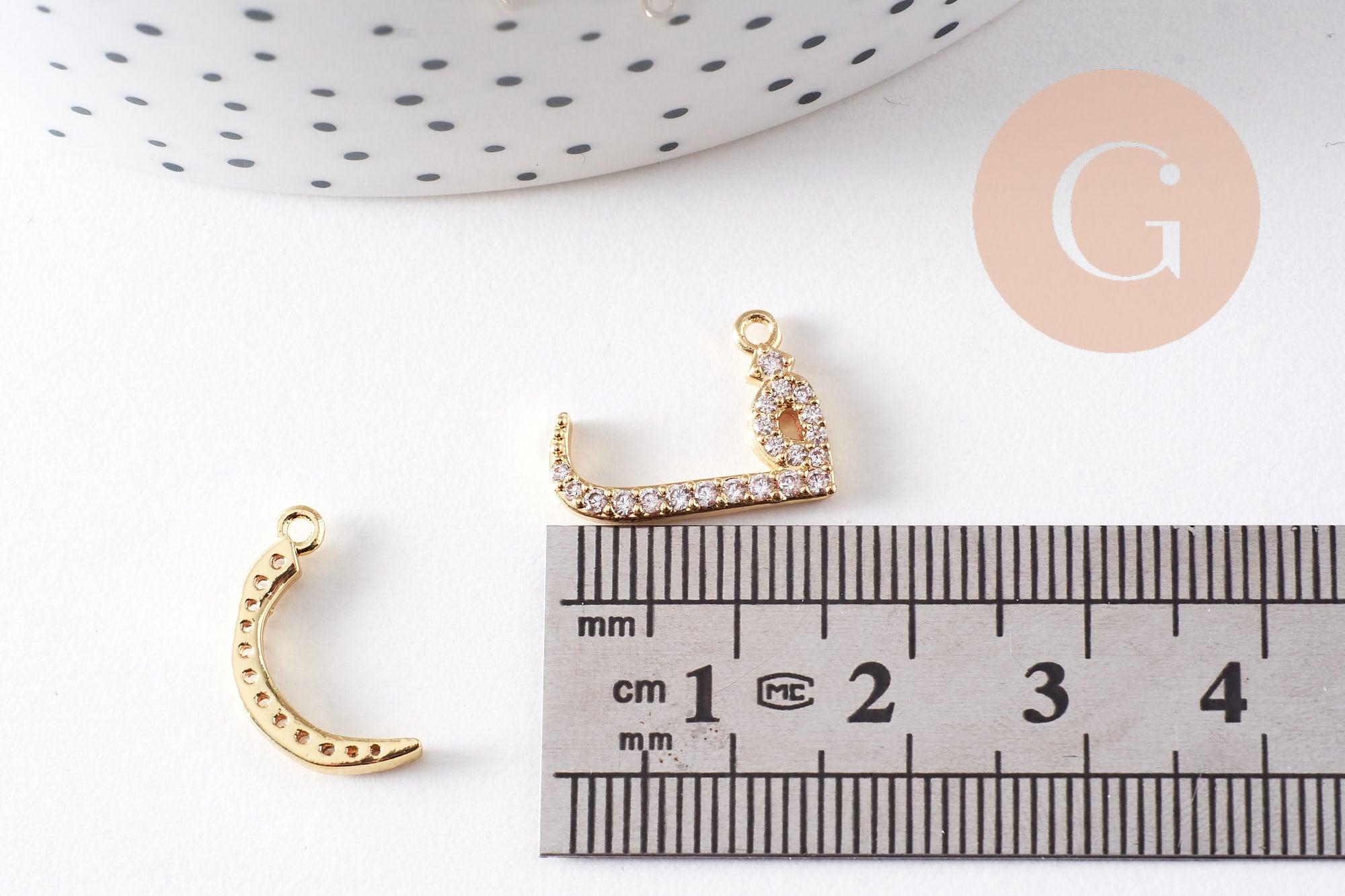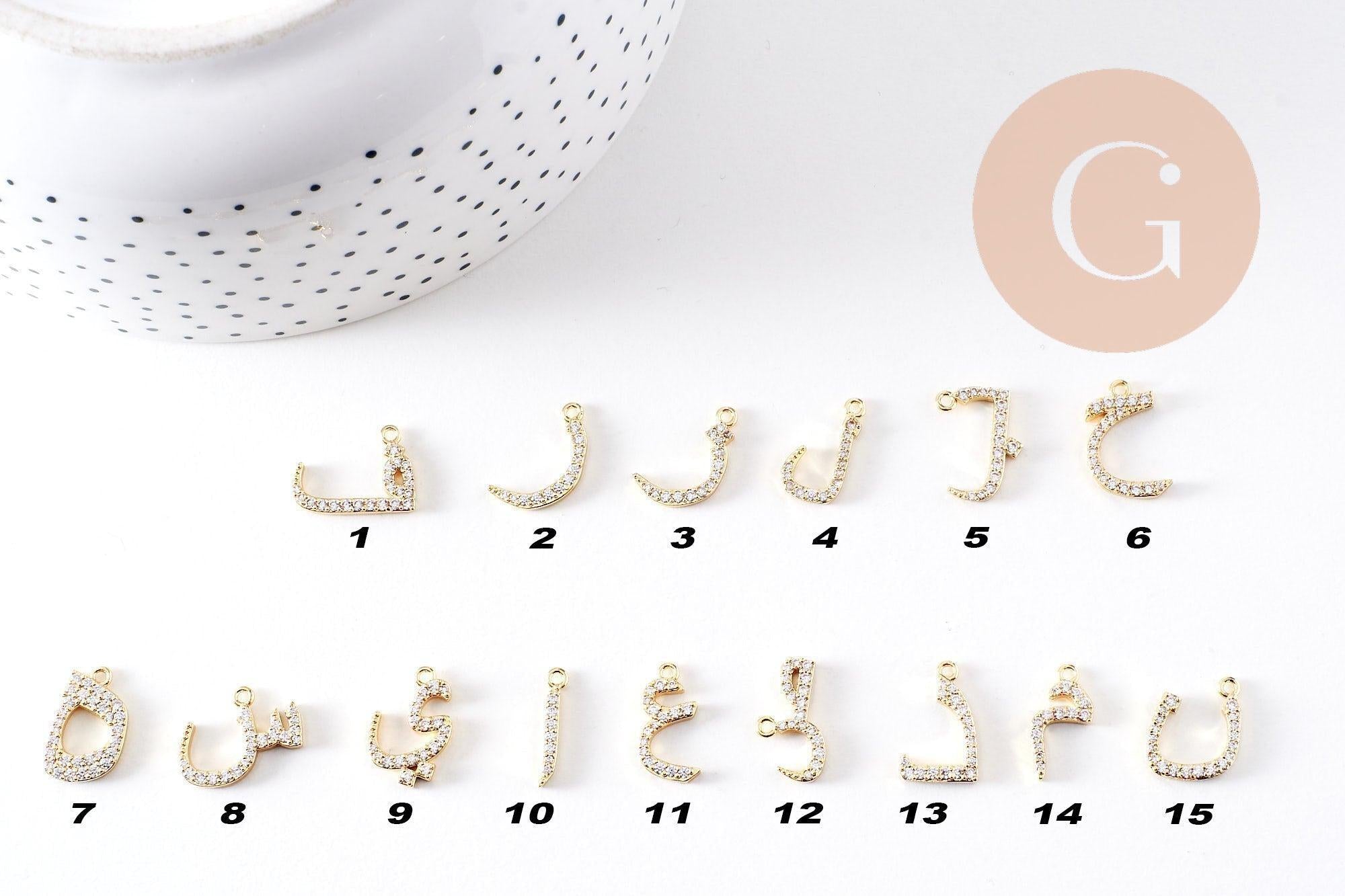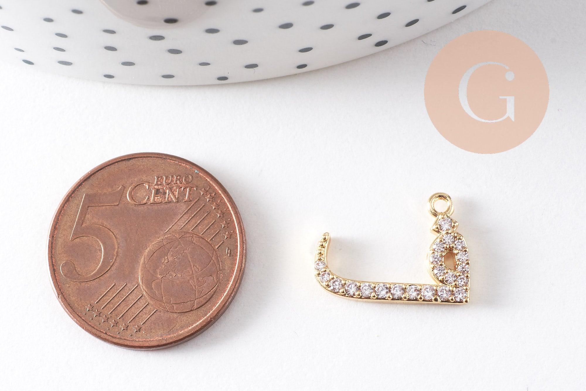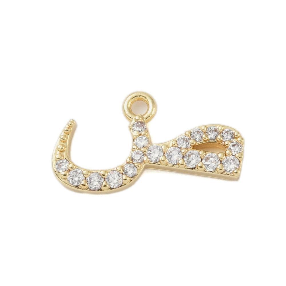 Colgante con letra árabe en latón bañado en oro de 18K decorado con cristales blancos , perfecto para personalizar tus creaciones DIY. Su diseño refinado y vibrante dará un toque elegante y único a tus collares, pulseras y joyas de la suerte.