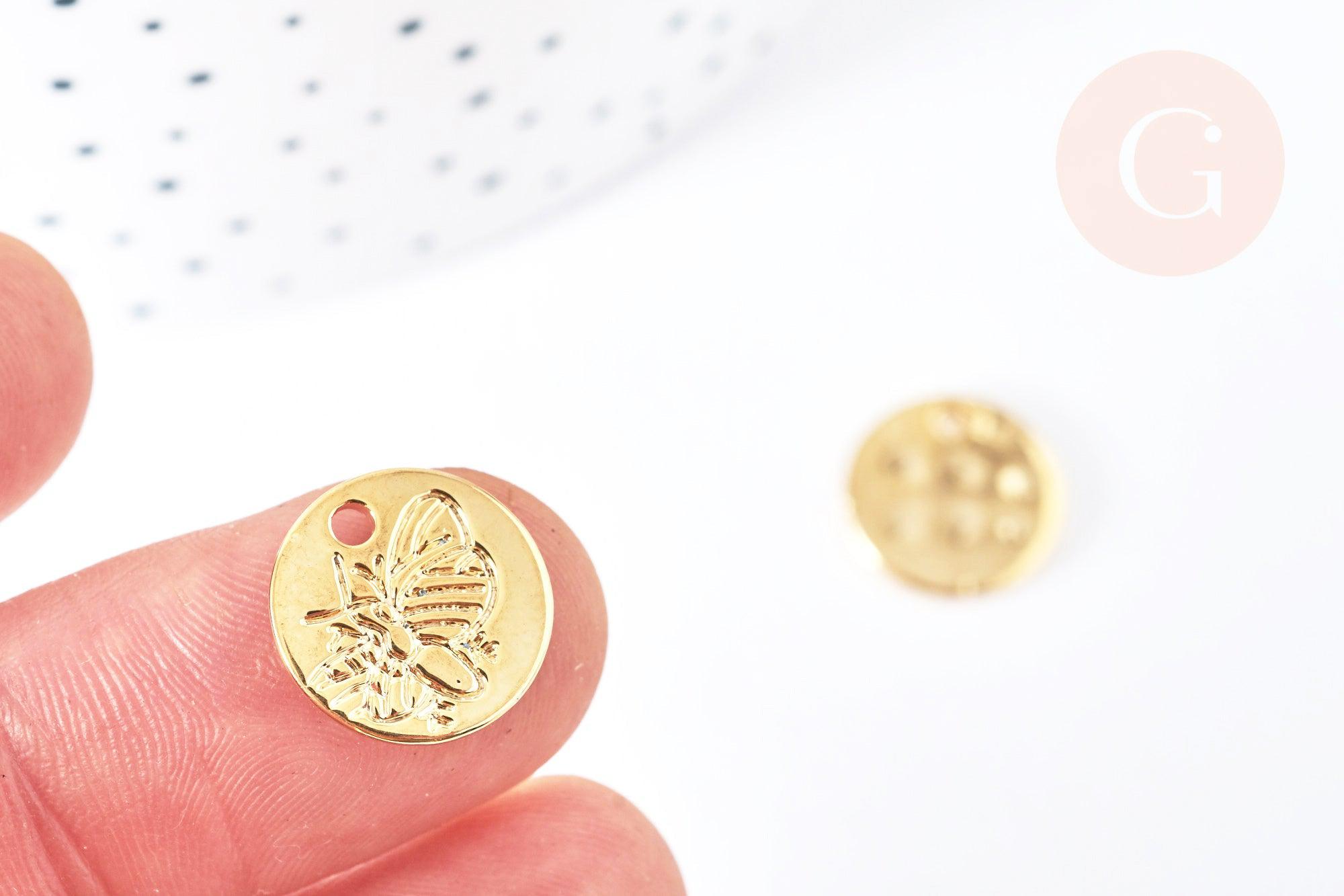 Pendentif médaille abeille zircon laiton doré 18K 13mm, fournitures bijoux, breloque laiton doré, x1 G7121