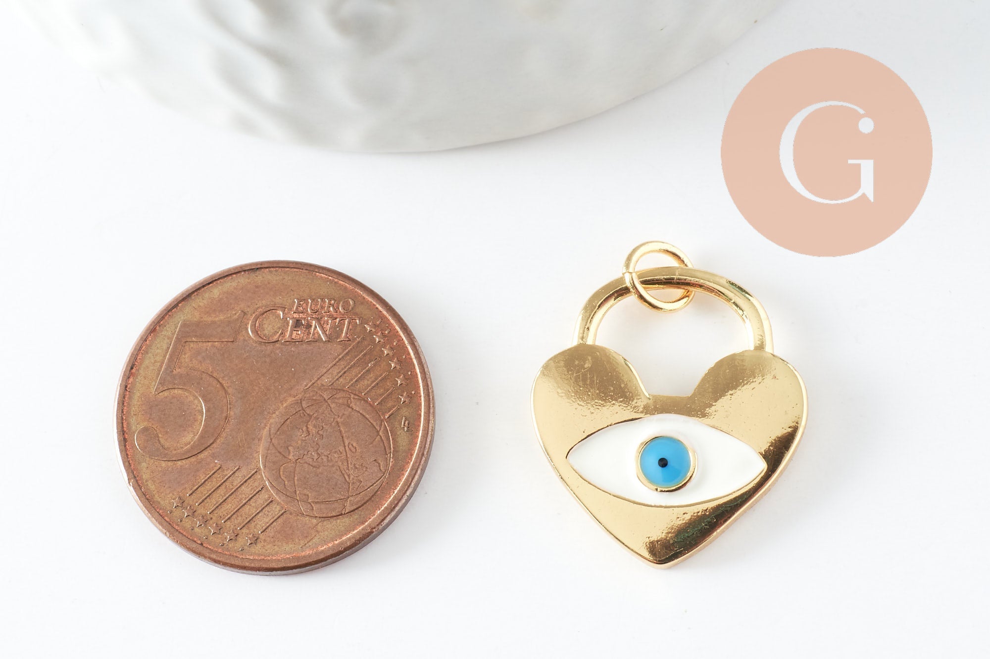 Colgante candado corazón con ojo de esmalte blanco en latón bañado en oro de 16K, colgante love brass para creación de joyas, 20mm, x1 (G4674)