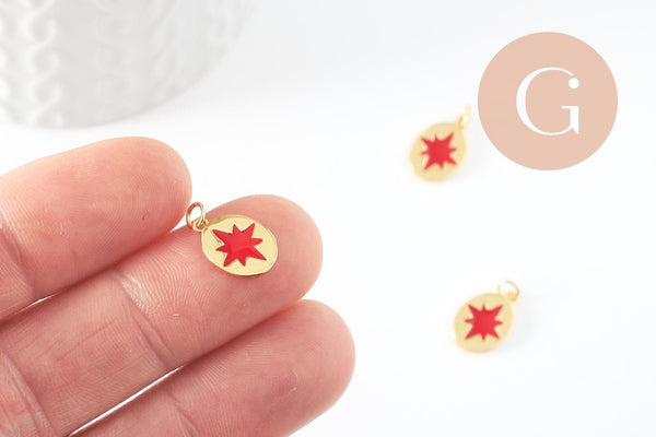 Un pequeño colgante medalla con estrella esmaltada en rojo y latón bañado en oro de 20K, accesorios para tener siempre en tu caja de herramientas para realizar todas tus joyas.