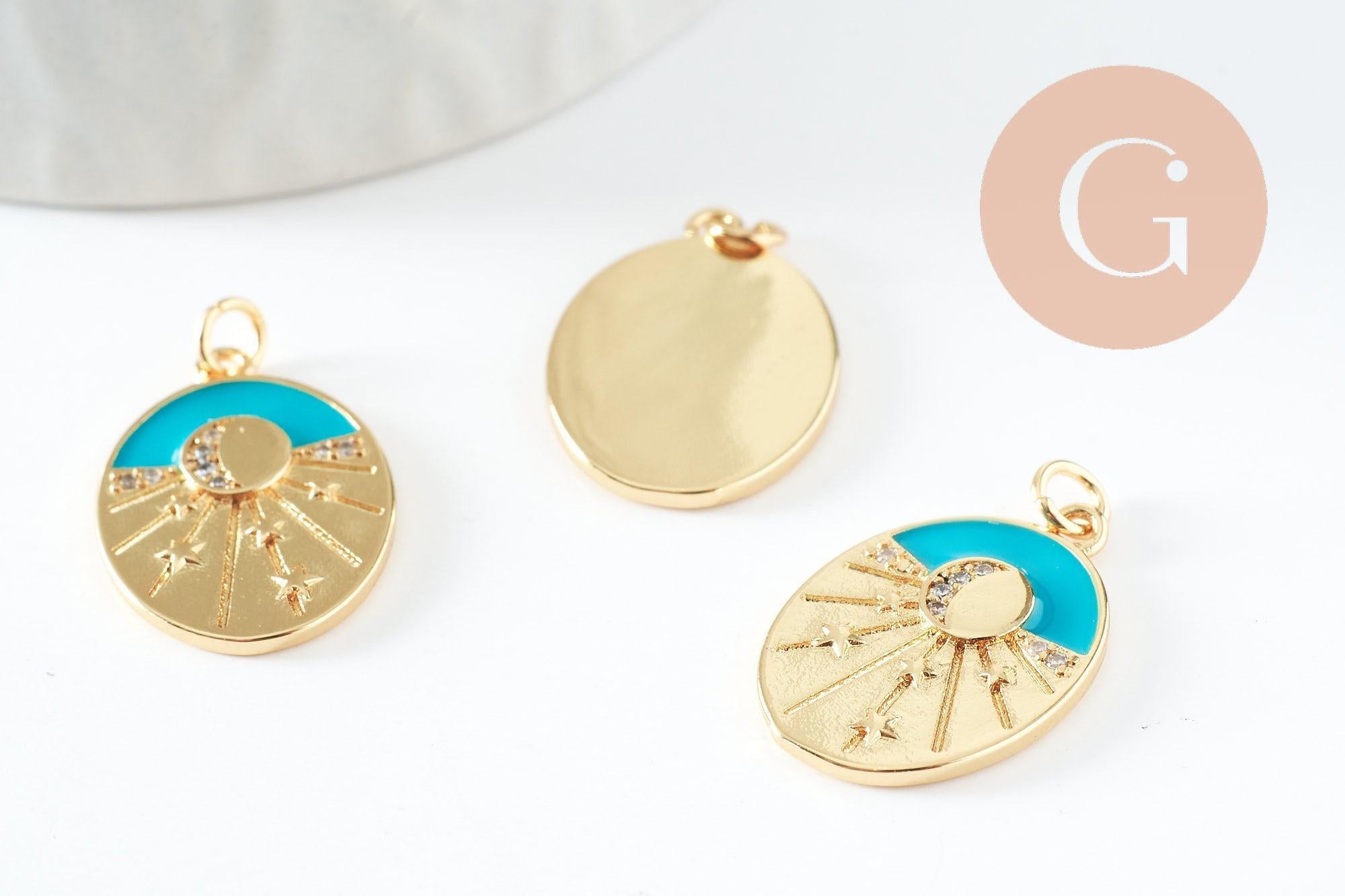 Colgante ovalado de medalla de latón dorado con esmalte turquesa y luna solar, colgante de latón esmaltado, sin níquel, 22 mm, cada uno