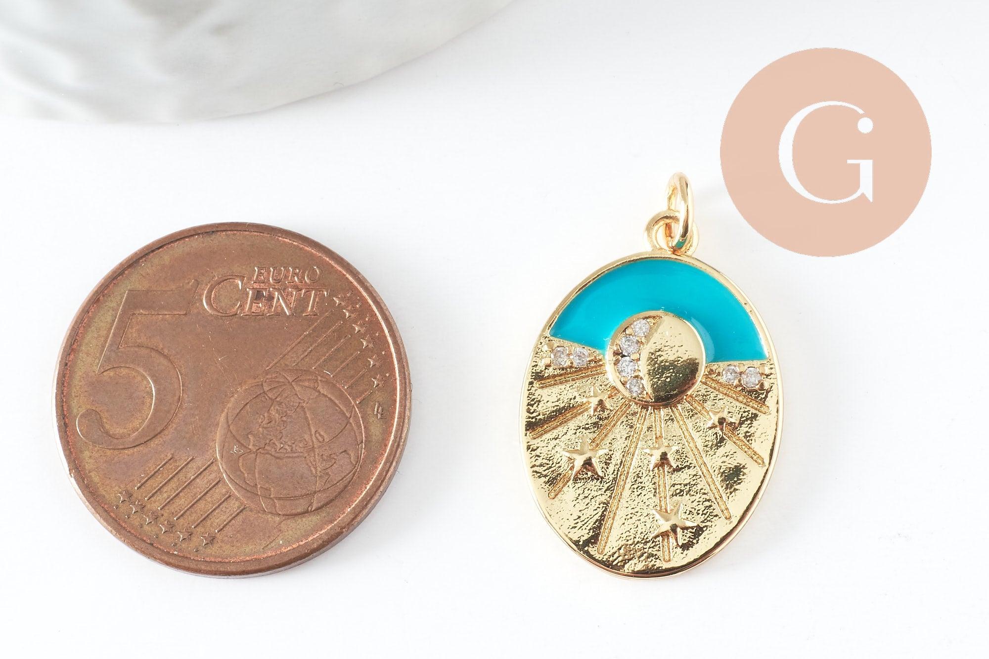 Colgante ovalado de medalla de latón dorado con esmalte turquesa y luna sol, colgante de latón esmaltado, sin níquel, 22 mm, x1 G4735