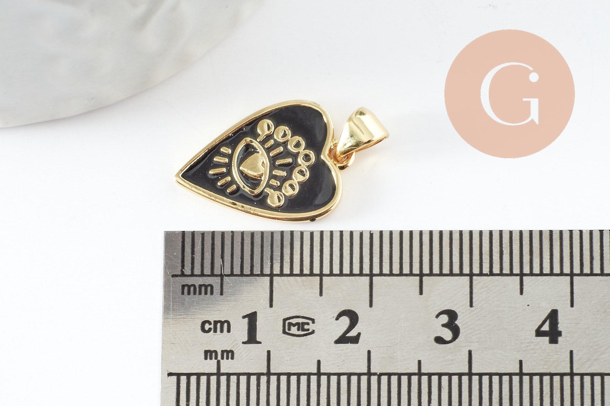 Colgante de medalla de corazón redondo de esmalte negro de latón bañado en oro de 18 quilates, colgante de latón Love para creación de joyas, 18,5 mm, x1 (G5325)
