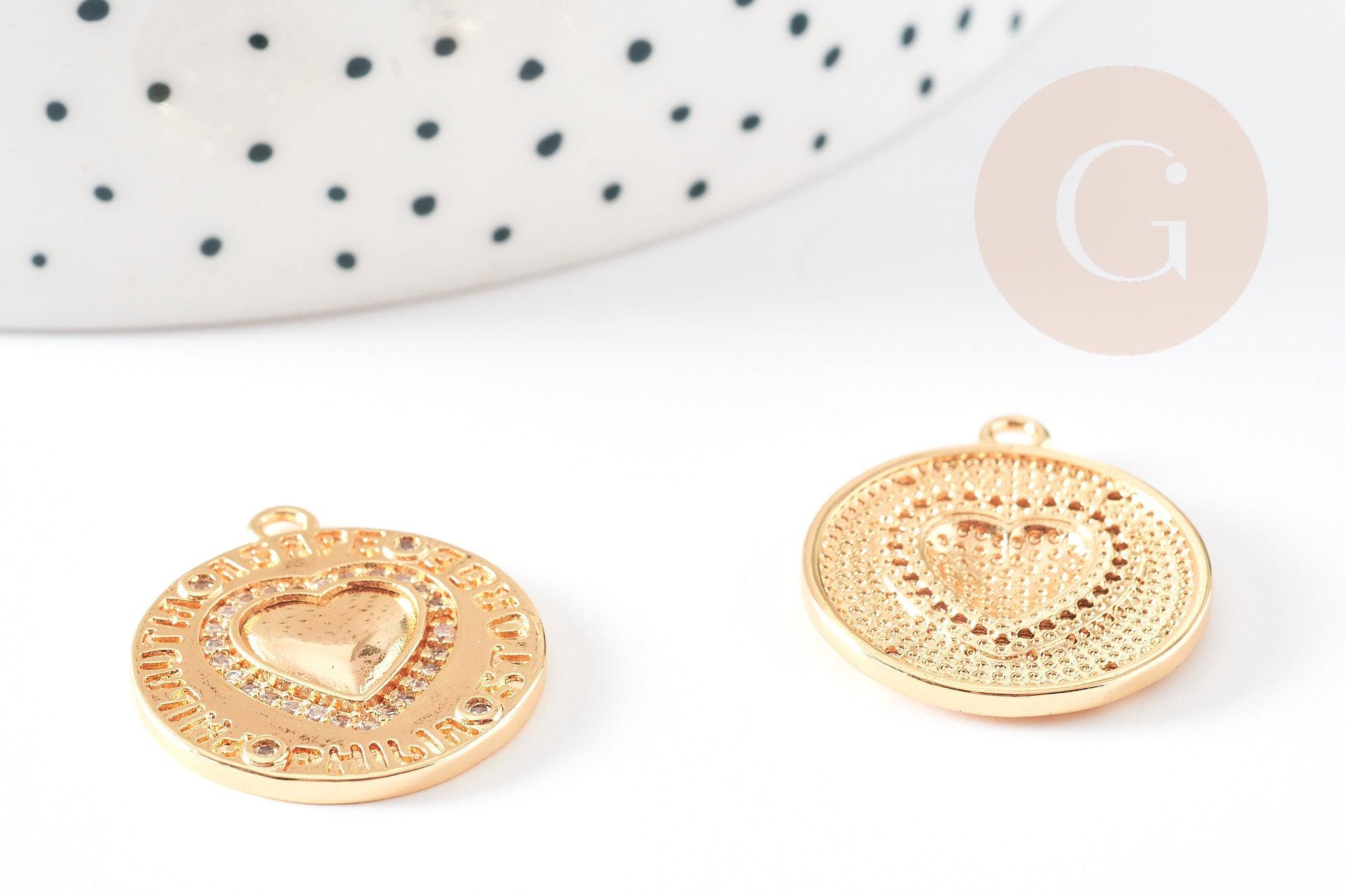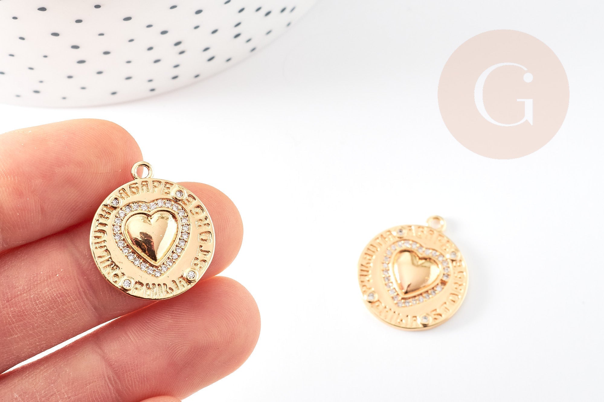 Aporta un toque de elegancia y sentimentalismo a tus creaciones con nuestro colgante de medalla redonda , que presenta un corazón sobre latón dorado y adornado con circonitas brillantes.
