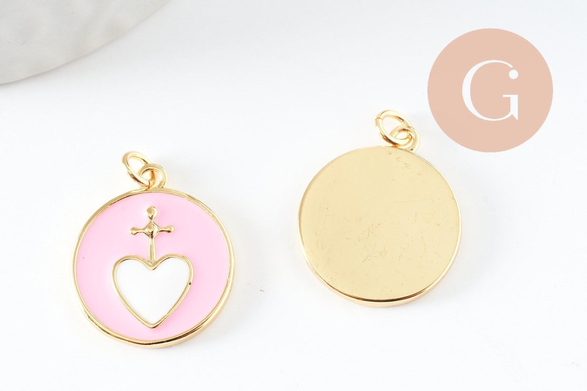 Añade un toque de suavidad y elegancia a tus creaciones con este colgante de medalla redonda decorado con un corazón de esmalte rosa . Fabricado en latón bañado en oro, este colgante es ideal para joyería femenina y delicada.
