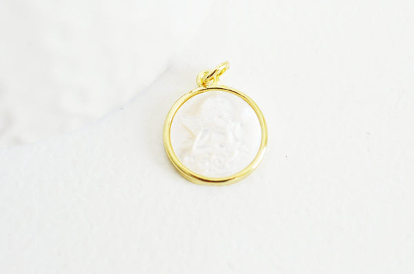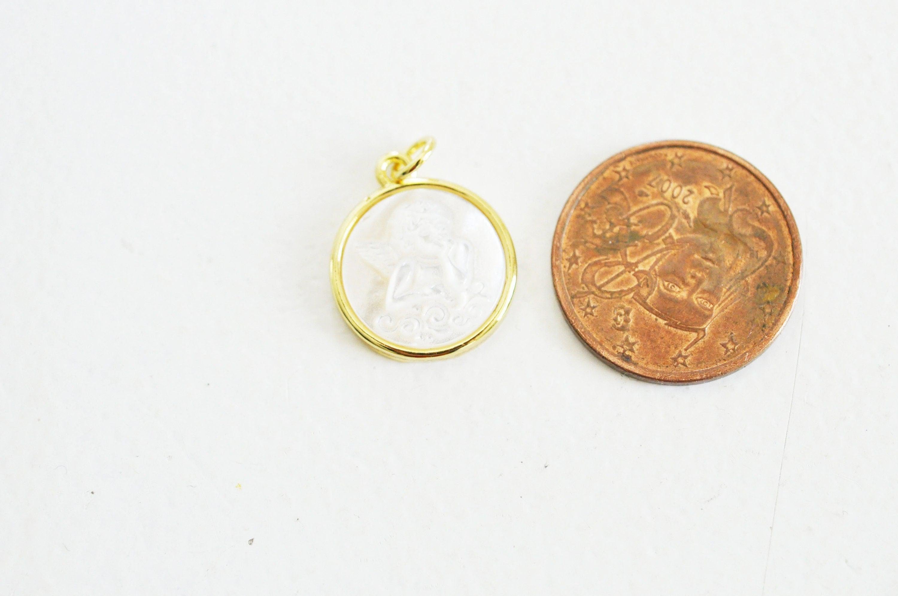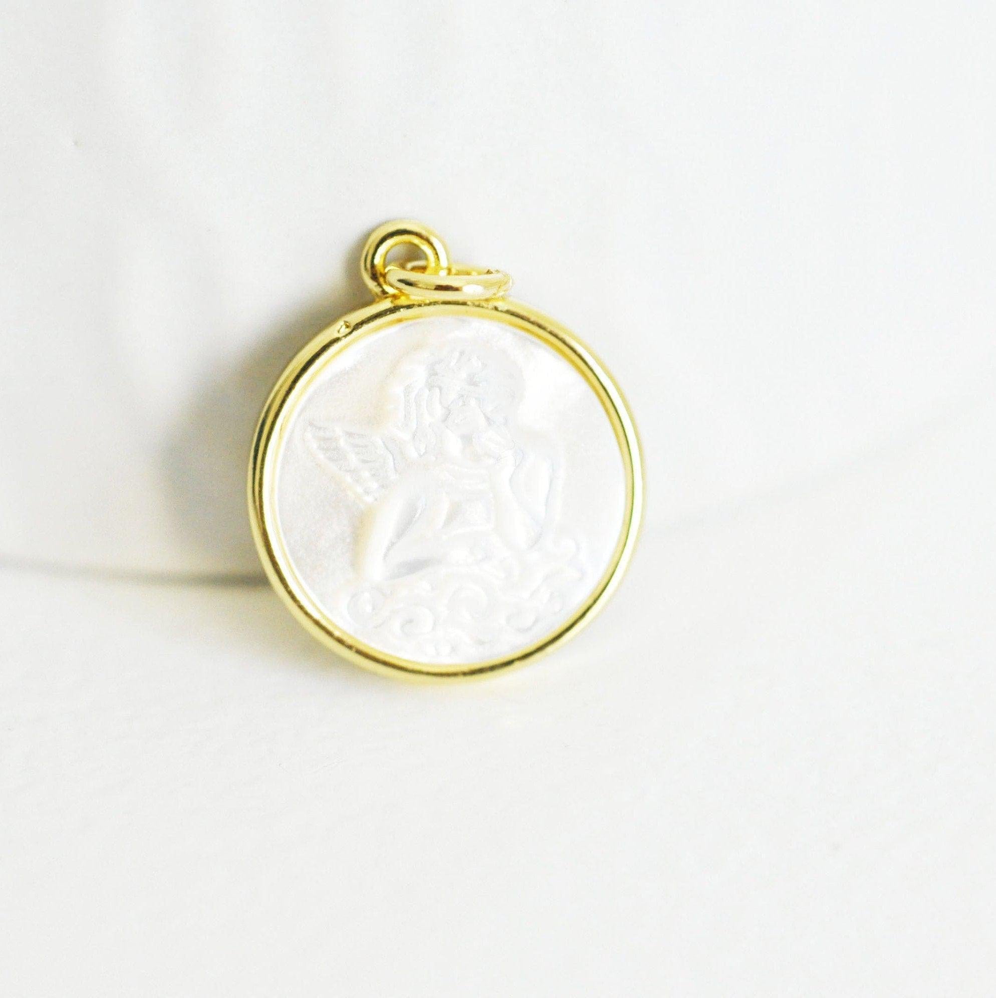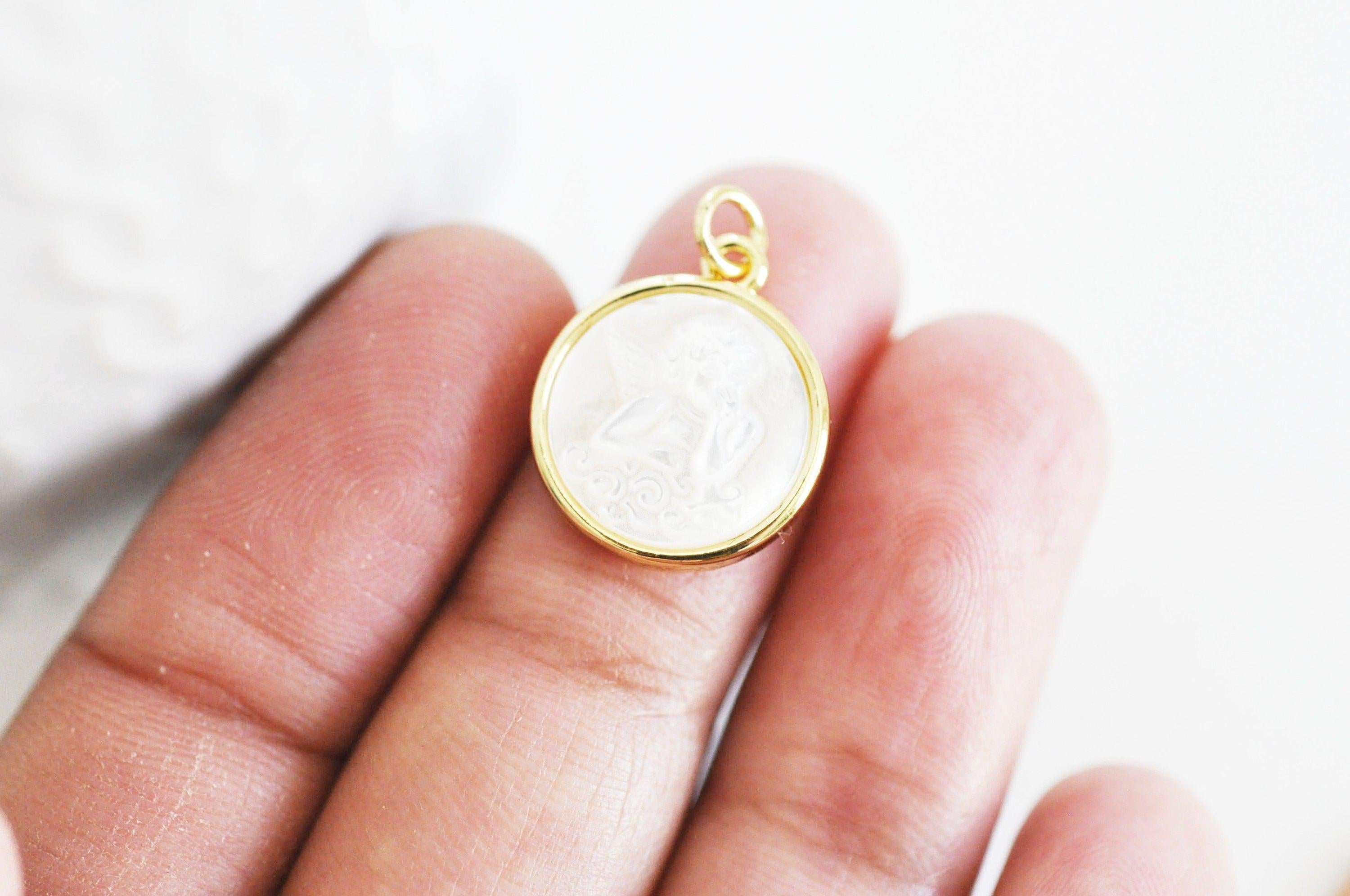 Mejore sus creaciones de bricolaje con este colgante de medalla redonda de latón dorado adornado con un ángel delicadamente grabado y nácar natural .