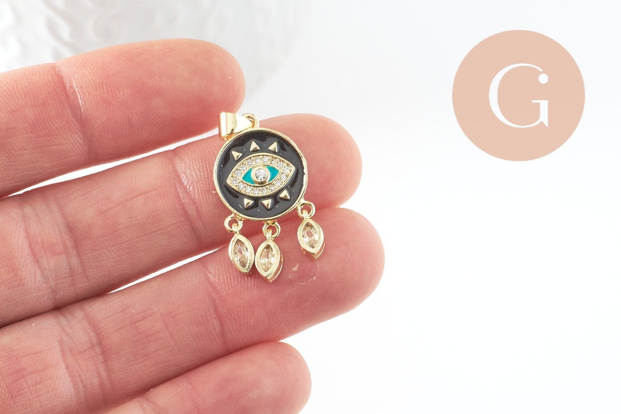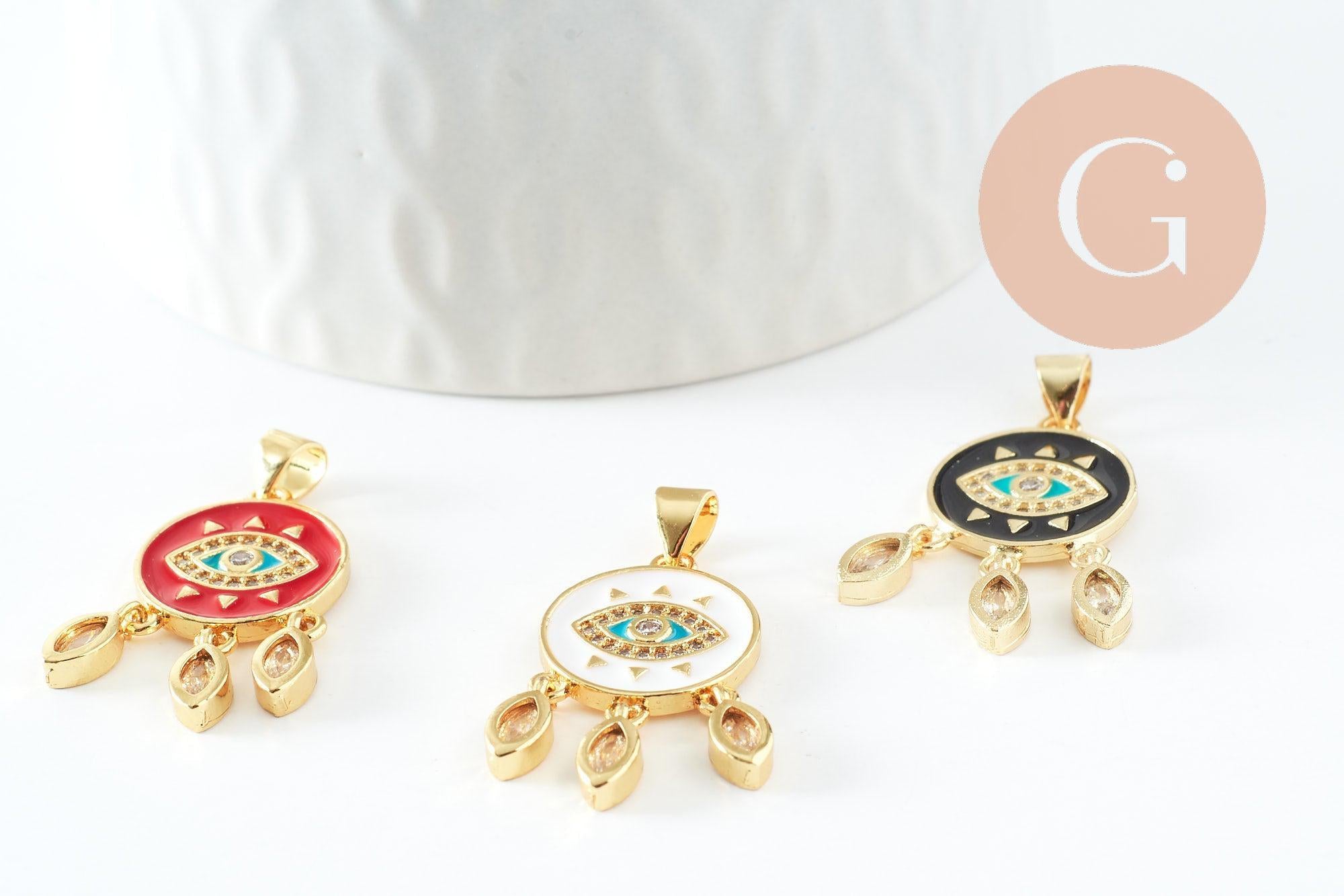Colgante de medalla redonda con ojo de esmalte rojo de latón bañado en oro de 18 quilates y cristal de circonita, colgante de latón love para creación de joyas, 28 mm, x1 (G3579)